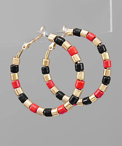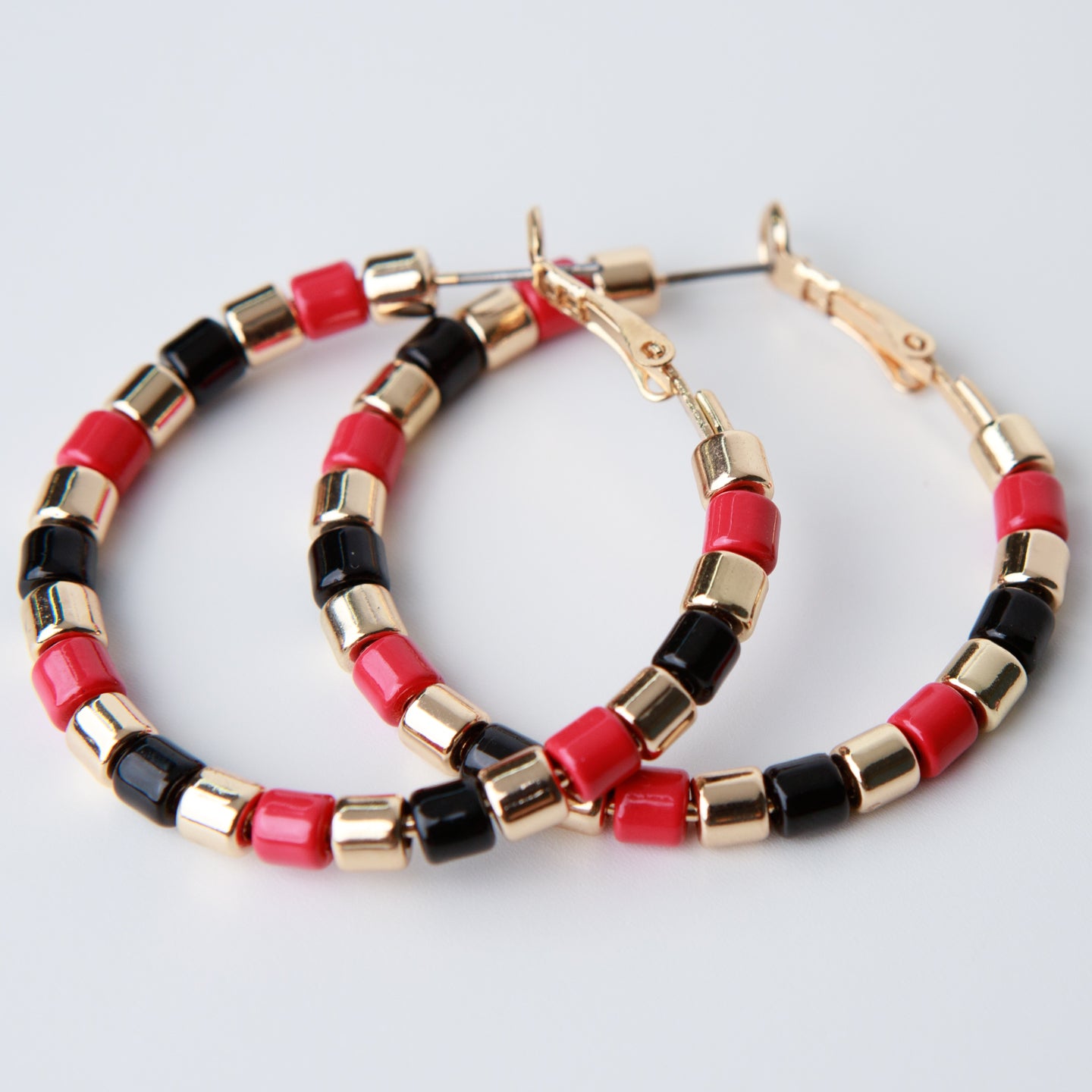 Elevate your style with these striking Black, Red, & Gold Beaded Hoop Earrings. Crafted with a blend of metal and acrylic beads, they offer a bold yet elegant look perfect for any occasion. Their vibrant colors and unique design make them a standout accessory that effortlessly complements both casual and dressy outfits. Add a touch of sophistication and flair to your jewelry collection with these eye-catching hoops.
