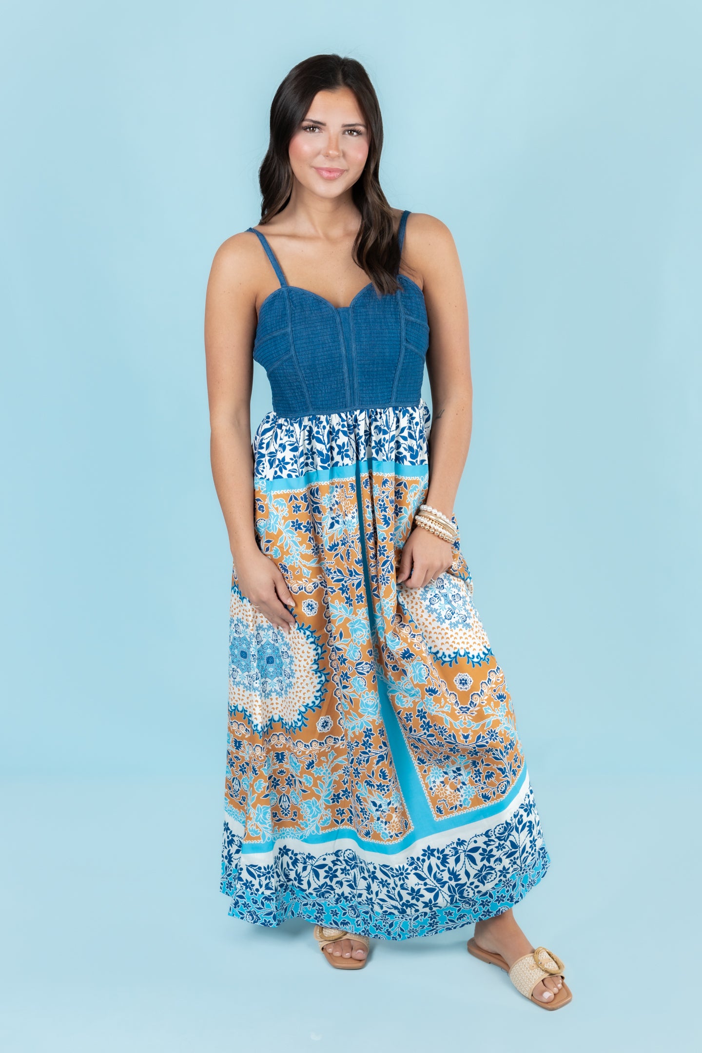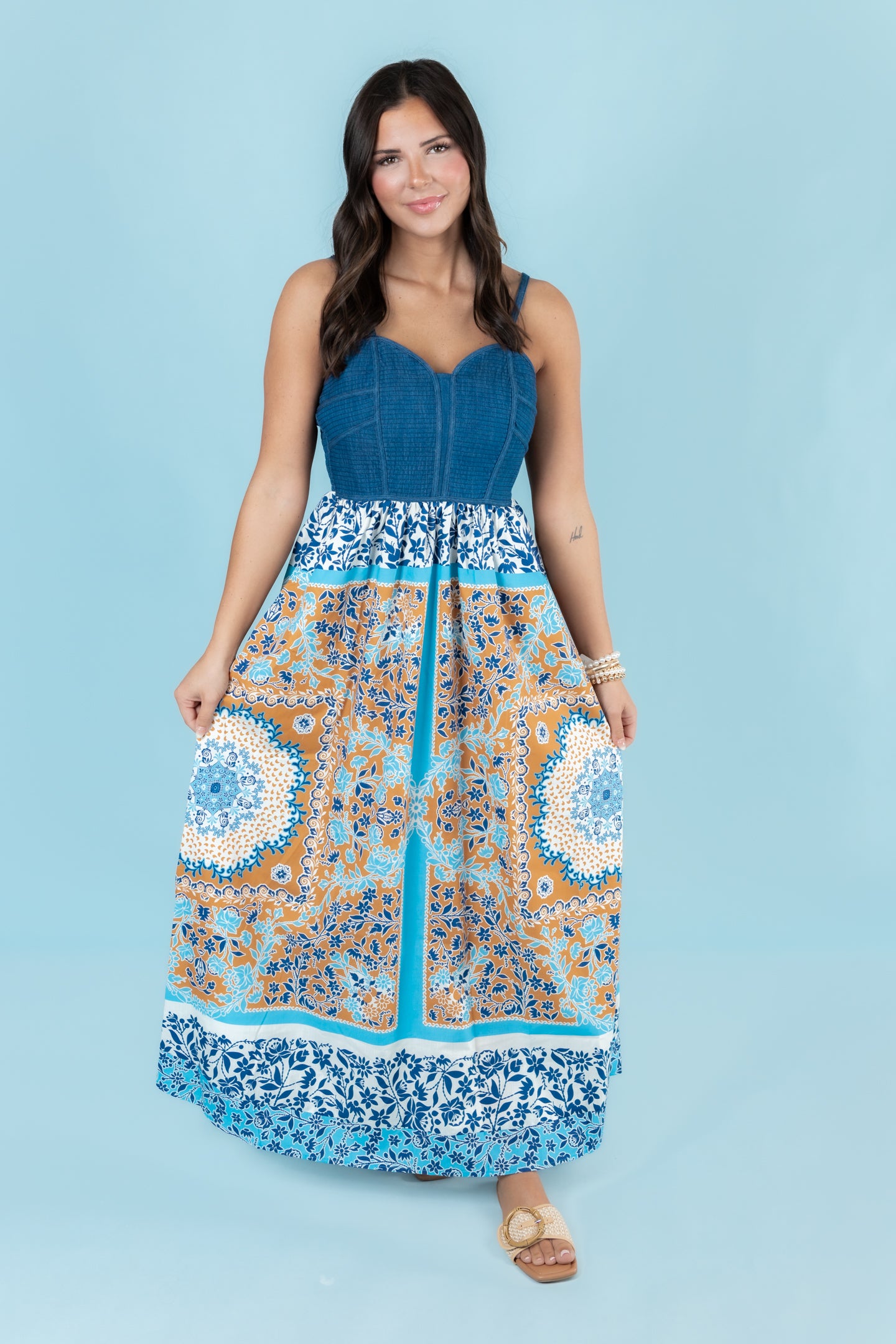 Effortlessly chic and comfortable, our Bohemian Breeze Dress features a sleeveless print maxi design with a contrast quilted top. The smocked back adds a touch of femininity while providing a comfortable fit. Perfect for any occasion, this dress will keep you feeling stylish and confident all day long.