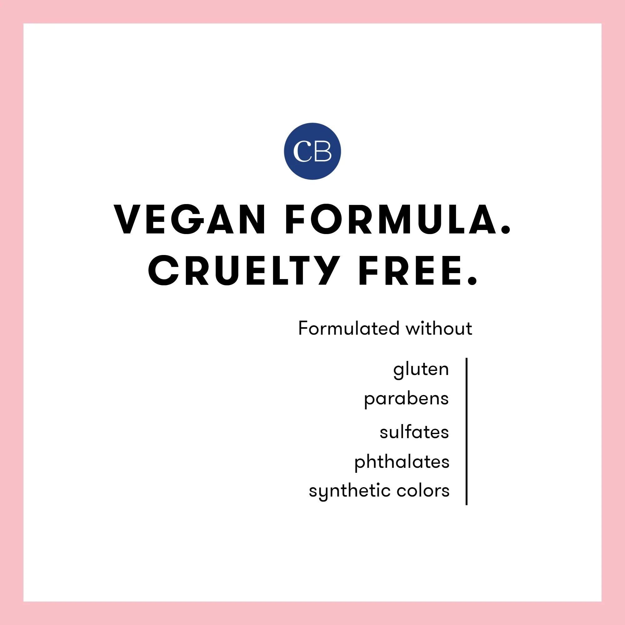 Vegan formula. Cruelty-free. Formulated without gluten, parabens, sulfates, and phthalates. No synthetic color.