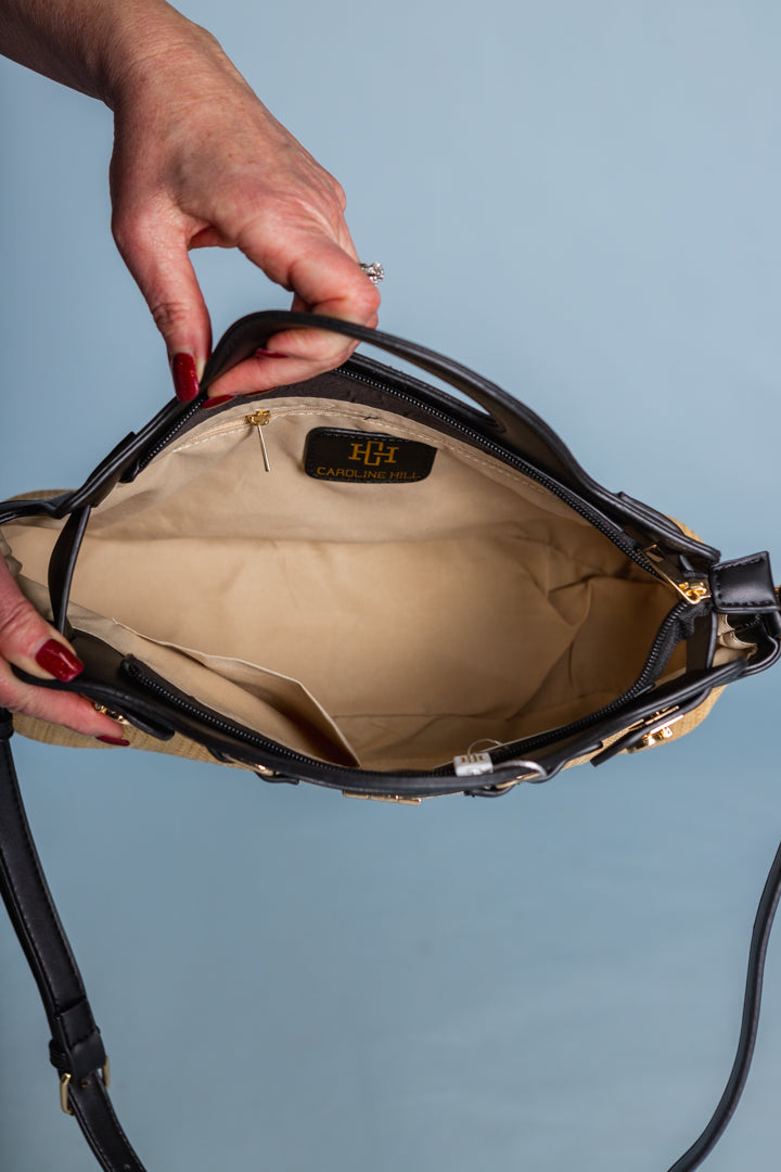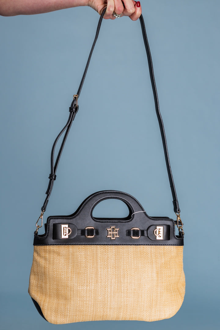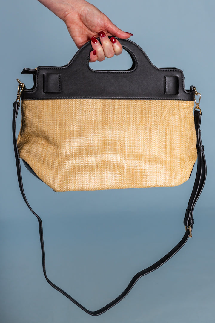 This modern handbag has a classy yet trendy silhouette. It is designed with a straw lattice fabric with a natural vegan leather trim. There are two open top carrying handles as well as a removable and adjustable crossbody strap. The accent gold hardware adds a fashionable touch that elevates the whole look of this bag as well. The top zipper closure leads to the open interior with one zippered pocket and two open pockets. It also has feet on the bottom of the bag for added protection.