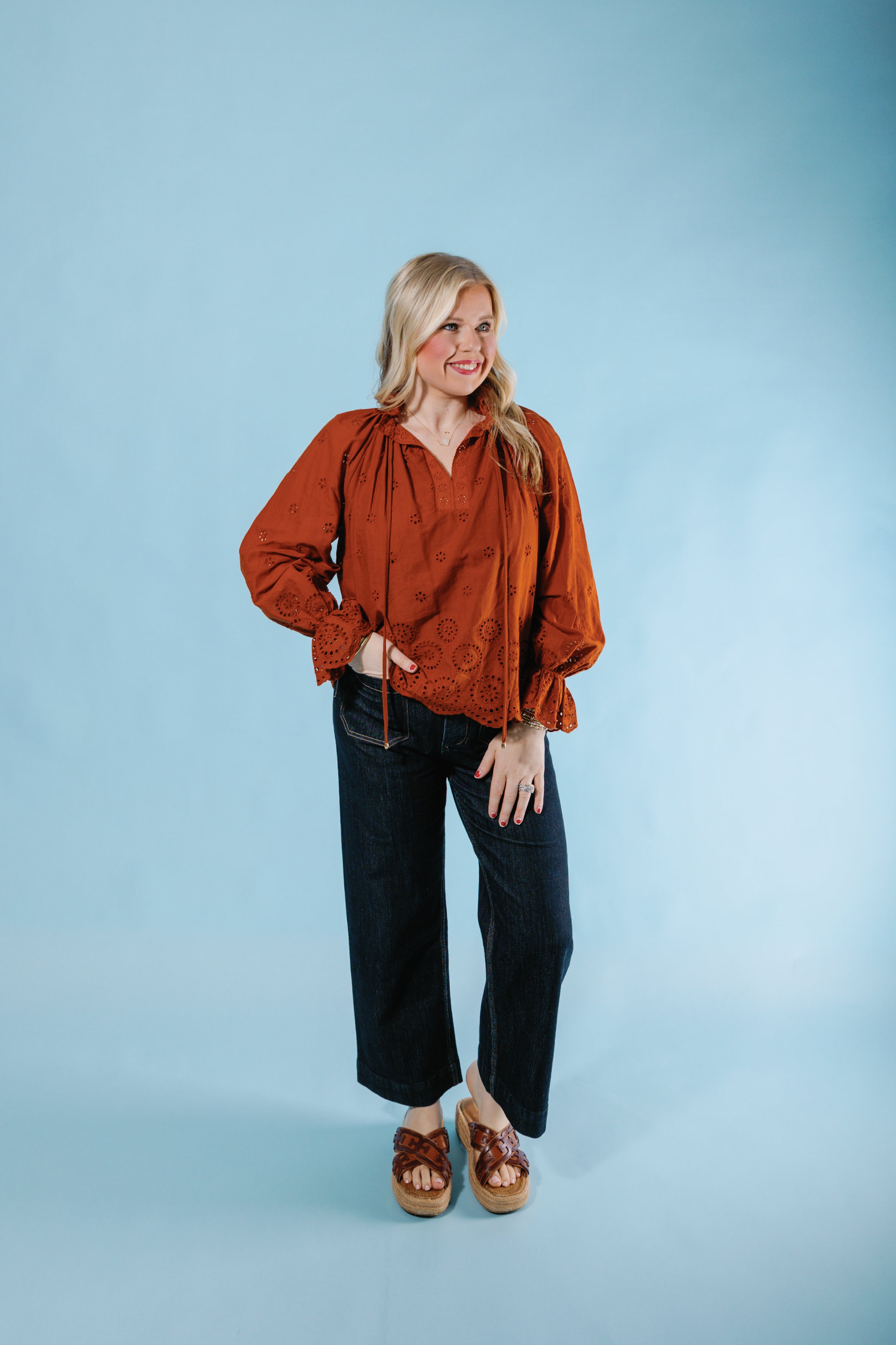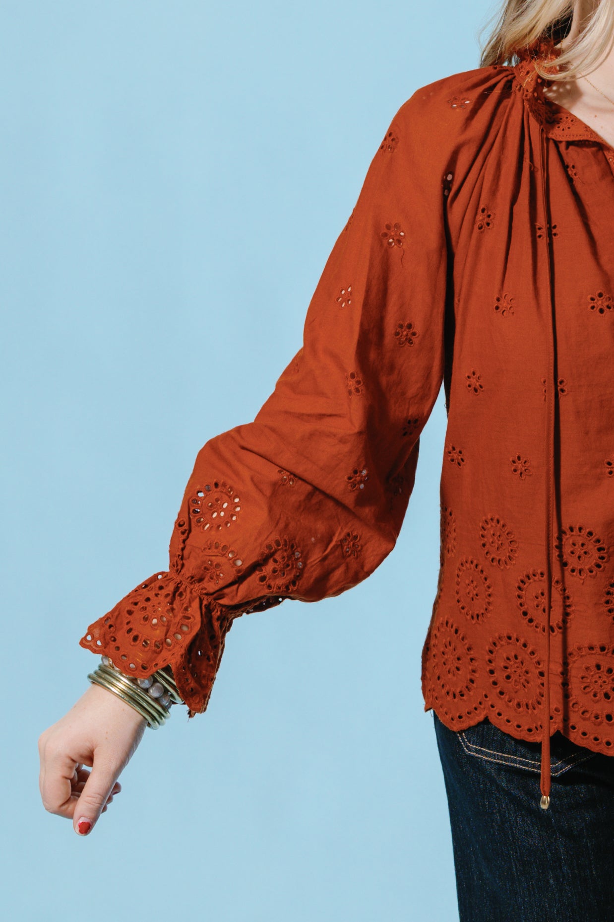 This top will make you stand out with its playful scallop trim and ruffle neckline. It's perfect for any occasion, with a self tie detail and elastic cuffs for added style. The lightweight cotton fabric is both breathable and stylish. So go ahead and rock this eye-catching, non-sheer top!