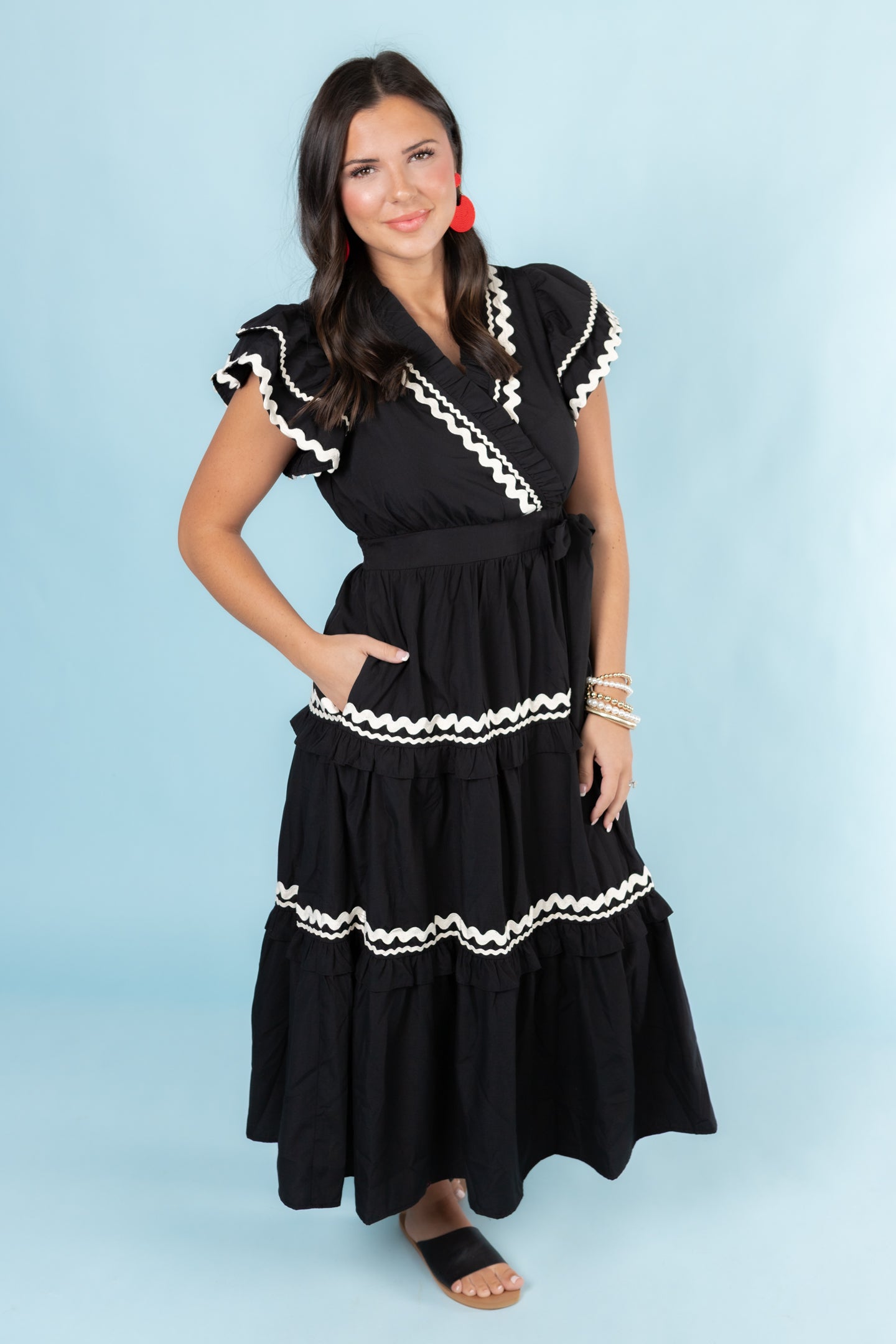 Be the center of attention in our Dance The Night Away Midi Dress! This solid, tiered flutter sleeve wrap dress boasts a beautiful multi-size accented ricrac trim. Perfect for any occasion, this dress is lined, woven, lightweight, and non-sheer. You'll feel confident and elegant while dancing the night away in this stunning midi dress.