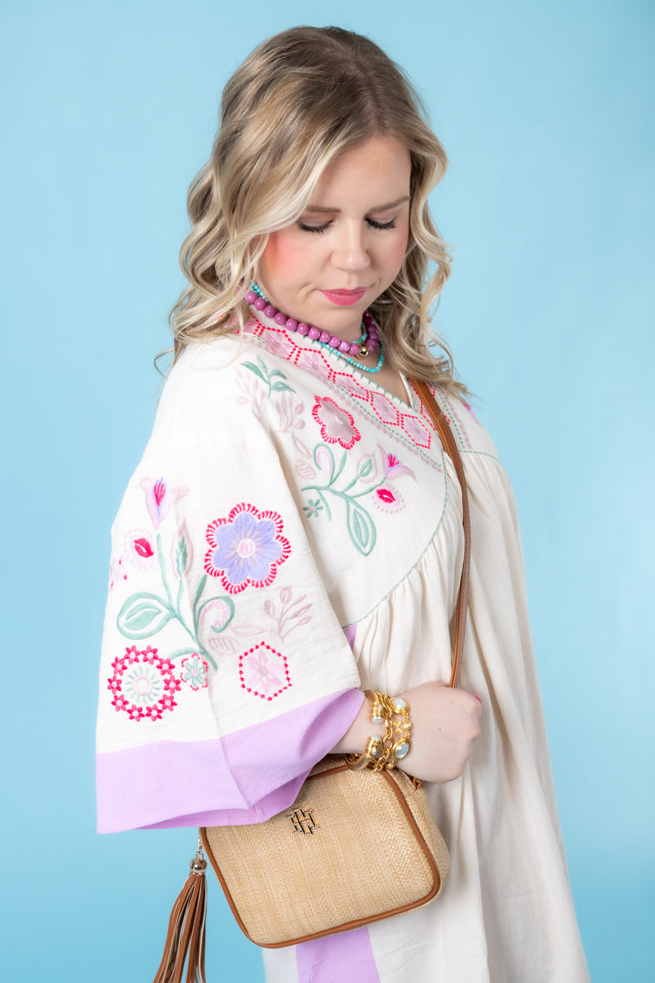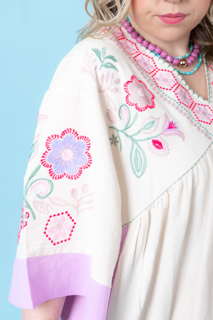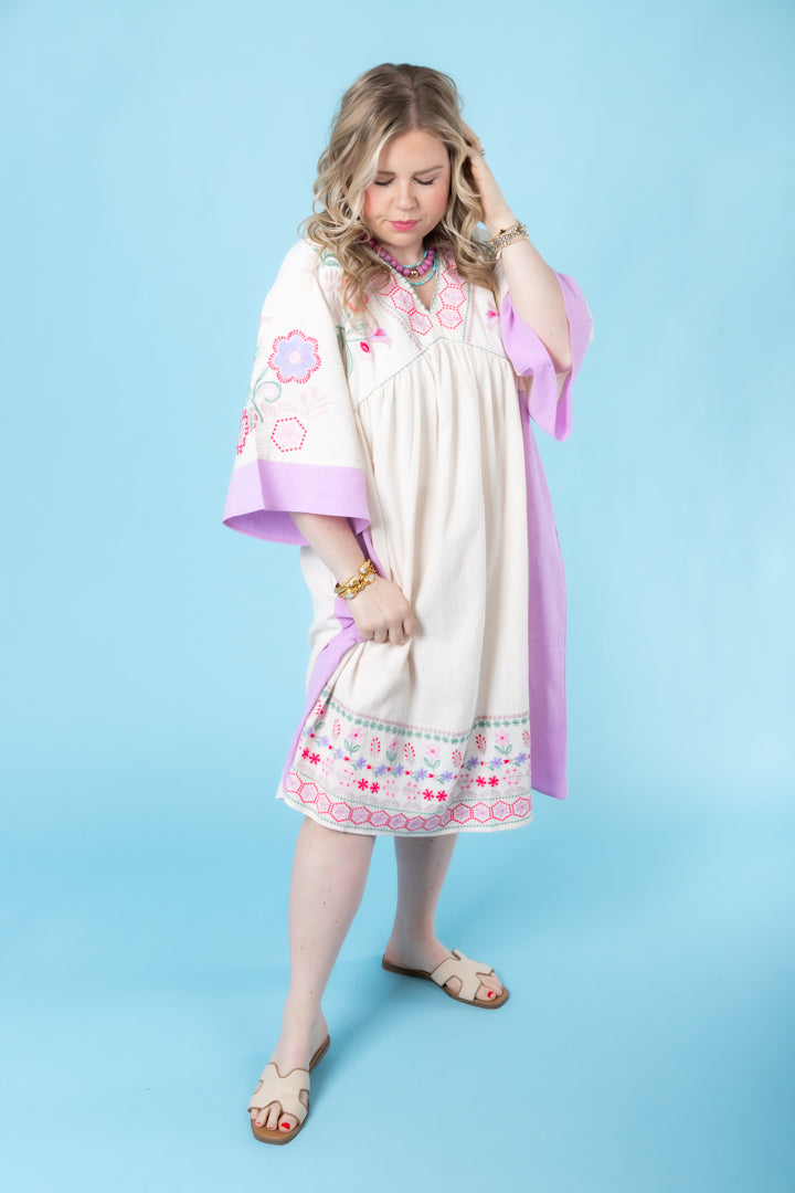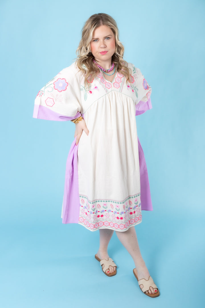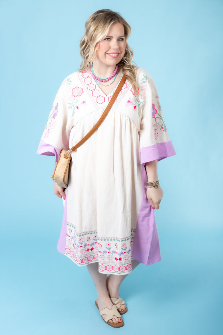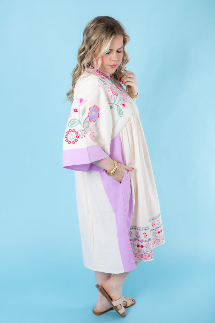 Description: Be effortlessly chic in our Embroidered Linen Maxi Woven Dress! Featuring a deep V neckline and relaxed, loose fit, this dress is a must-have for any fashion-forward individual. With side pockets and color block cuffs and sides, you'll have both style and functionality. The embroidered detailing on the chest and hem adds a touch of elegance. Ideal for any occasion, you'll love the comfort and versatility of this dress.