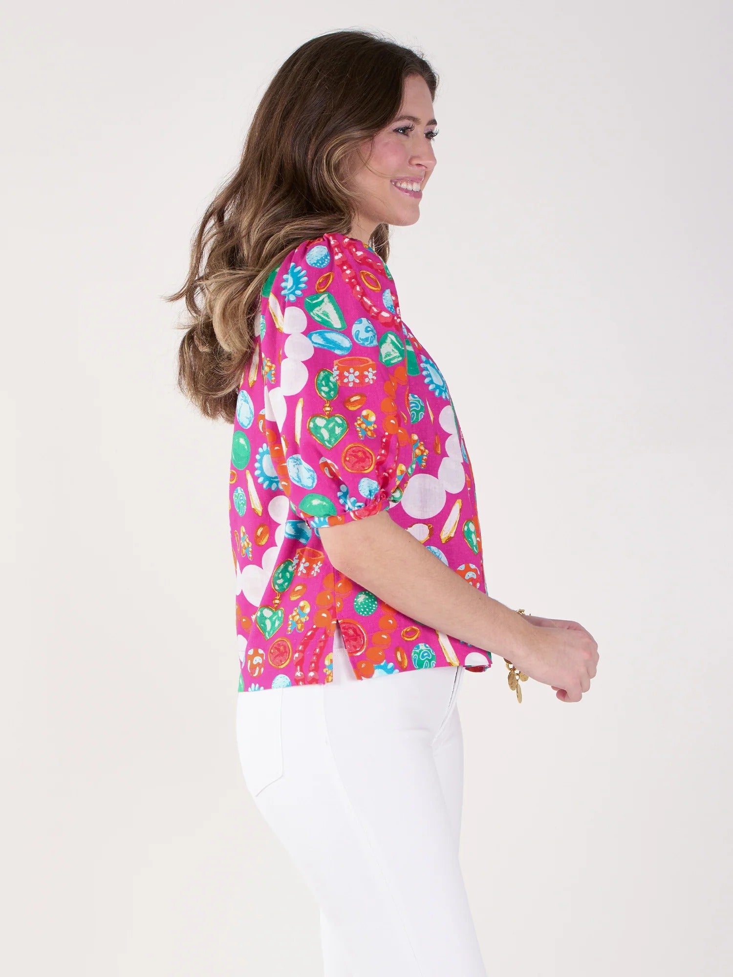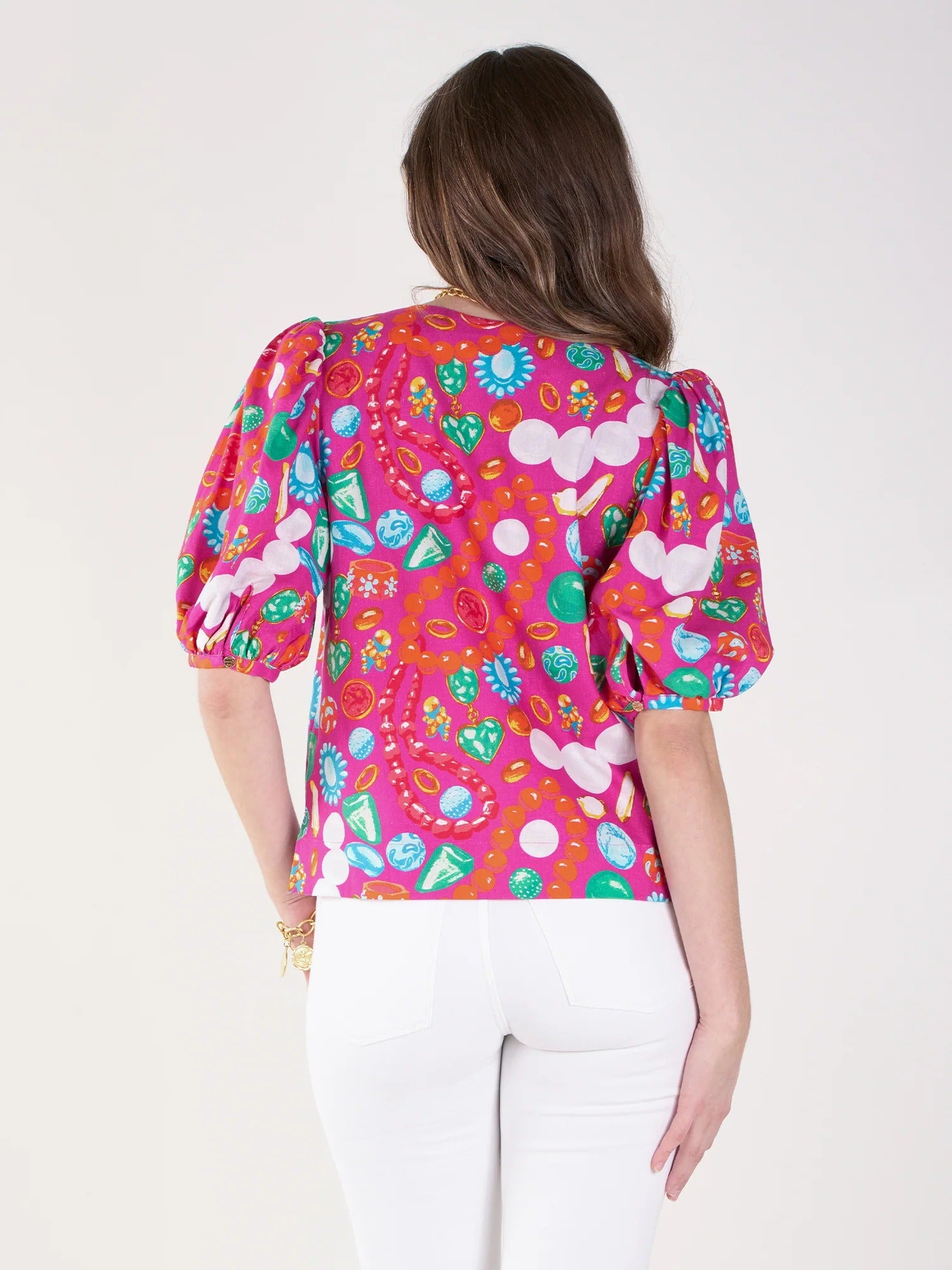 The Penny Top in Jewelry Box is a playful tribute to fashion icon Iris Apfel and her legendary love for accessorizing. Featuring puff sleeves, a flattering V-neckline with delicate pin tuck detailing, and a relaxed, loose-fitting silhouette, this top blends charm with everyday ease. The vibrant Jewelry Box print is a joyful celebration of bold baubles and unapologetic style—perfect for those who believe more is more.