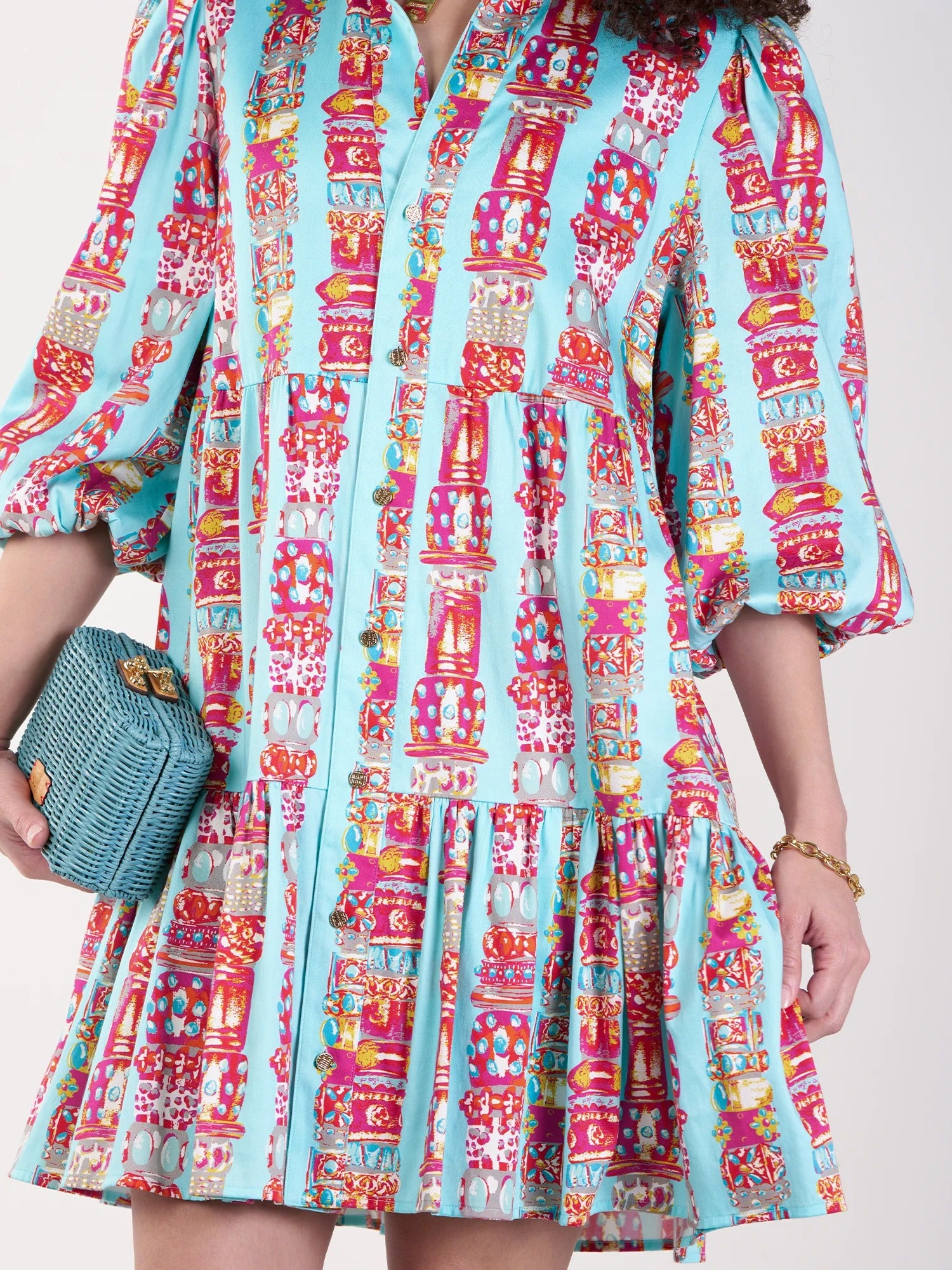 The Sadie Dress in Iconic Iris is a playful statement piece inspired by the bold and eclectic style of Iris Apfel. Designed in a relaxed, loose-fitting silhouette, it features quarter-length blouson sleeves, a flattering drop waist hem, and practical side pockets. Signature gold button closures add a polished touch, while the vibrant Iconic Iris print—filled with stacked bangles in all shapes, sizes, and colors—celebrates maximalism and self-expression. It's effortless, eye-catching, and full of personality.