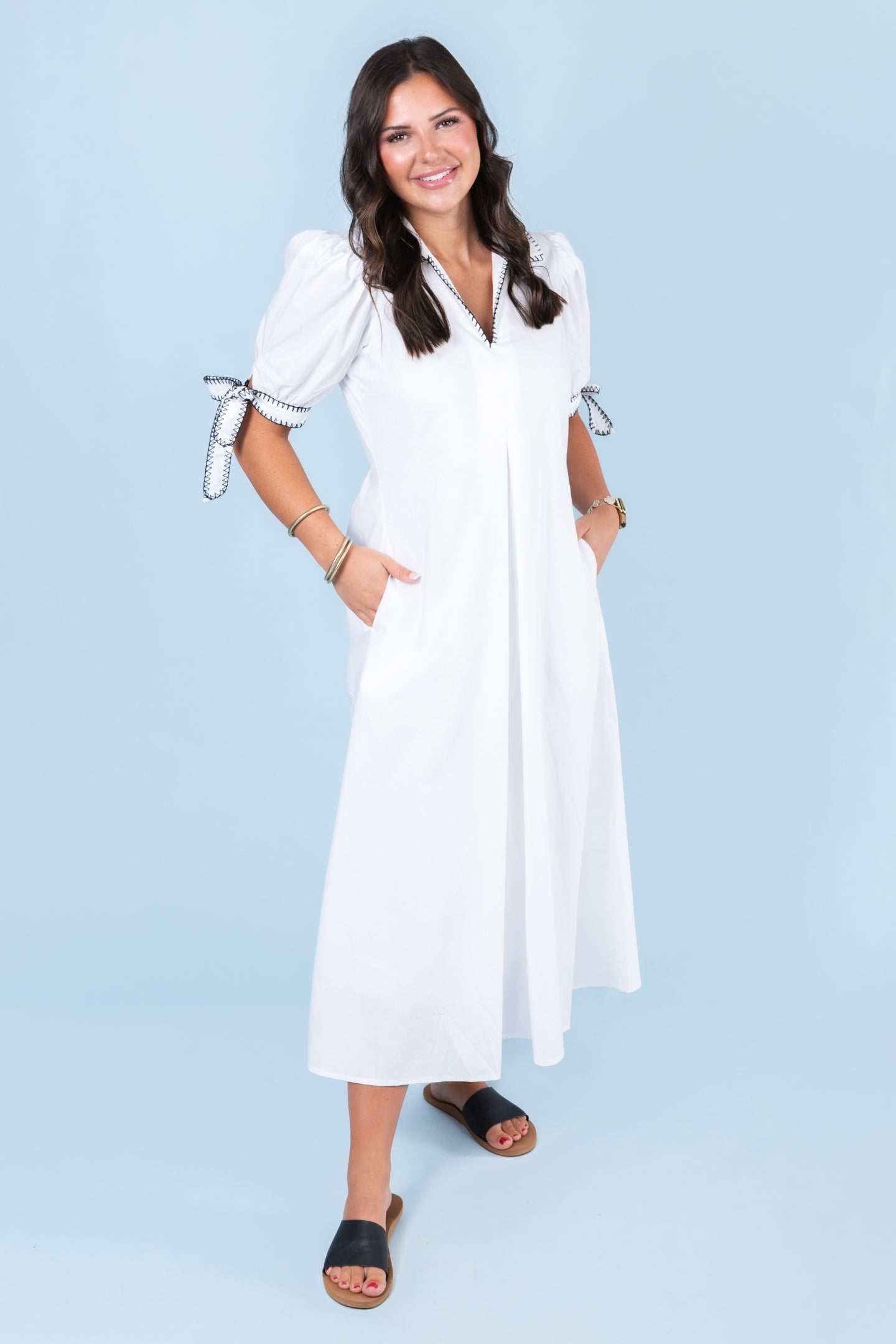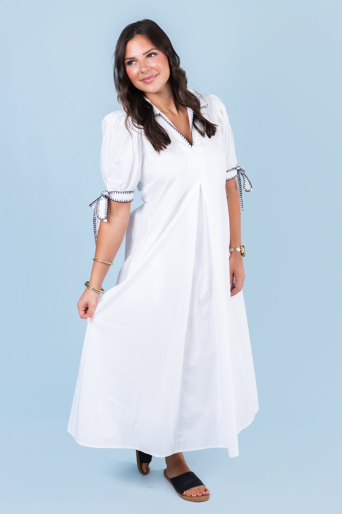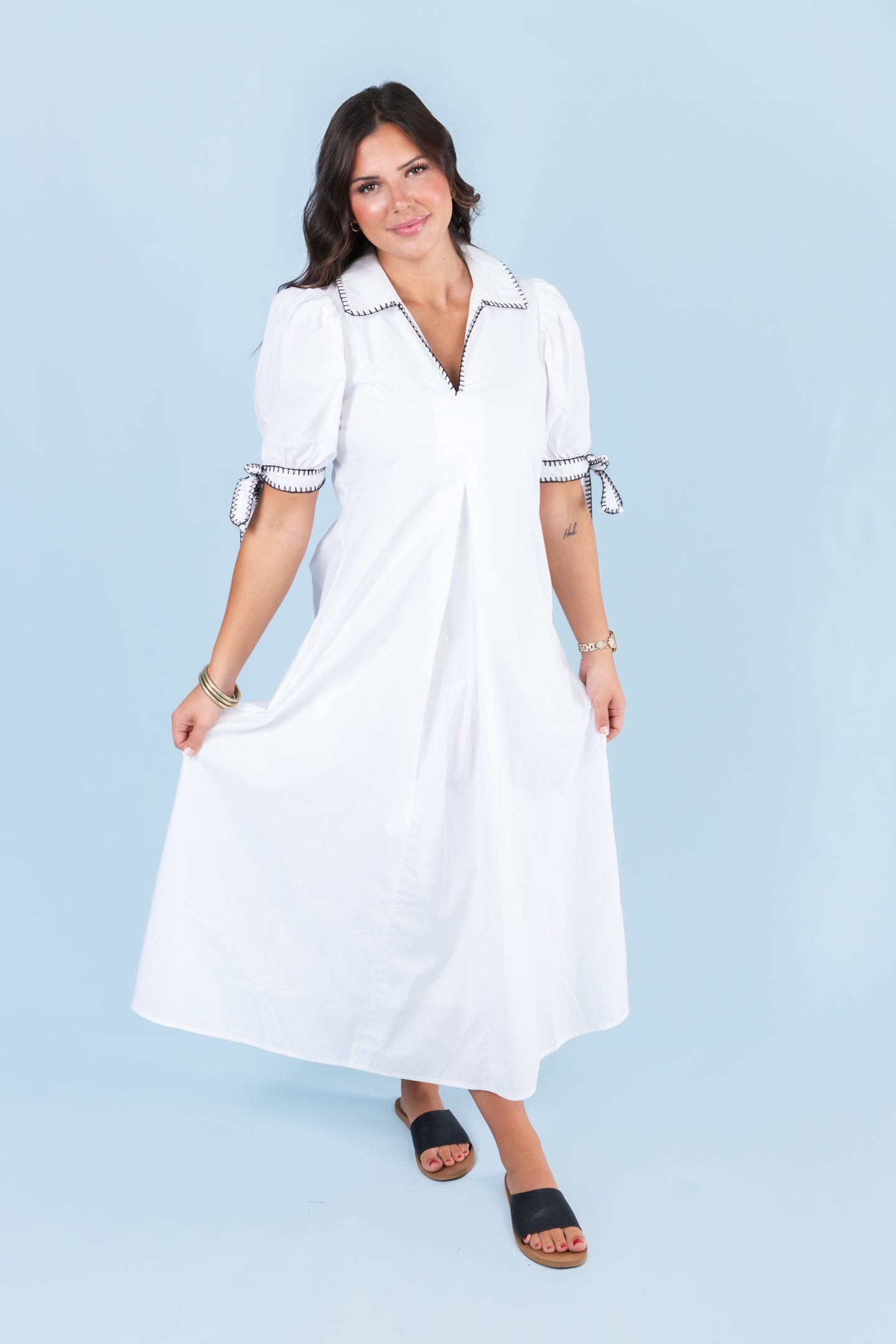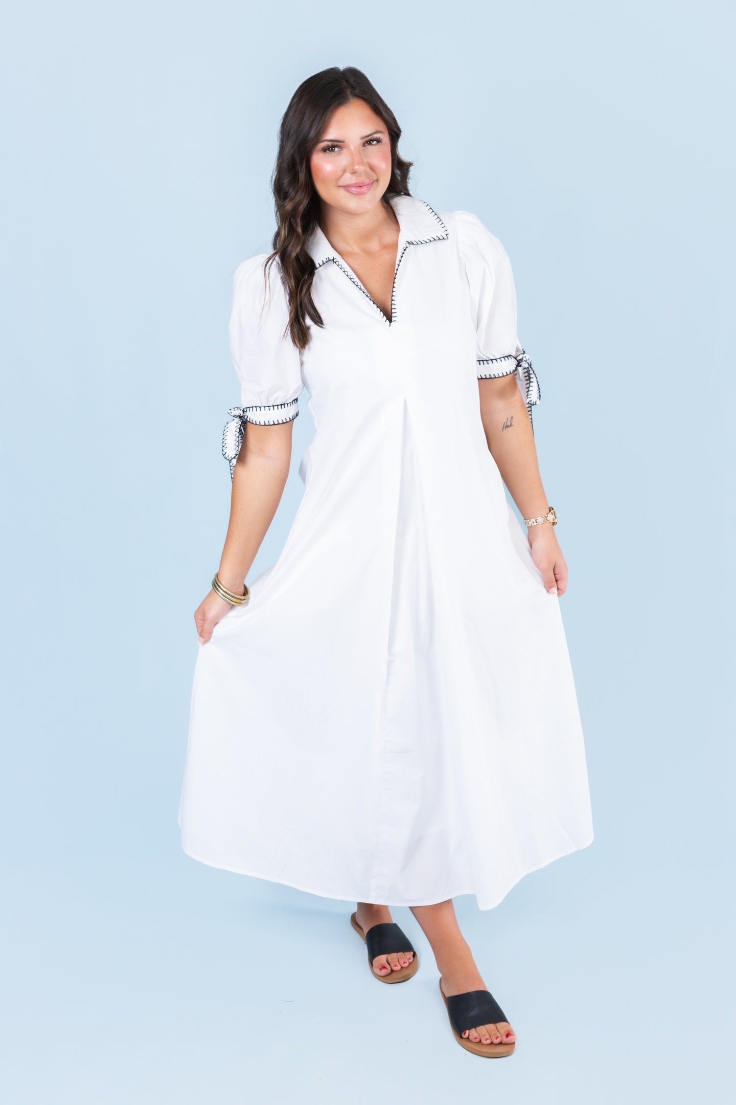 Make a statement with our Stitch Detailed Midi Dress, where timeless elegance meets modern design. Featuring eye-catching stitch detailing, a classic collar, and a sophisticated V-neckline, this dress strikes the perfect balance between chic and effortless. The short puffed sleeves add a feminine flair, while the midi length keeps your look refined and polished. Crafted from high-quality materials, it offers both comfort and style—perfect for any occasion. Elevate your wardrobe with this must-have piece today!