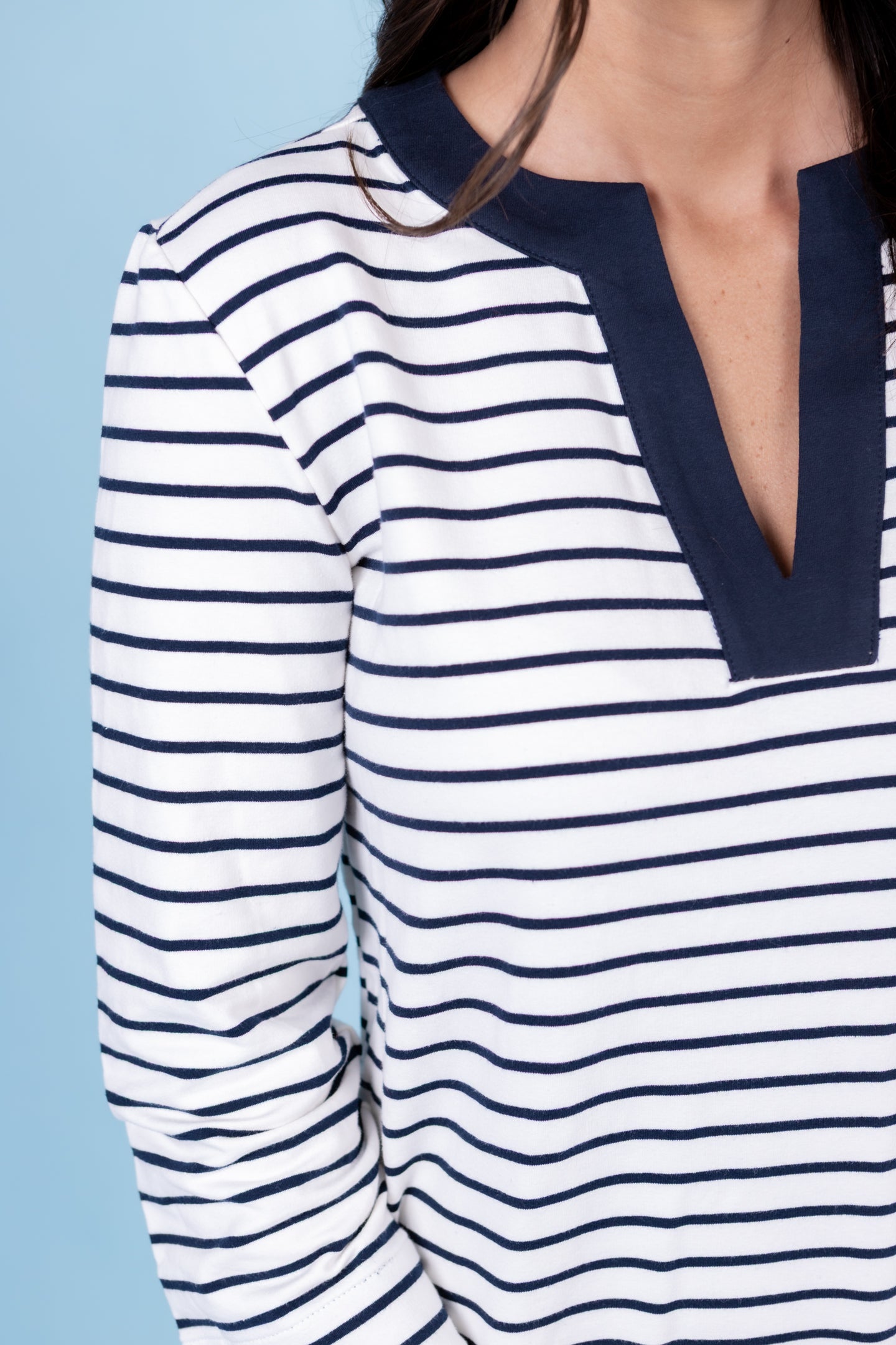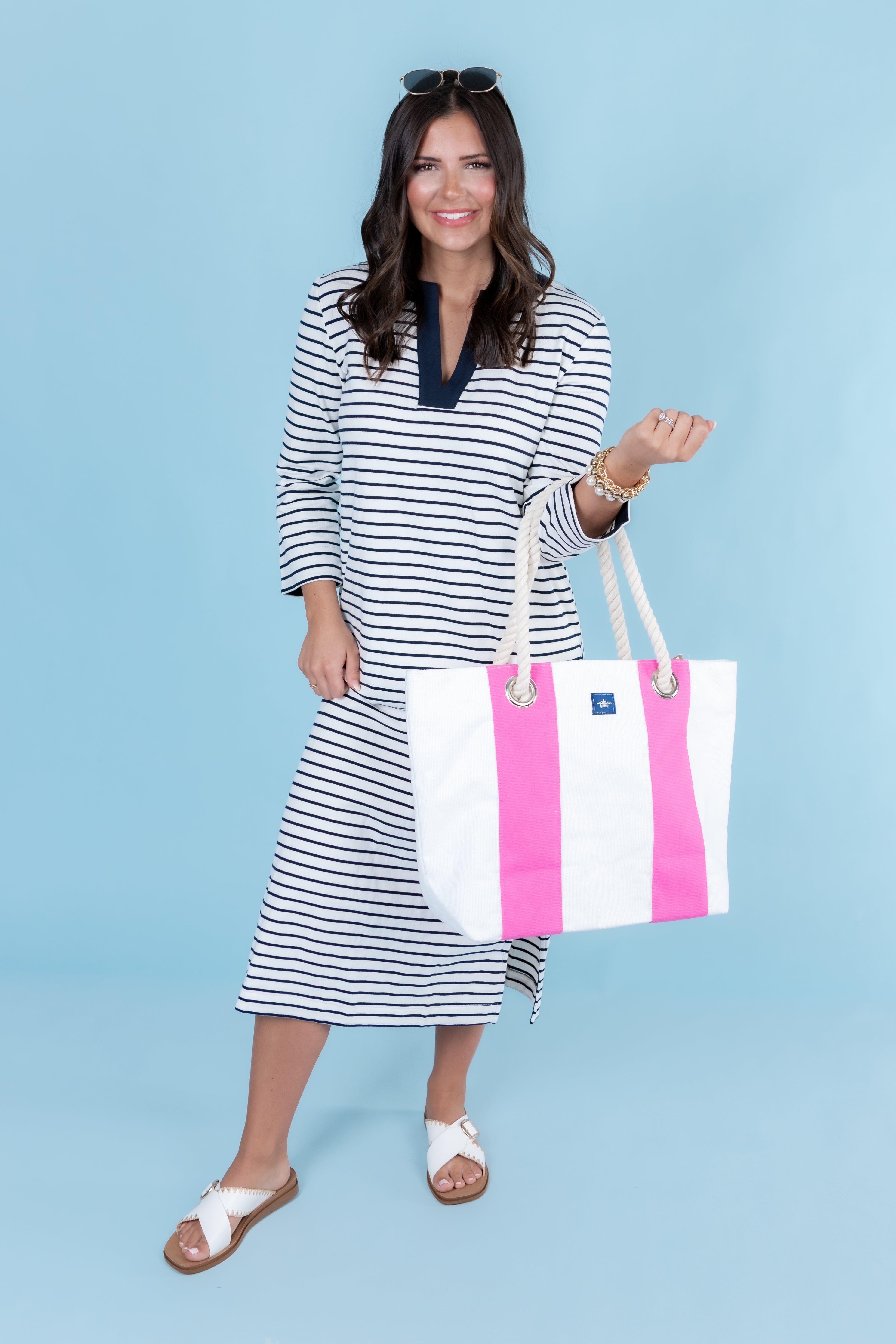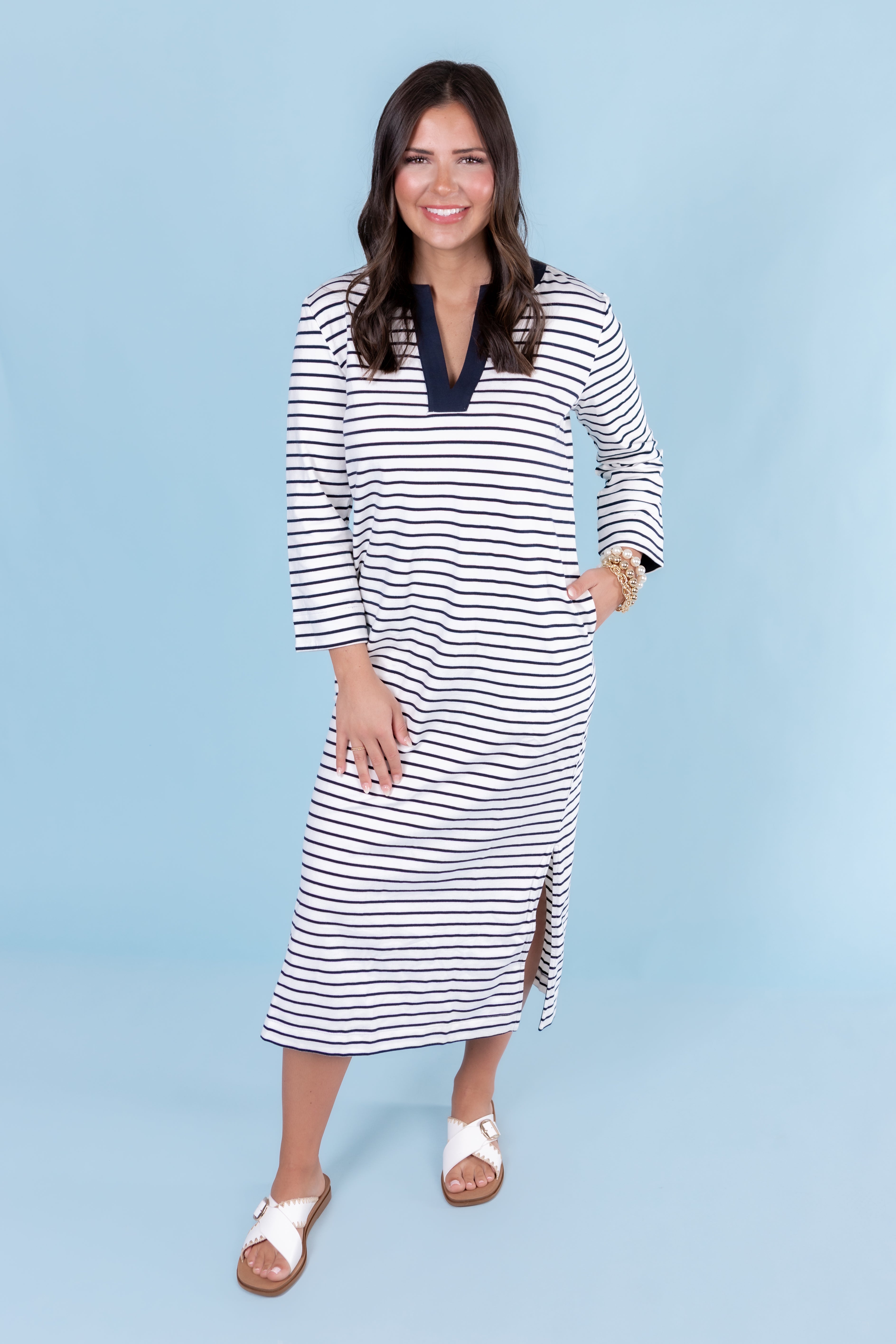 Make a stylish statement with our Stripe Jersey Midi Dress. Featuring classic stripes and a flattering V-neckline with rib detailing this dress is perfect for any occasion. The long sleeves provide coverage while the side slit at the bottom adds a touch of femininity. Made from comfortable jersey fabric this dress is both chic and comfortable. Perfect for any season you can dress it up or down for a versatile look. Shop now and add this must-have piece to your wardrobe. Available in multiple sizes.