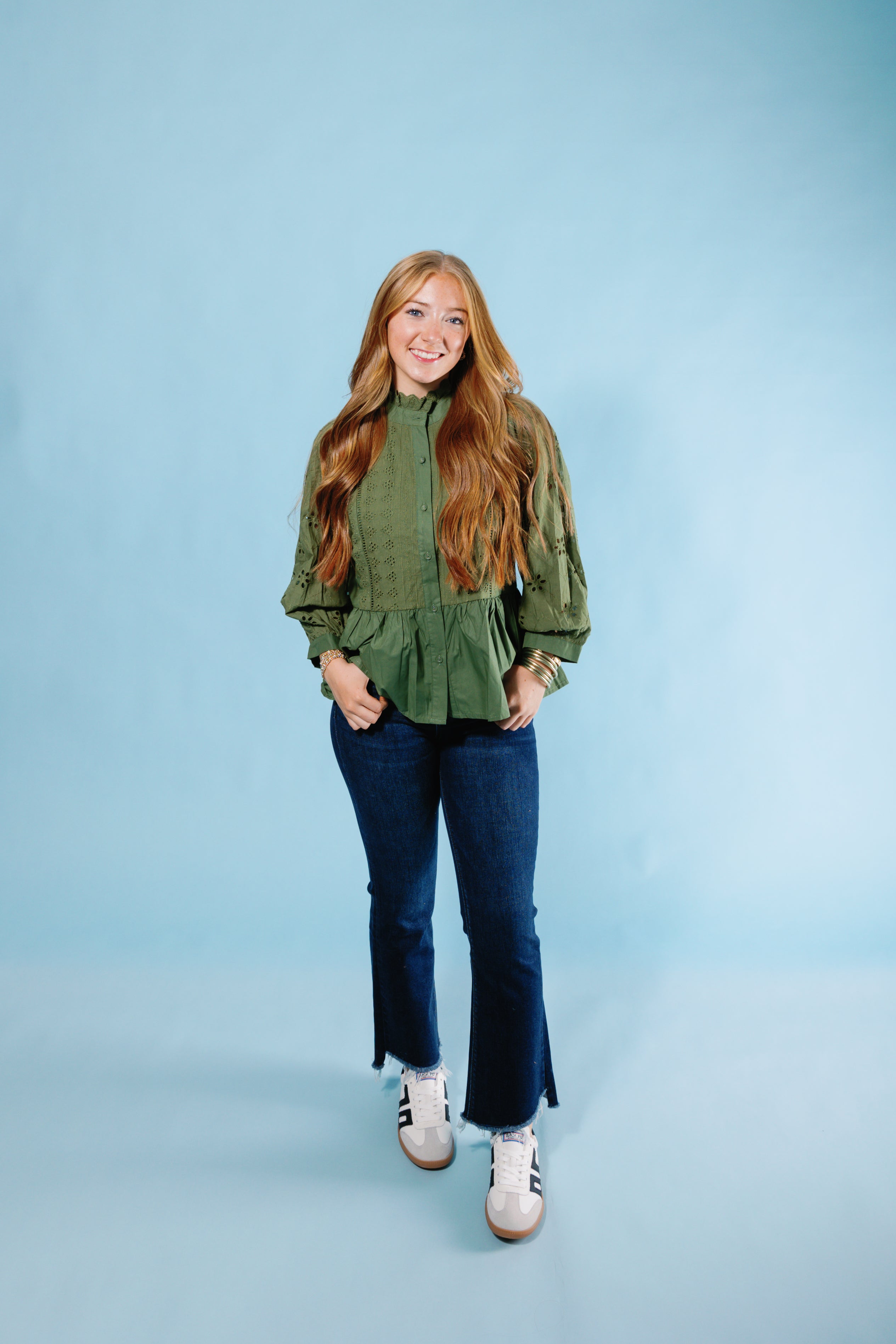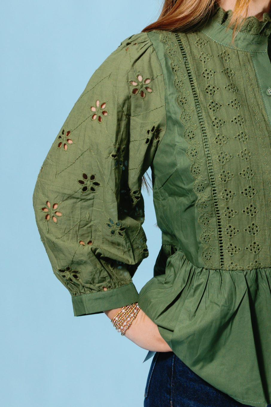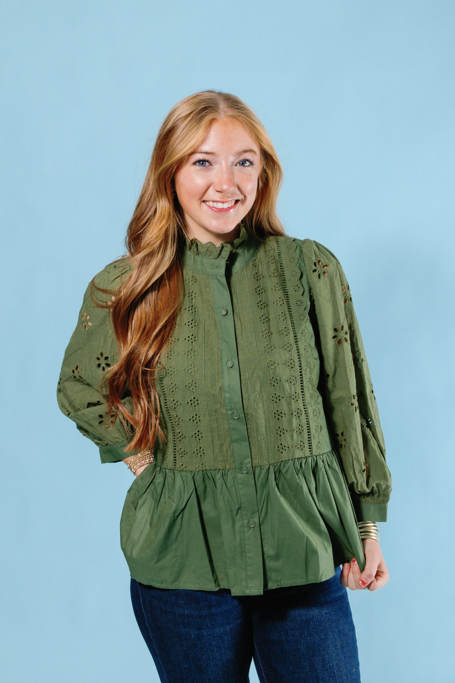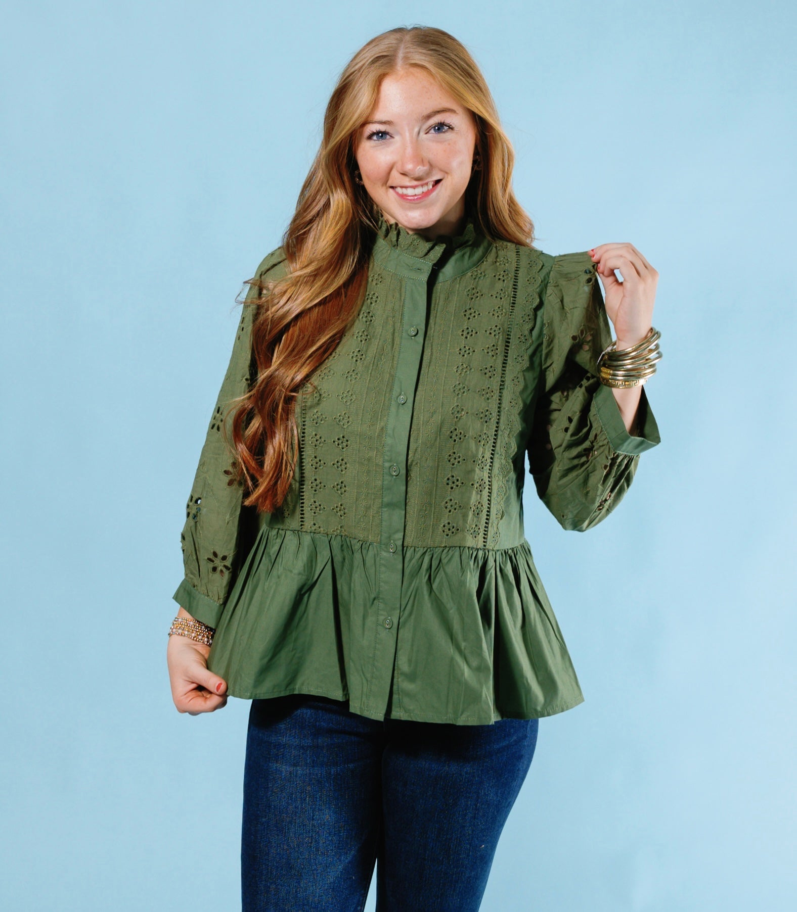 Indulge your love for floral patterns with this eyelet lace blouse. The 3/4 sleeve button-up style is accented with a ruffled neckline, adding a touch of femininity. Made from lightweight, semi-sheer material, this blouse is perfect for warmer days. (Florals never looked so chic!)