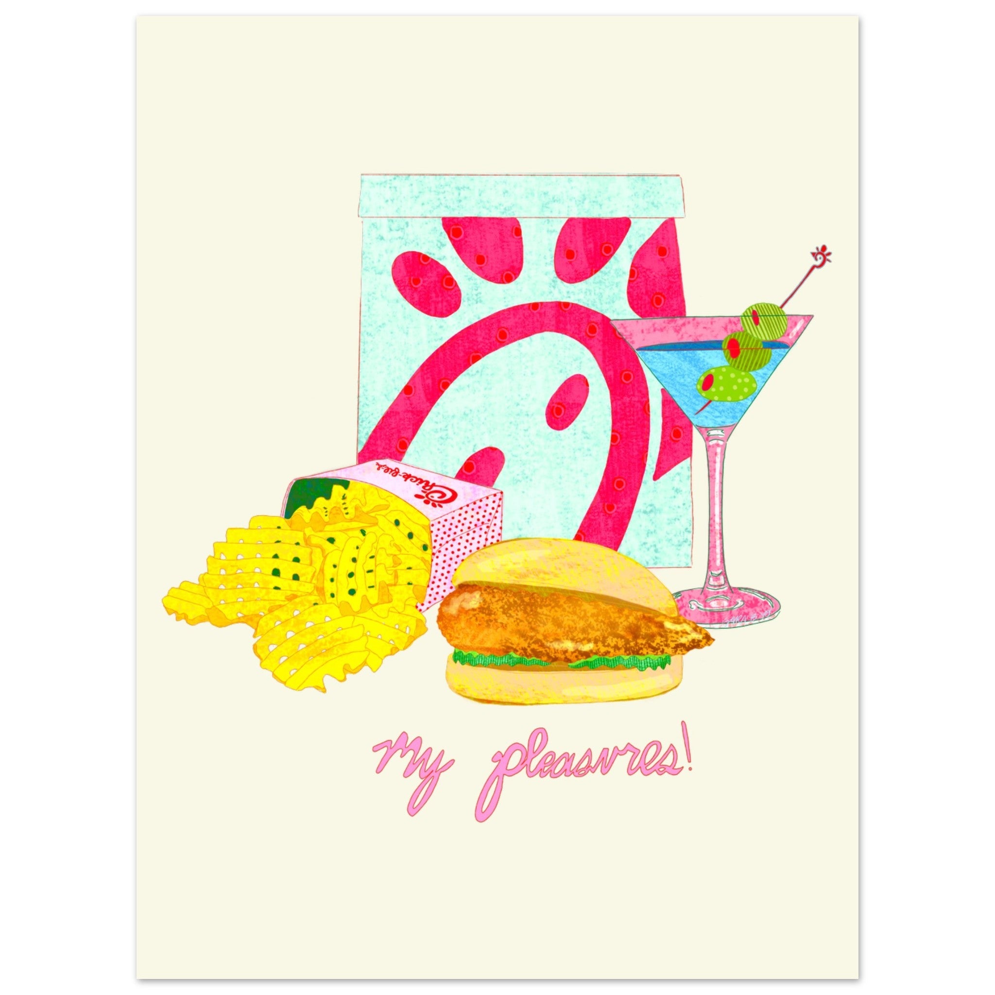 "My Pleasures" artwork by Sara B. Yo. inspired by a fast food fav, Chick-fil-a. Printed on premium semi-glossy paper, with enhanced colors and a subtle shine that protects against fading from light or moisture.