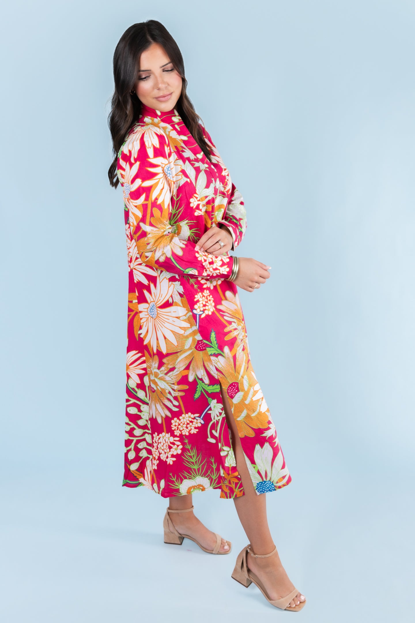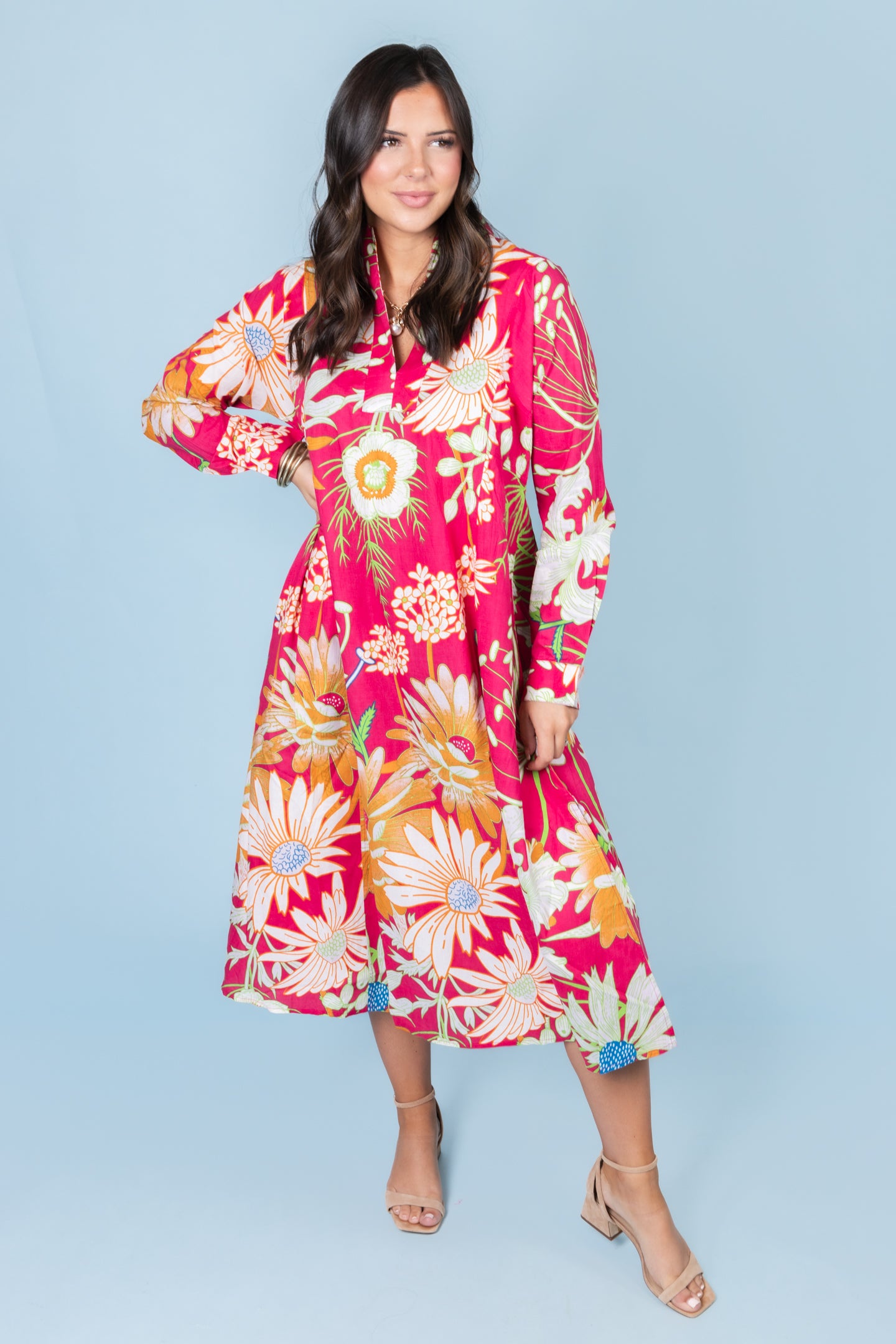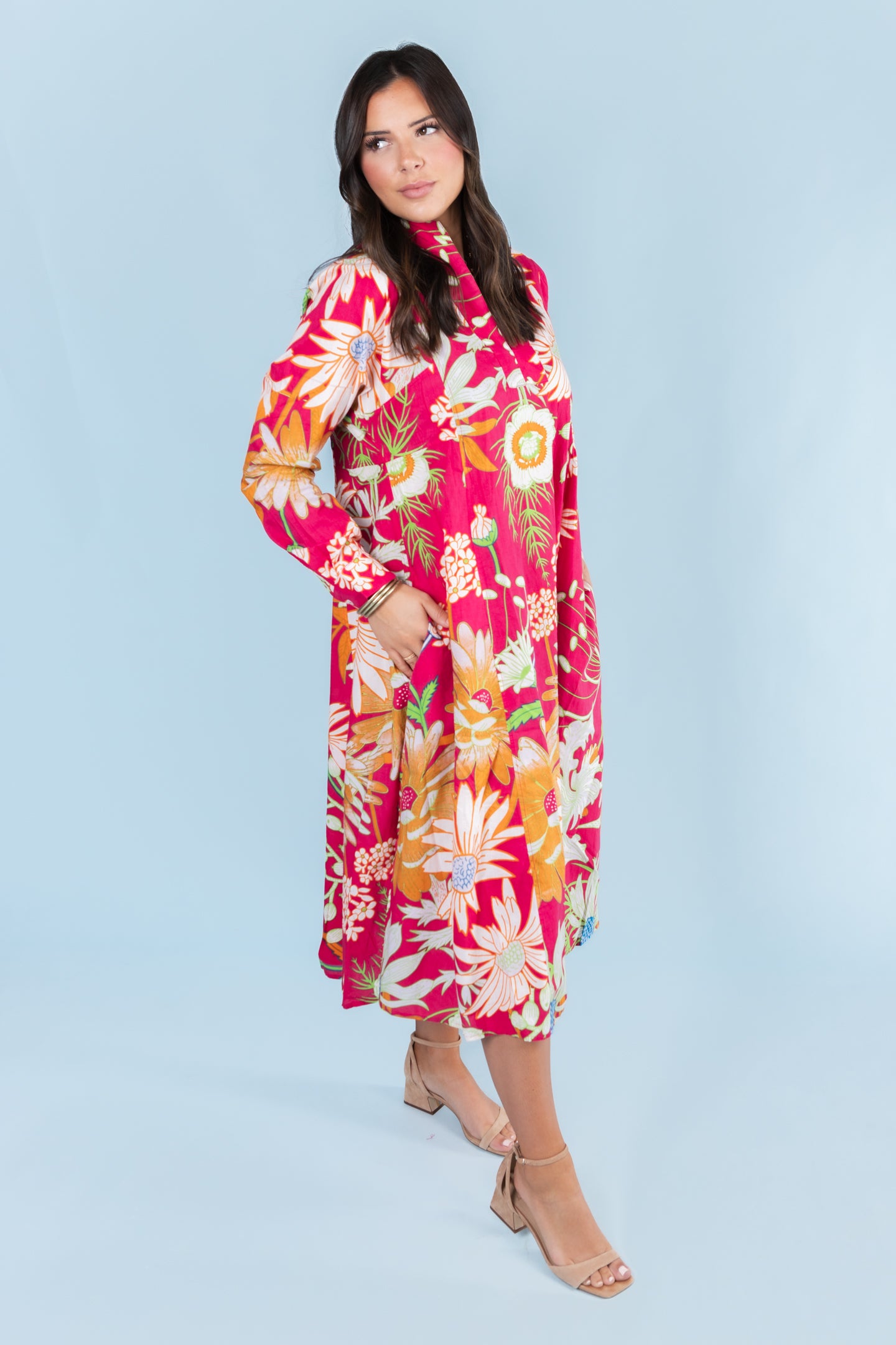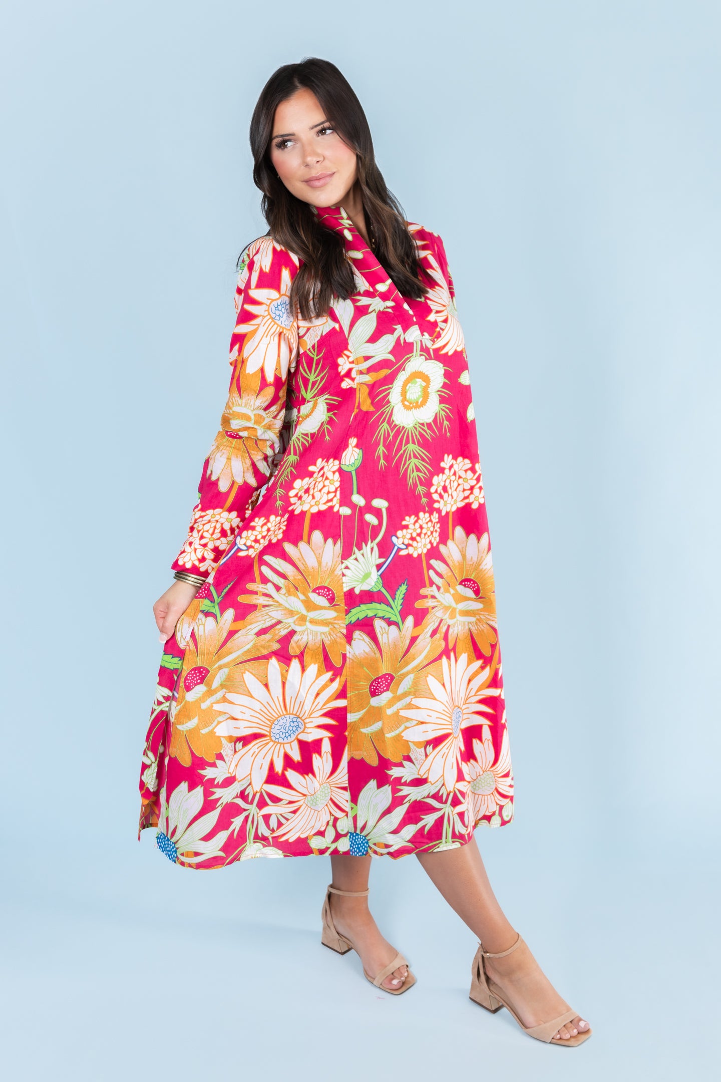 Embrace effortless elegance with the Ivy Jane Patio Floral Maxi Dress. Featuring a vibrant fuchsia floral pattern and a flattering V-neckline, this lightweight maxi dress flows gracefully, perfect for warm days and special occasions. Its breathable fabric ensures comfort while making a bold, stylish statement wherever you go.
