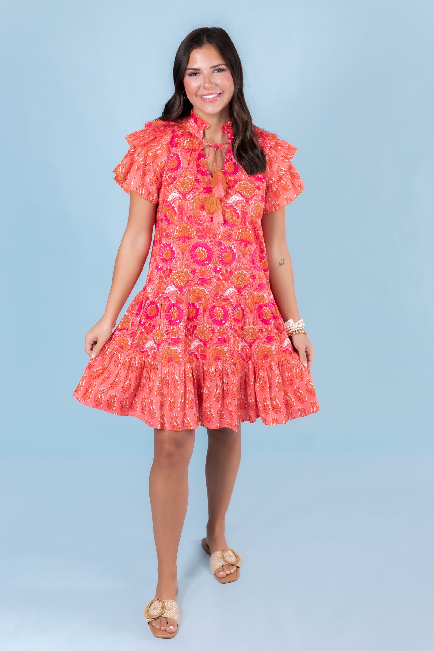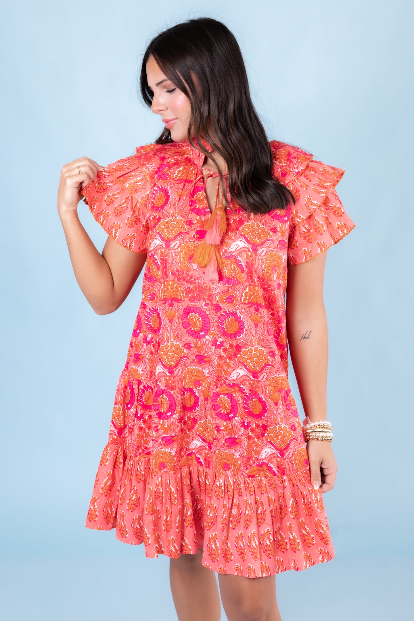Dress up in our Ivy Jane Twin Block Print Dress for a fun summer look! Flaunt the vibrant coral color and effortlessly accessorize with tassels and pockets. The tiered ruffle shoulder adds a playful touch to this must-have outfit. Be ready to turn heads and feel confident in this chic dress!
