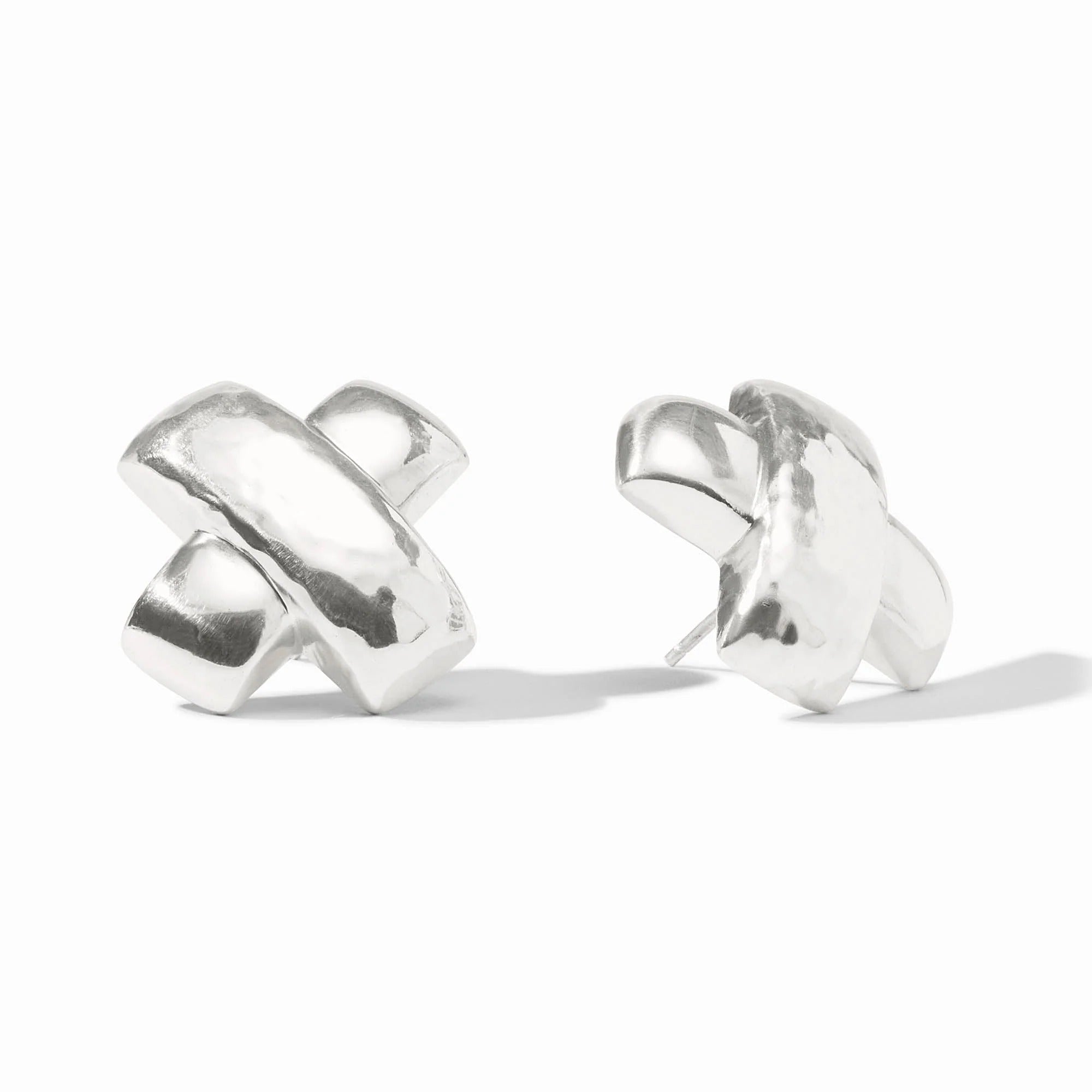 Contrasting textures unite in this X-shaped earring defined by a lightly hammered bar overlapping another with a smooth, satiny finish.