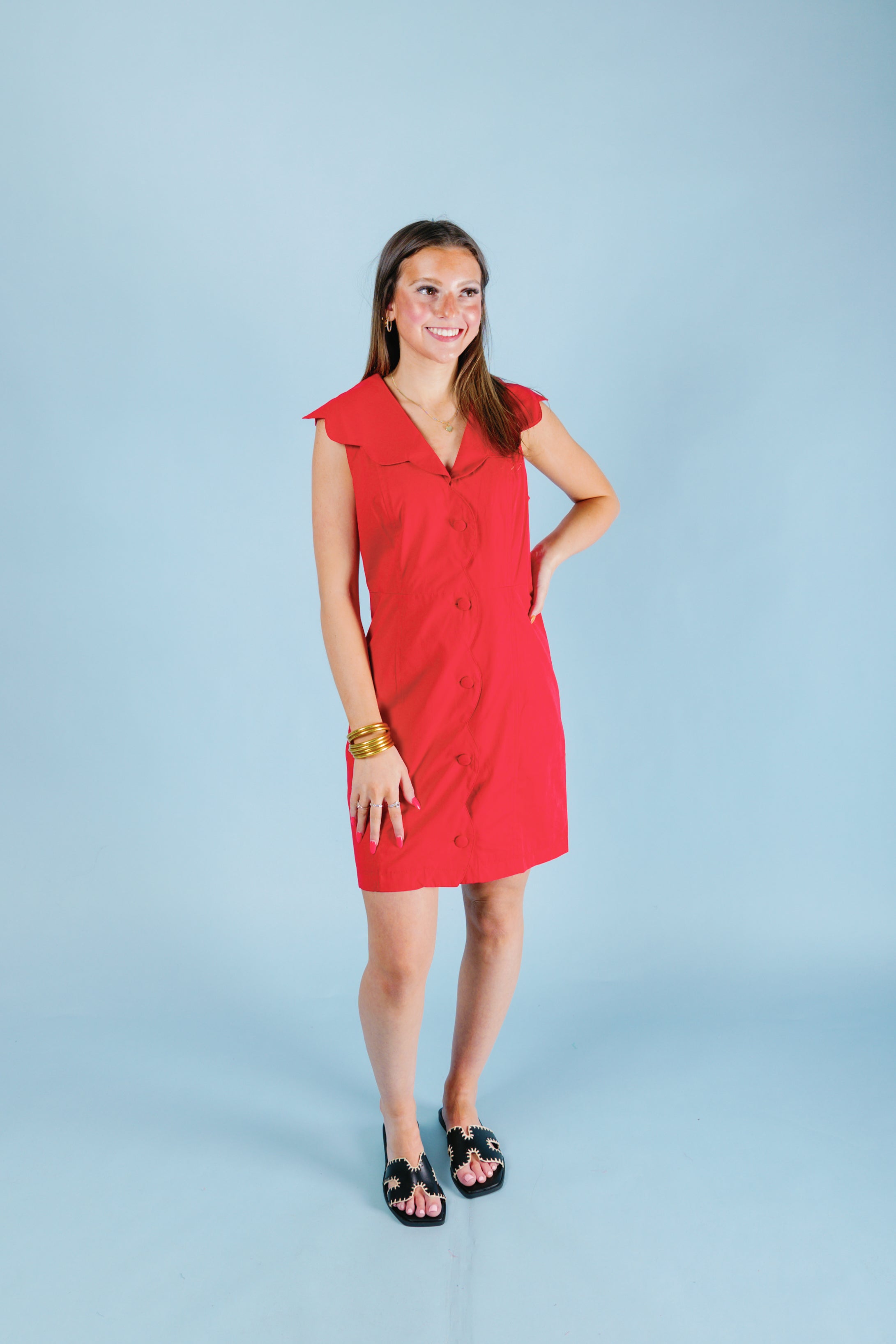 The Karlie dress features a cute scallop design and a flattering V-neckline, perfect for showing off your playful side. With a sleeveless cut, you'll feel free to reach for the skies and conquer the day in style. The limit does not exist when you wear this dress!
