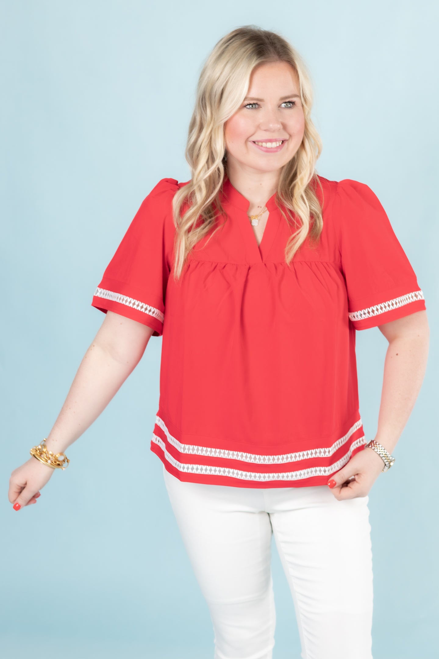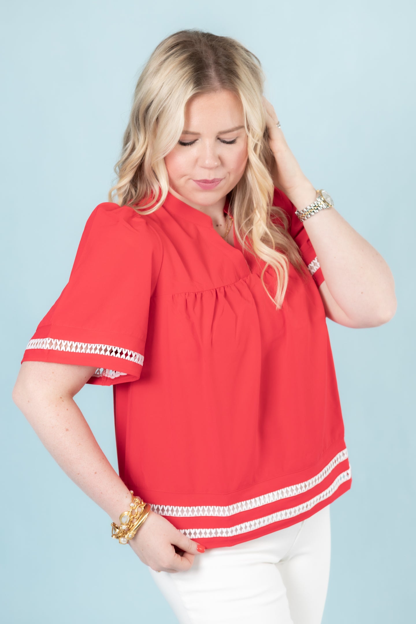 The Jasmine Top embodies effortless elegance with its notch collar and intricate lattice trim inserts. Flowing sleeves add a touch of grace and movement, enhancing its refined details and relaxed silhouette.