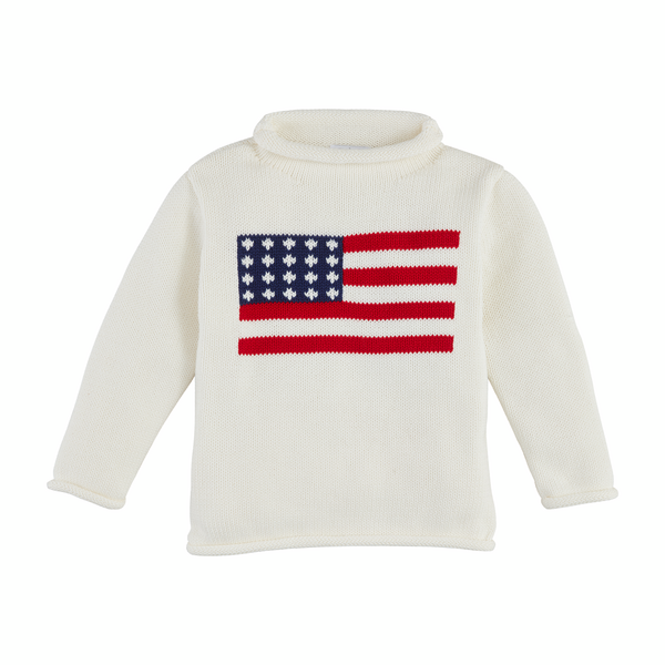 Flag Rollneck Toddler Sweater. Crafted from soft, breathable cotton yarn, this sweater offers a cozy and comfortable fit for your little one. The rolled neck design adds a touch of classic style, while ensuring warmth and ease of wear. Perfect for toddlers aged 12-18 months, this sweater is made from 100% cotton, providing a gentle feel against delicate skin. Ideal for layering during cooler months, it combines practicality with timeless fashion, making it a versatile addition to your child's wardrobe.