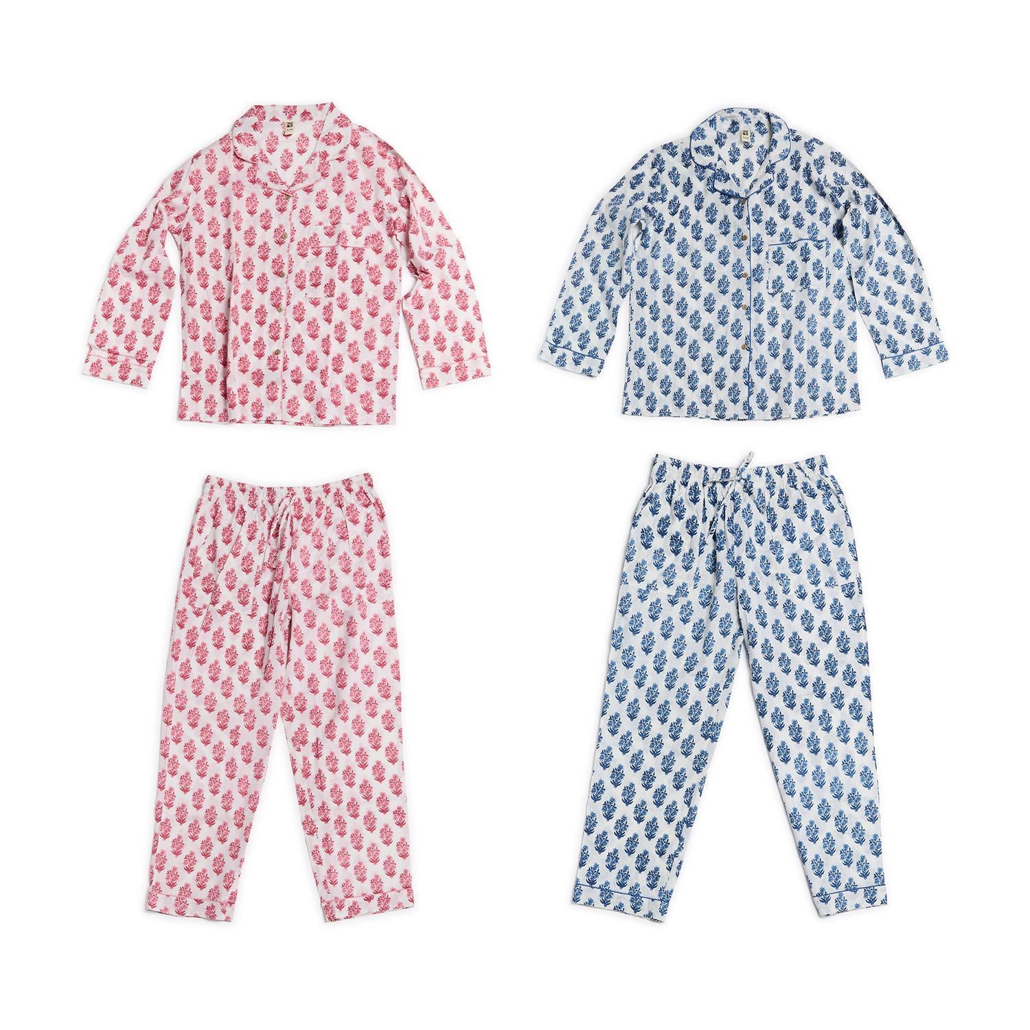 Indulge in luxurious lounging with our petal party cotton floral printed pajamas. Delicately crafted in soft cotton, these pajamas come in a charming gift bag, making them perfect for gifting or treating yourself. Available in sizes S/M and M/L, choose from two delightful colors: Cerise Pink or Lapis Blue. Elevate your relaxation routine with these elegant pajamas that blend style and comfort effortlessly.