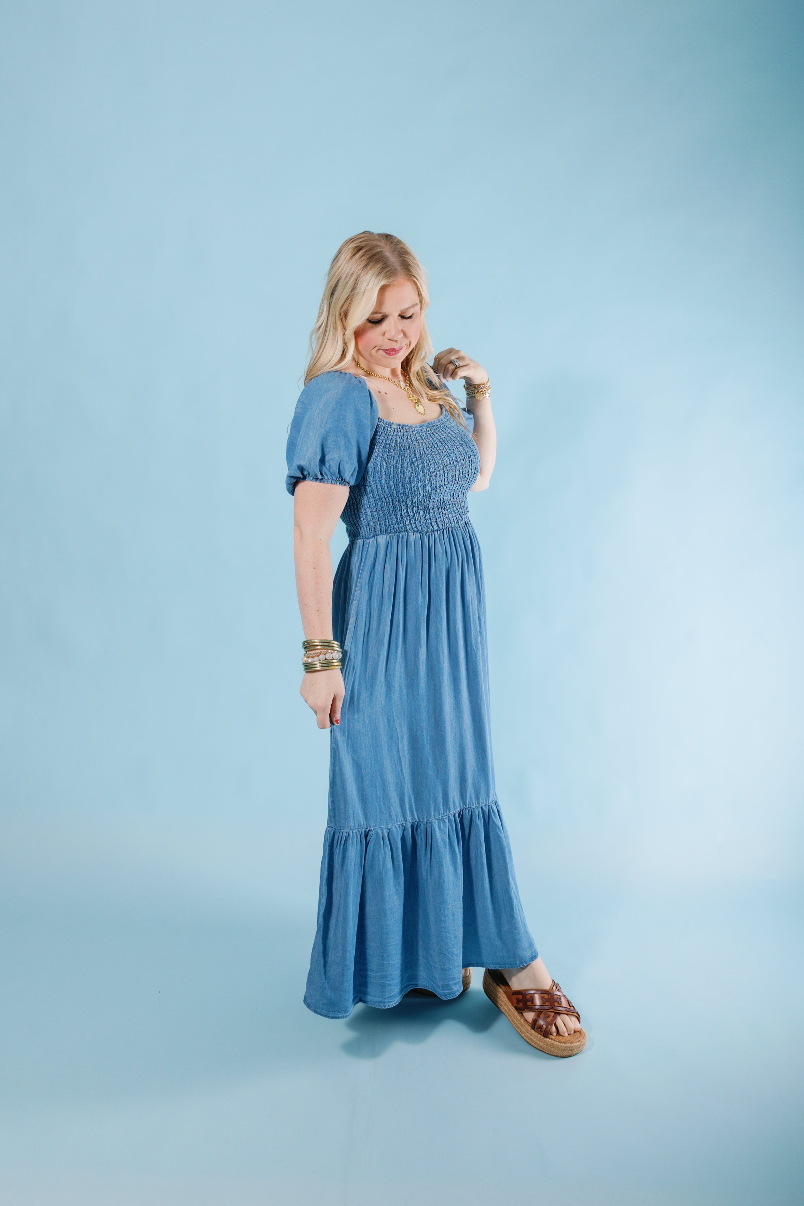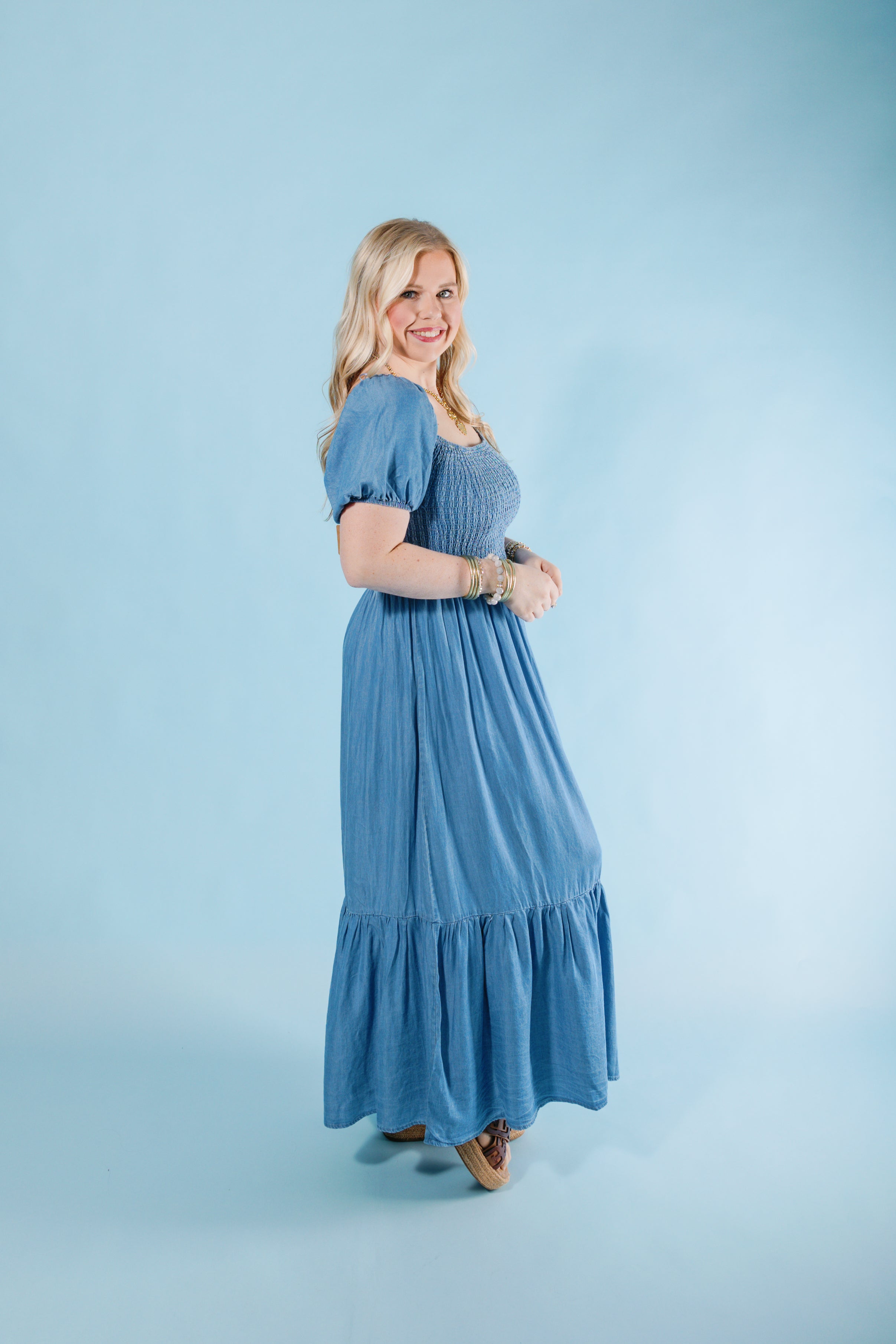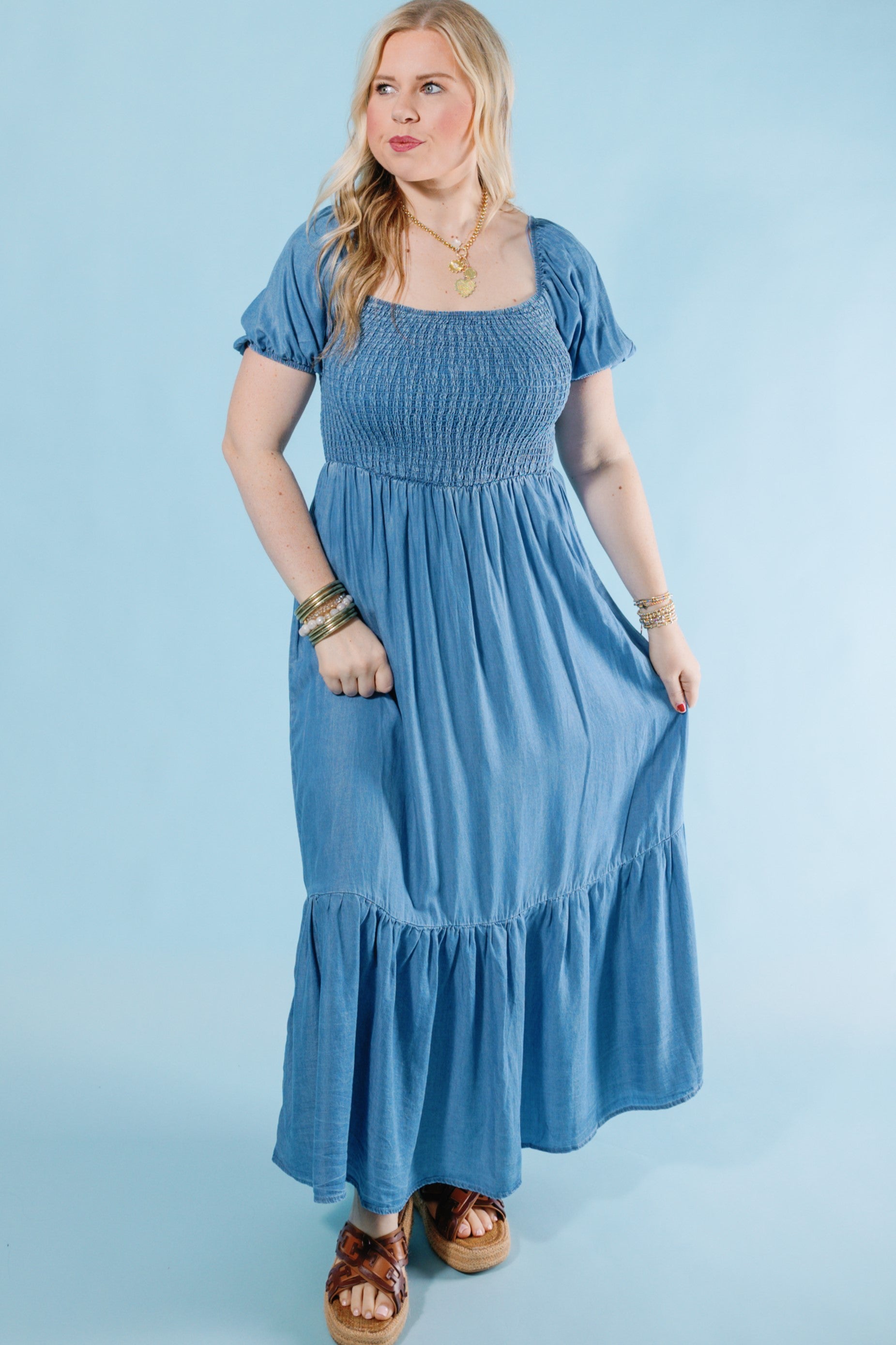 Embrace effortless charm with the Smocked Chambray Puff Sleeve Midi Dress. This whimsical dress features a square neckline and playful puff sleeves, adding a touch of fun to your wardrobe. The smocked bodice provides a flattering fit, while the ruffle hem adds a flirty finish. Crafted from 100% soft chambray lyocell*, this unlined midi dress is lightweight and breezy, making it perfect for any occasion where you want to feel stylish and comfortable.