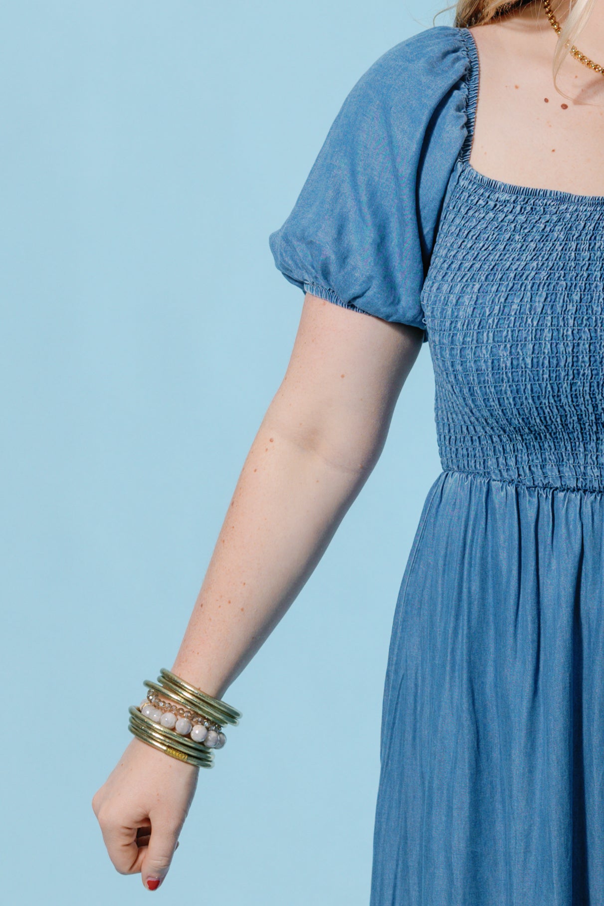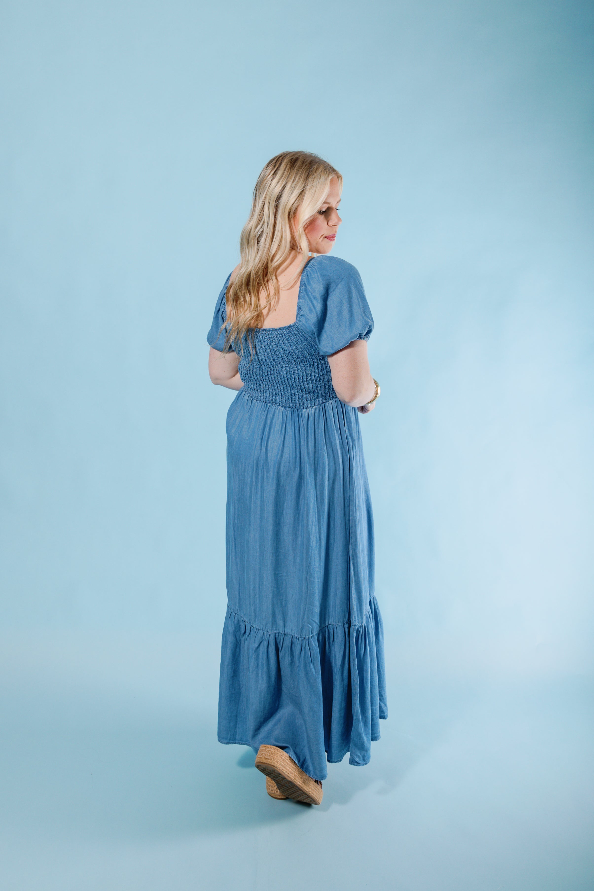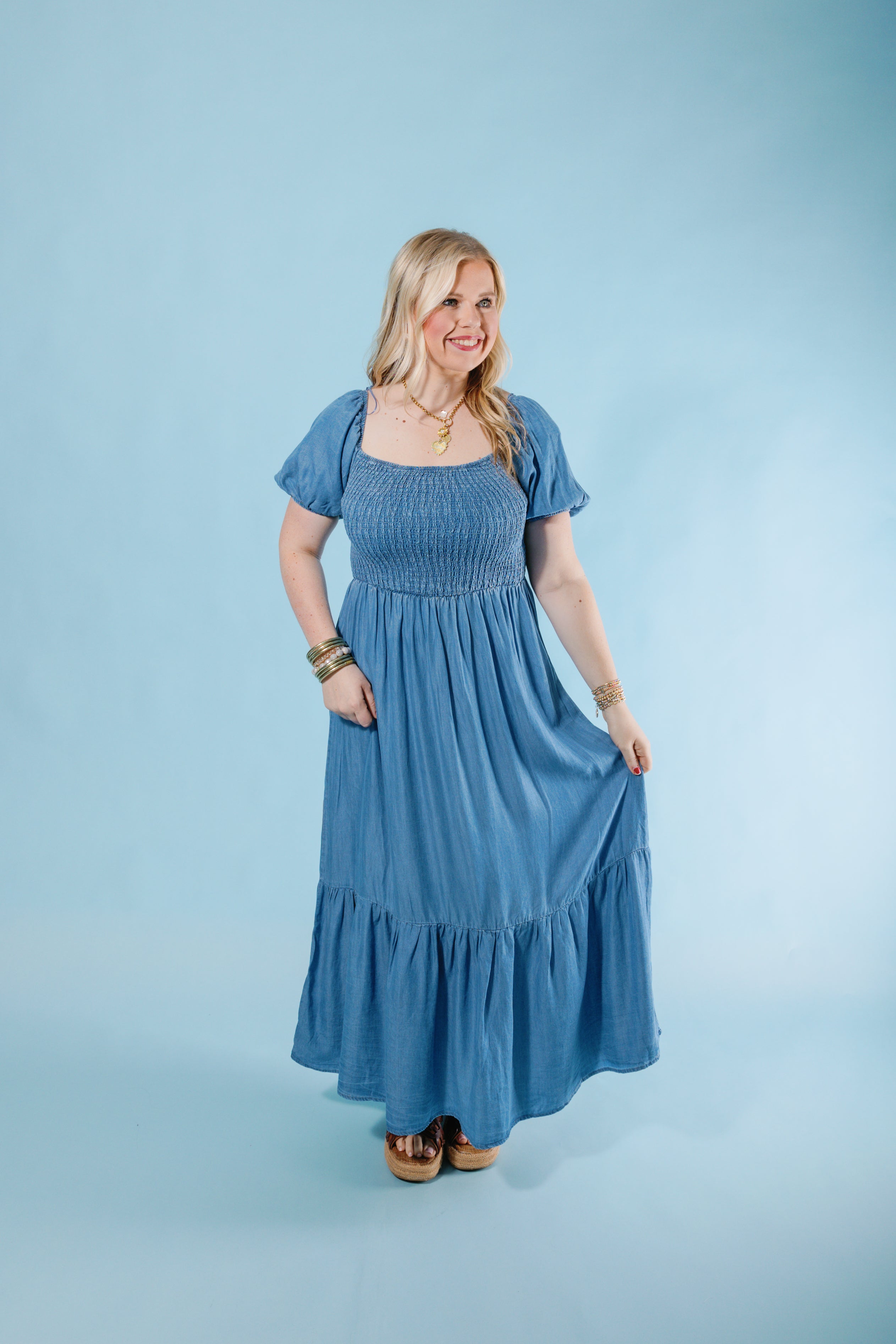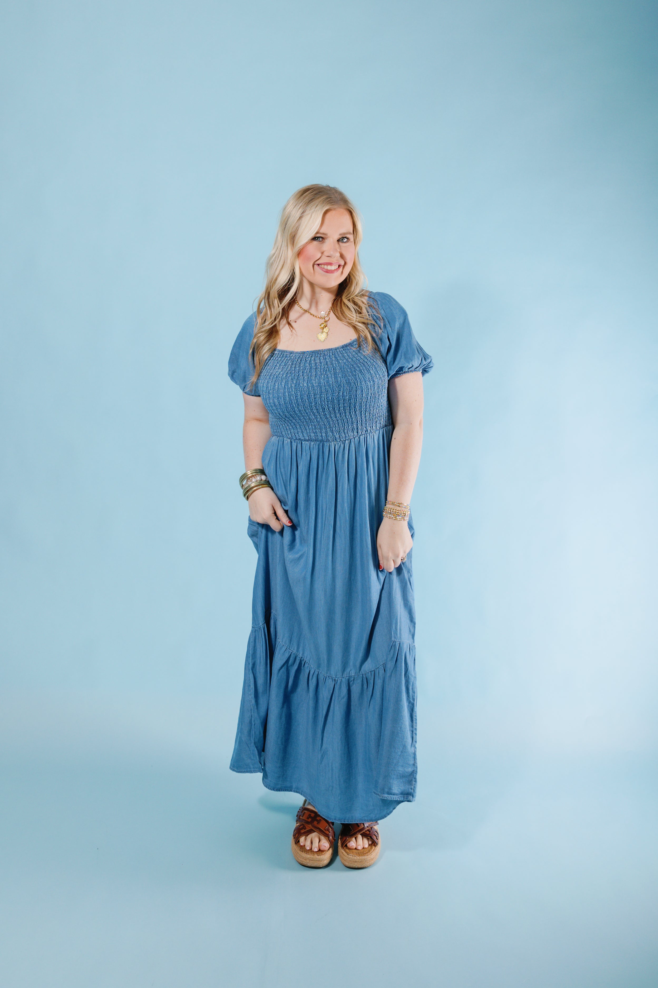 Embrace effortless charm with the Smocked Chambray Puff Sleeve Midi Dress. This whimsical dress features a square neckline and playful puff sleeves, adding a touch of fun to your wardrobe. The smocked bodice provides a flattering fit, while the ruffle hem adds a flirty finish. Crafted from 100% soft chambray lyocell*, this unlined midi dress is lightweight and breezy, making it perfect for any occasion where you want to feel stylish and comfortable.