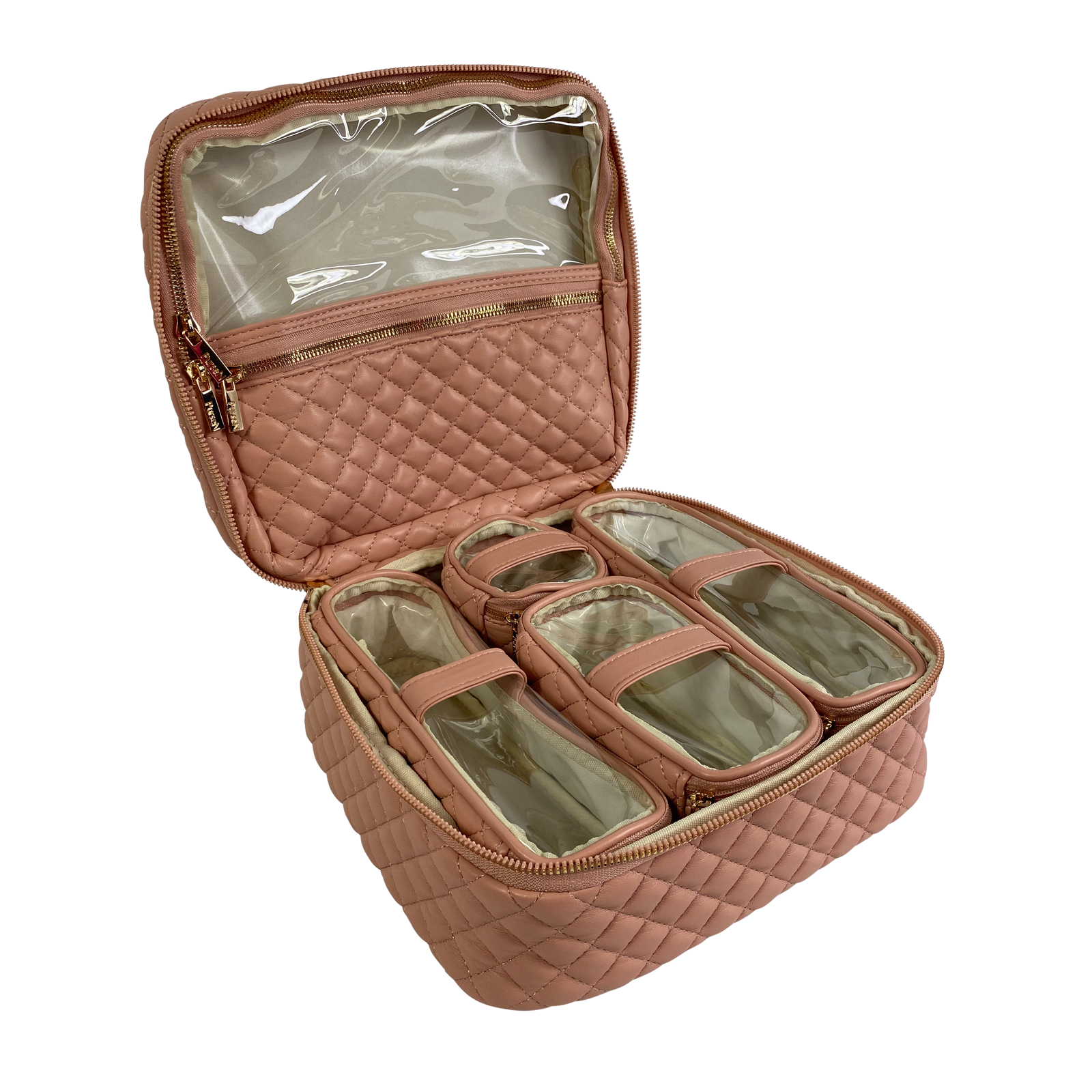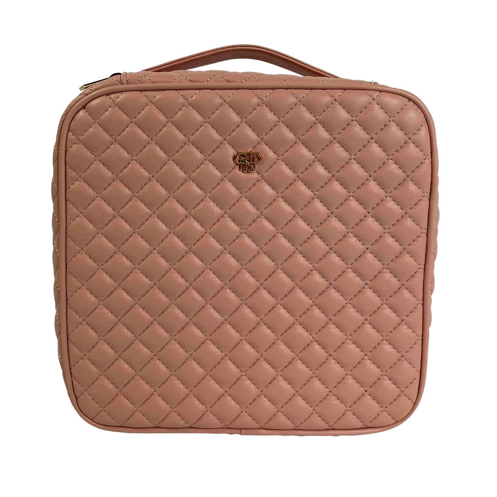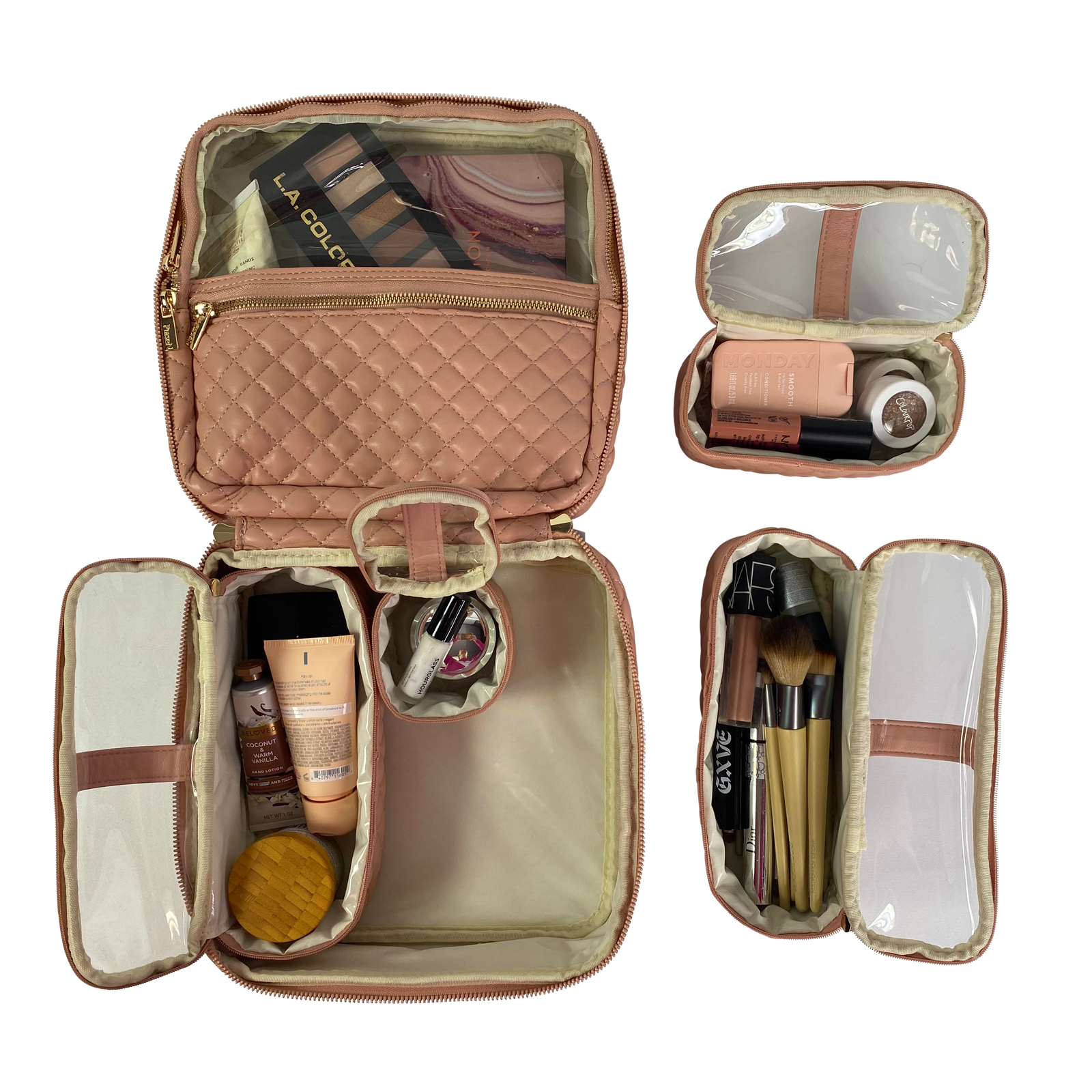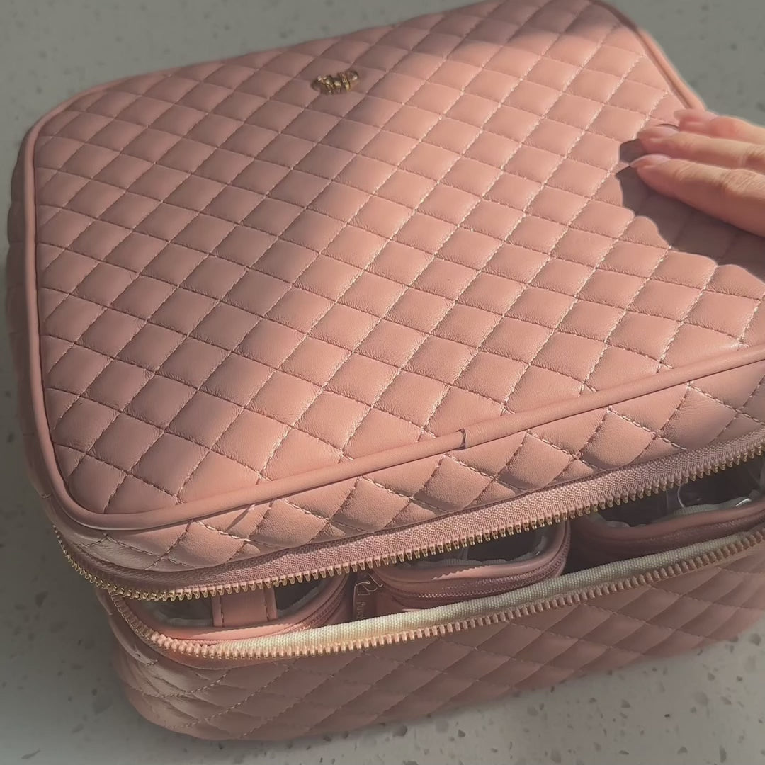 Our Pearl Quilted collection is a bridal favorite! The Mini Diva Makeup Case is a medium makeup case that is the ultimate organizer perfect for divas & jet setters with a lot to carry when they travel. This travel case has 4 removable cases idea for organizing eyeshadows, foundations, brushes, mascara, lipstick, powders & so much more.