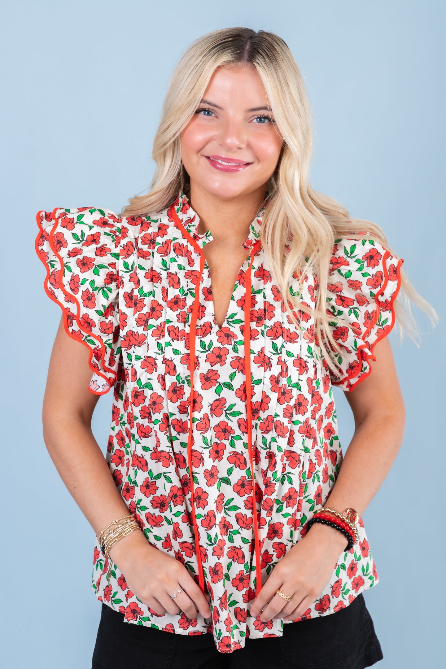 Stand out in style with our Roses Are Red Blouse! Featuring a beautiful floral print, pleated design, and scallop edge ruffle sleeves, this blouse is perfect for any occasion. The adjustable tie ruffle finish and round split v-neck add a touch of femininity. Made of lightweight and non-sheer fabric, it's comfortable and versatile. Go ahead, bloom with confidence!