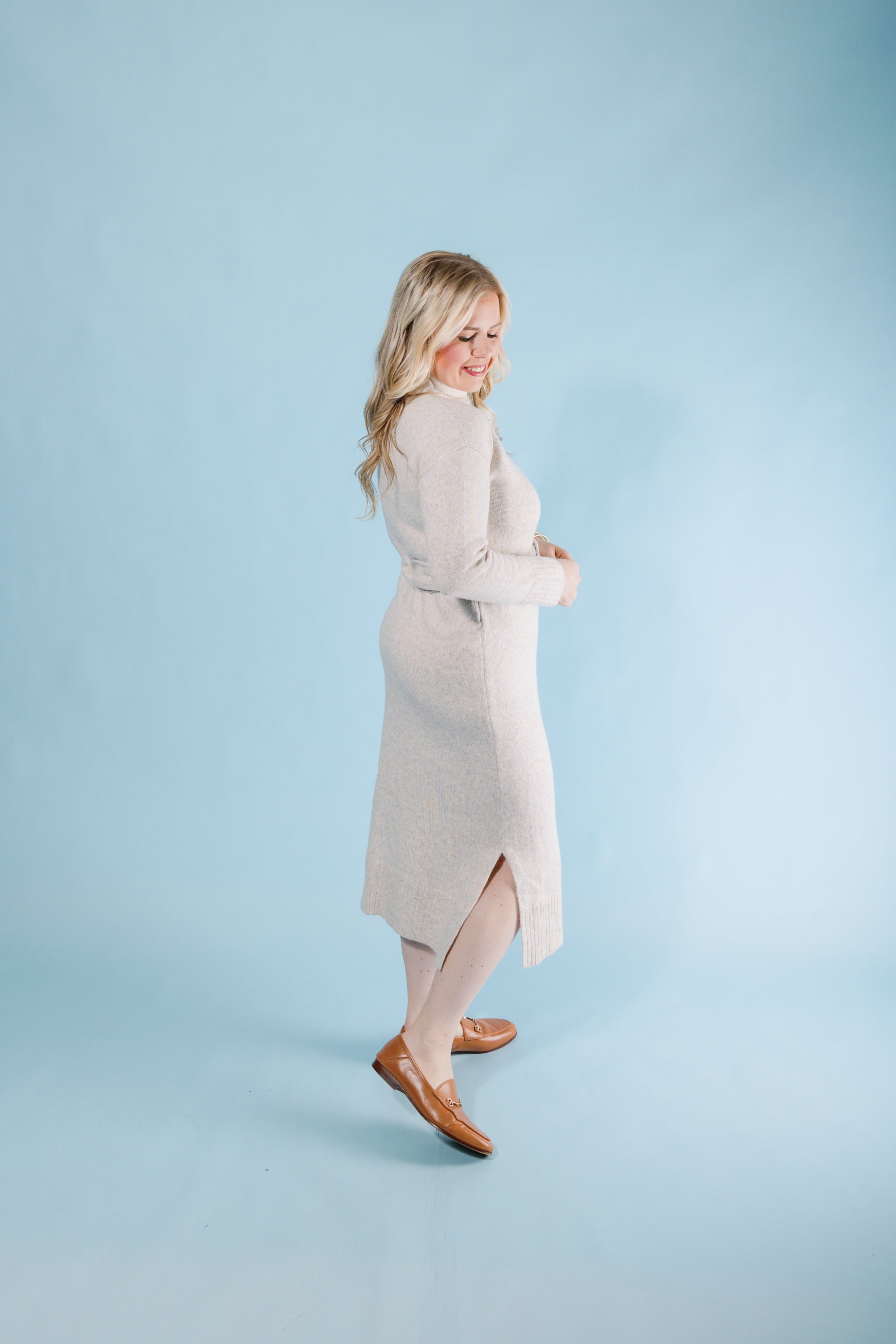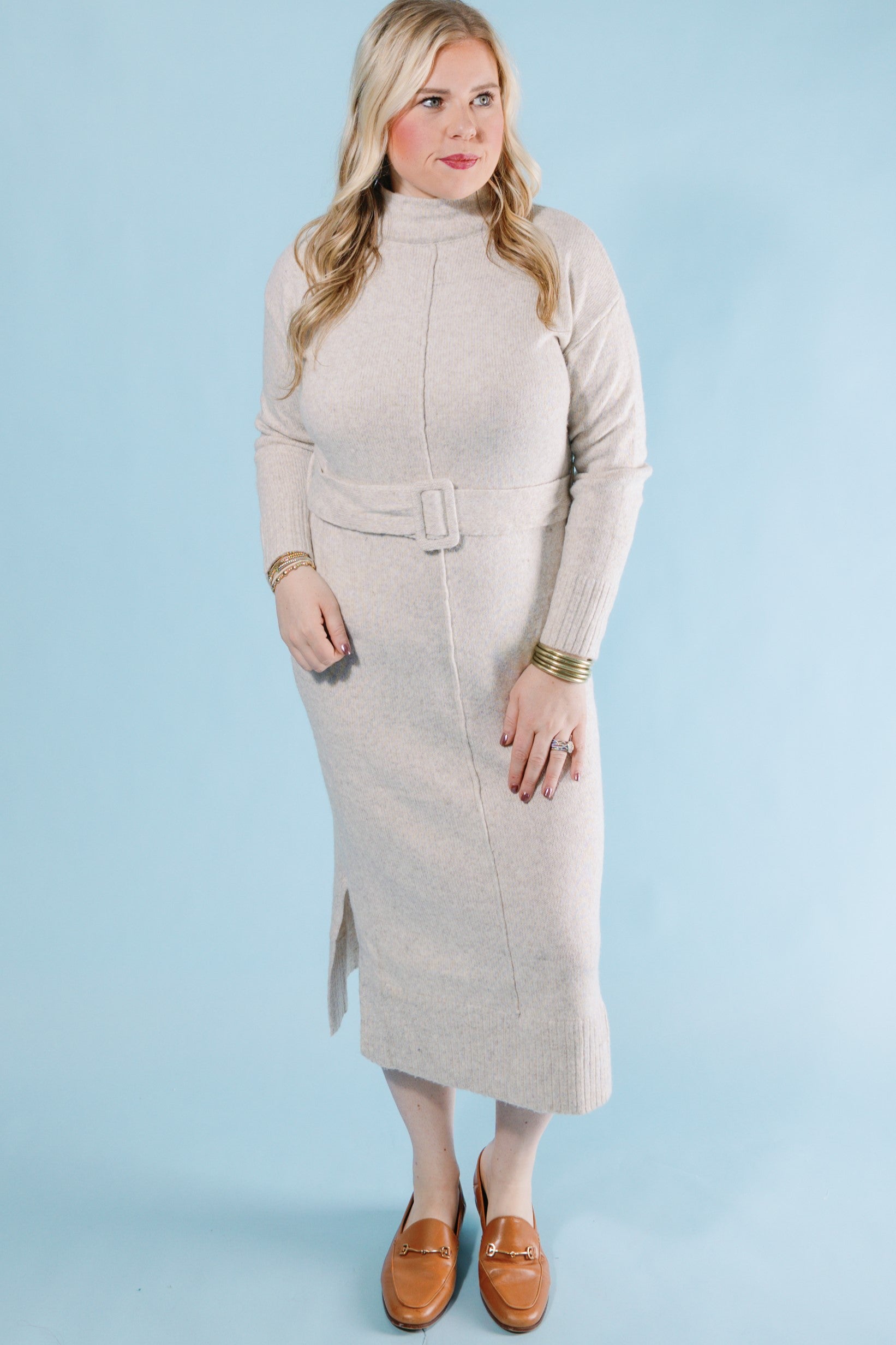 This cozy mock neck sweater dress combines warmth and elegance, featuring a soft knit fabric in a wool-blend that feels luxuriously soft to the touch. The belted waist cinches in to create a flattering silhouette, while the ribbed hem and long sleeve cuffs add subtle detailing. Perfect for cooler days, this dress offers a minimalist yet refined look that pairs well with boots or tights, bringing effortless style to your wardrobe!