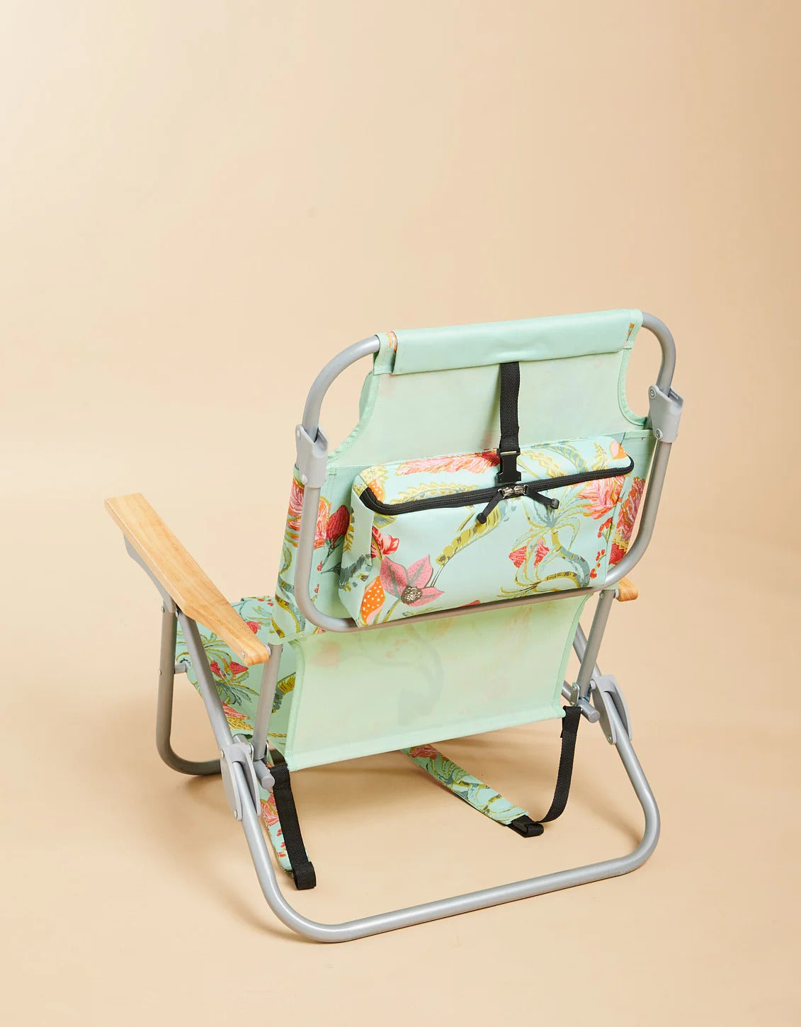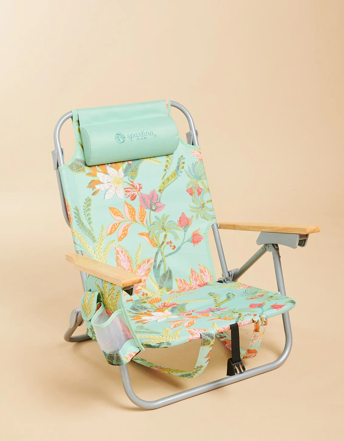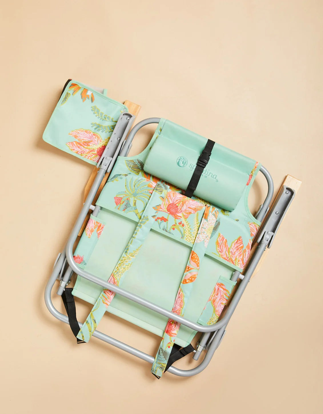 The views from the beach have never looked so good, and feel even better in our foldable Beach Chair. Made in an easy-to-rinse clean material, this bold palmetto frond patterned beach chair features a padded headrest, comfortable reclining ability, a cupholder, a phone pocket, backpack straps for easy transport, and an insulated cooler pocket. Soak up the sun and take in the sand with your new favorite beach necessity.