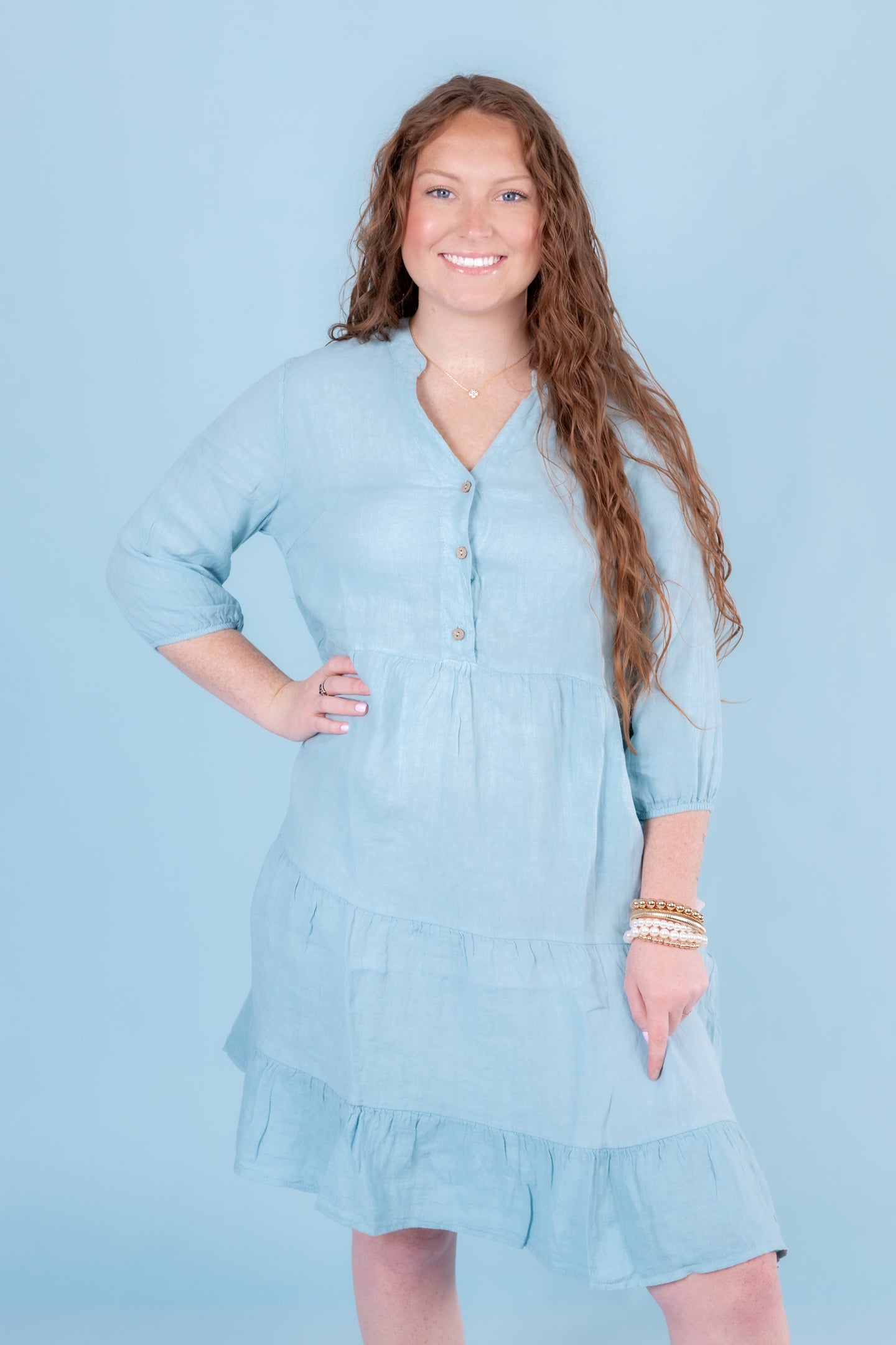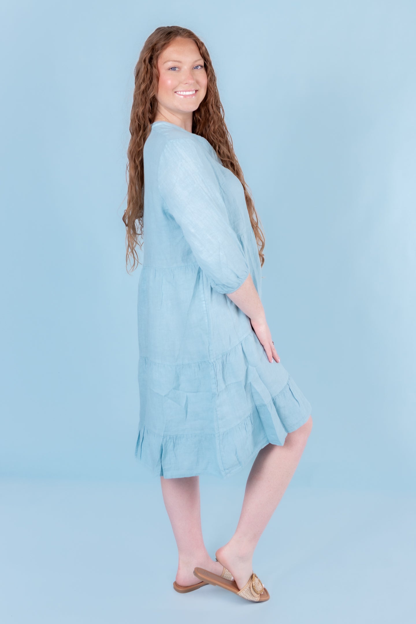 Perfectly balanced 3/4 sleeve linen dress. Loose fitting, comfortable and perfect for just about any occasion under the sun...or moon!