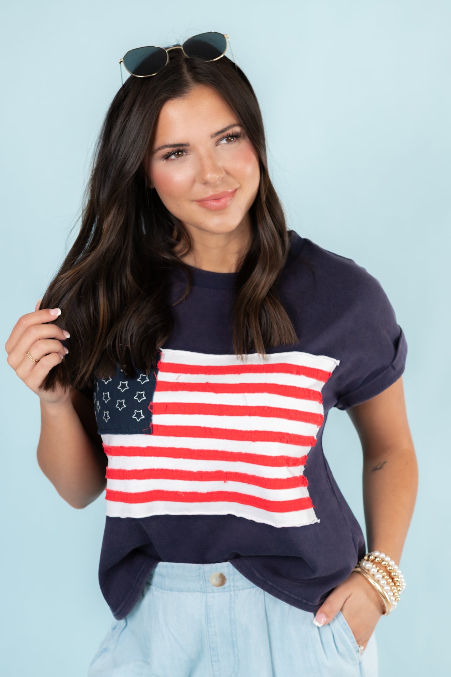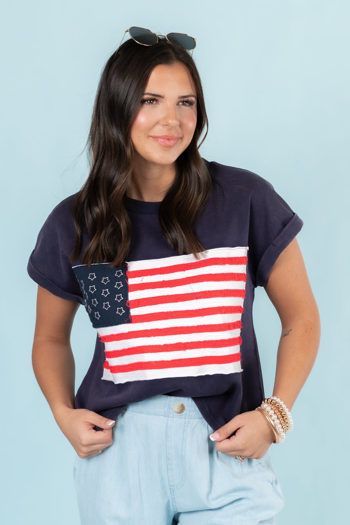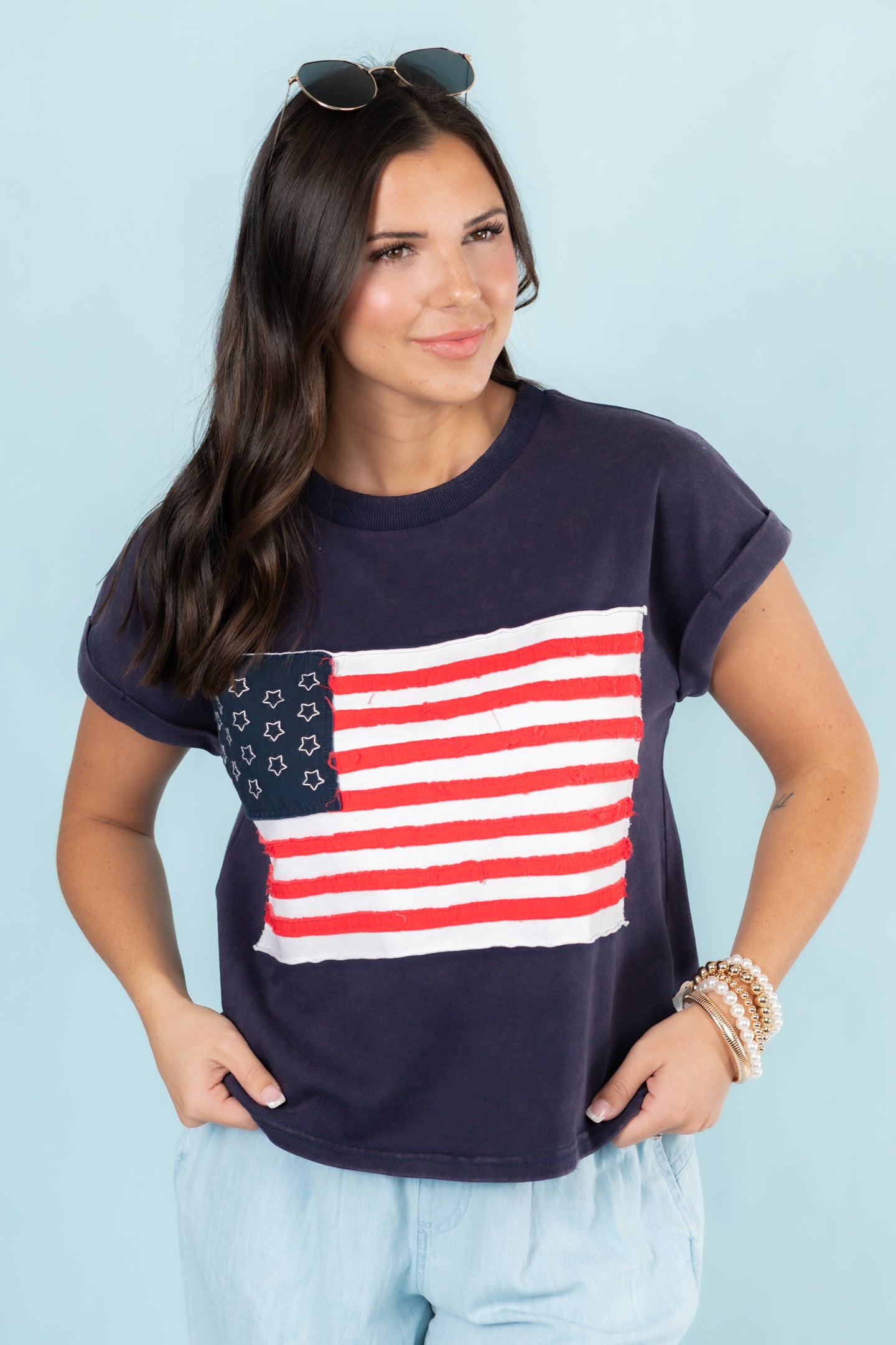 American flag patch top with U-neck, and cuffed short sleeves. Non-sheer, lightweight. 80% Cotton 20% Polyester