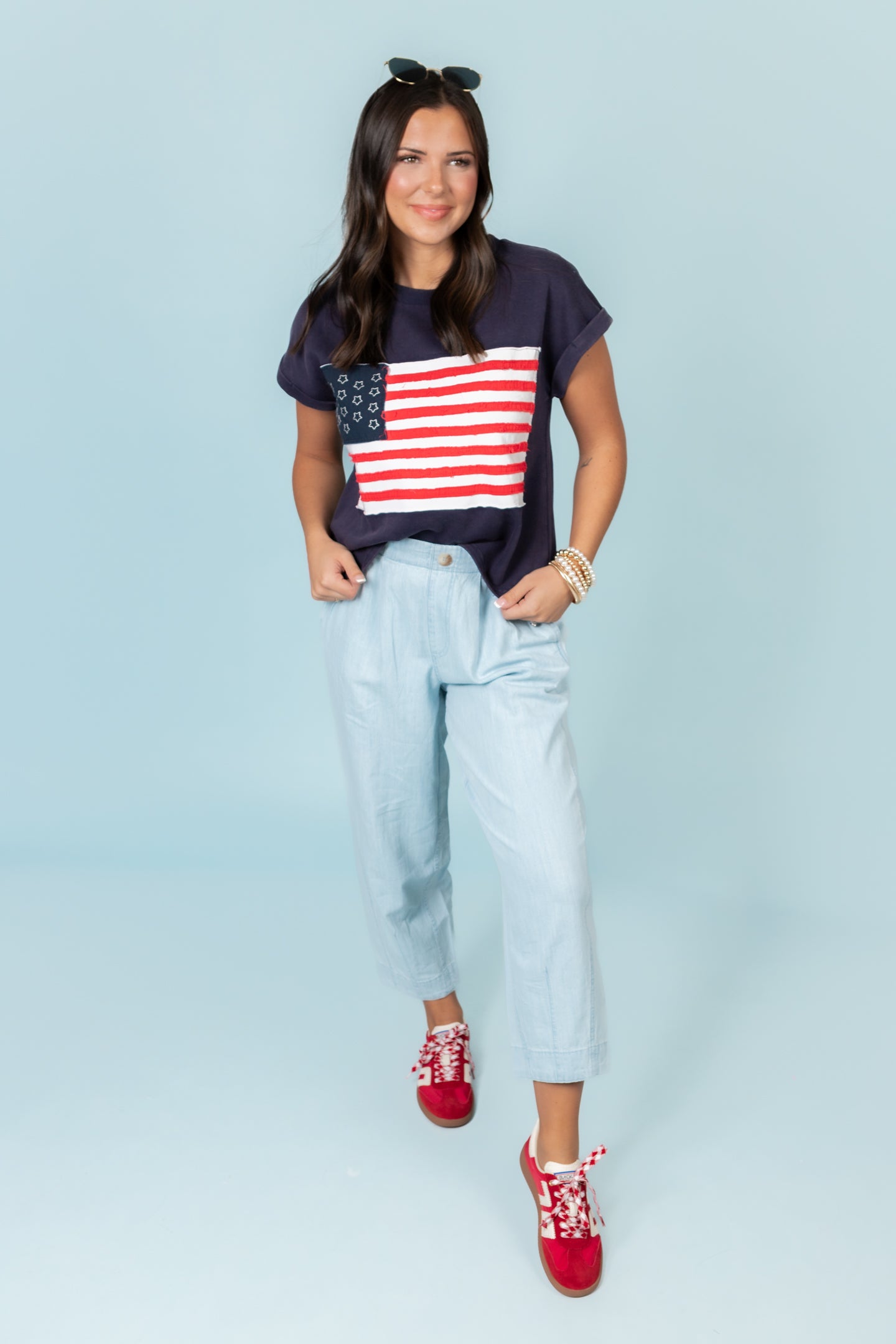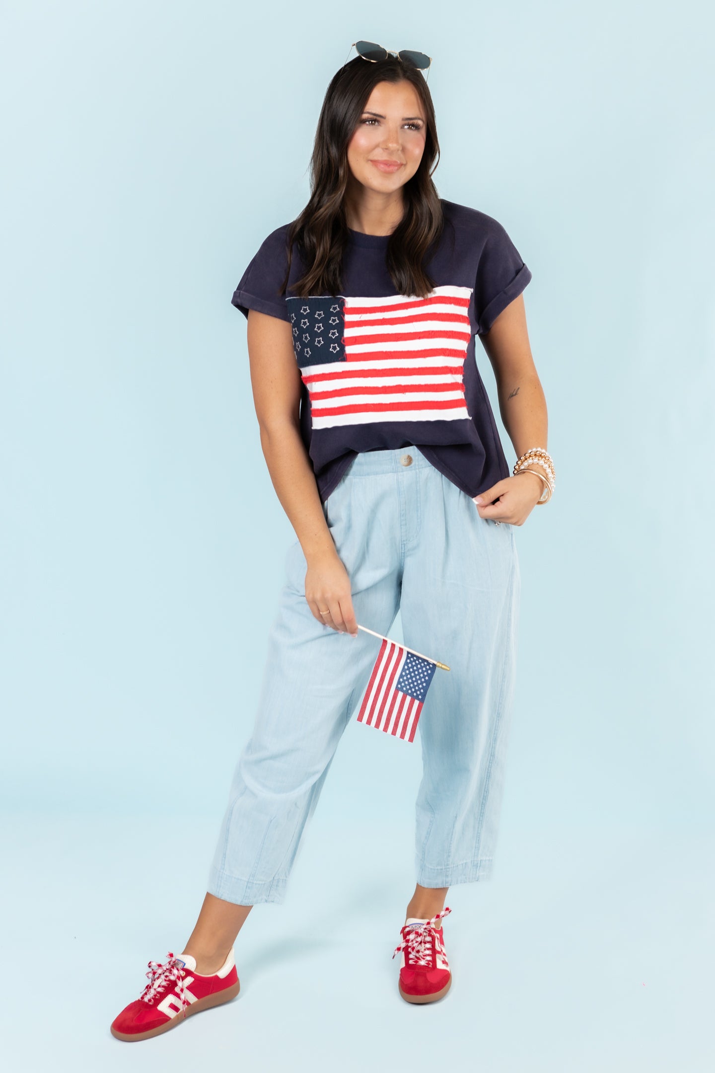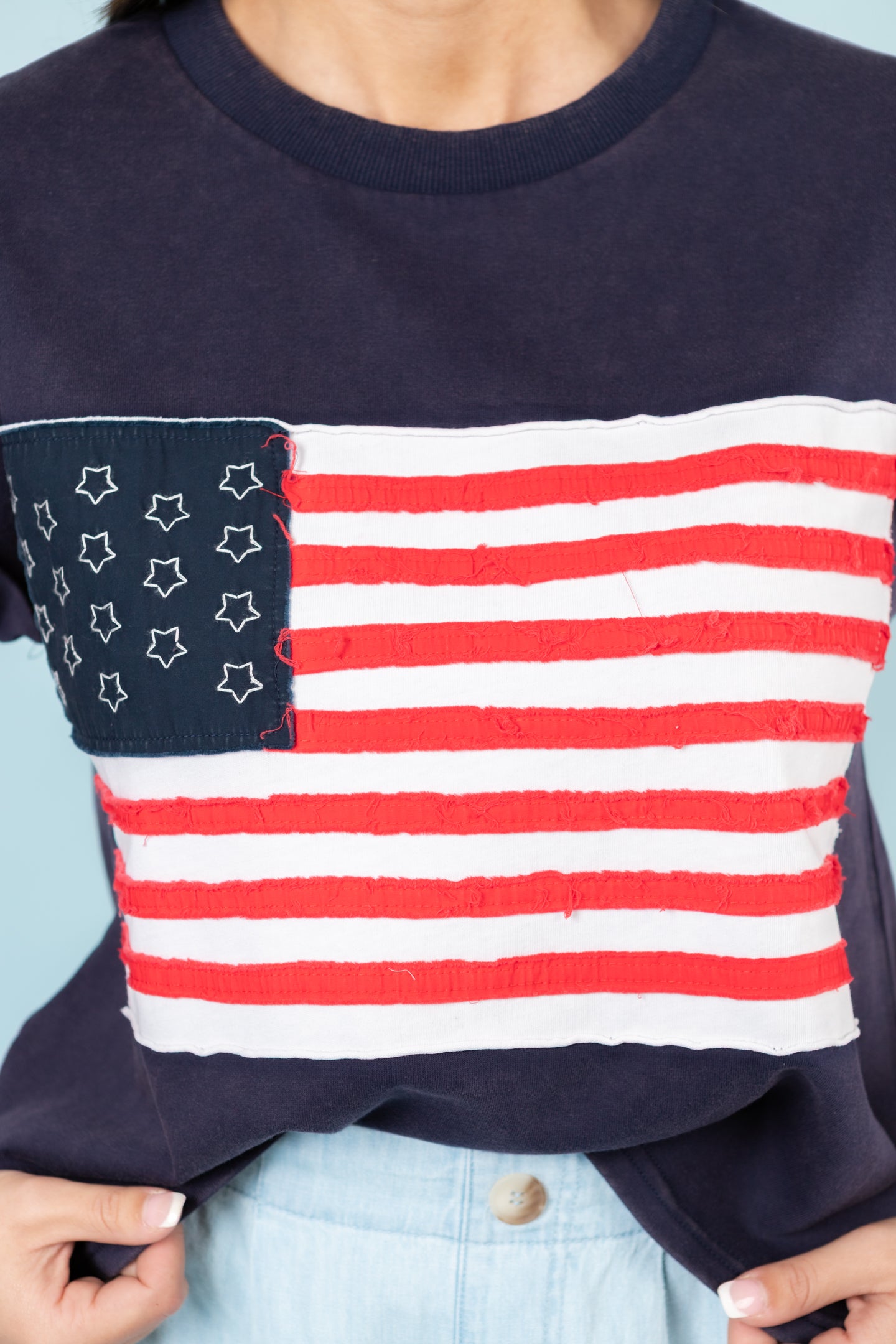 American flag patch top with U-neck, and cuffed short sleeves. Non-sheer, lightweight. 80% Cotton 20% Polyester
