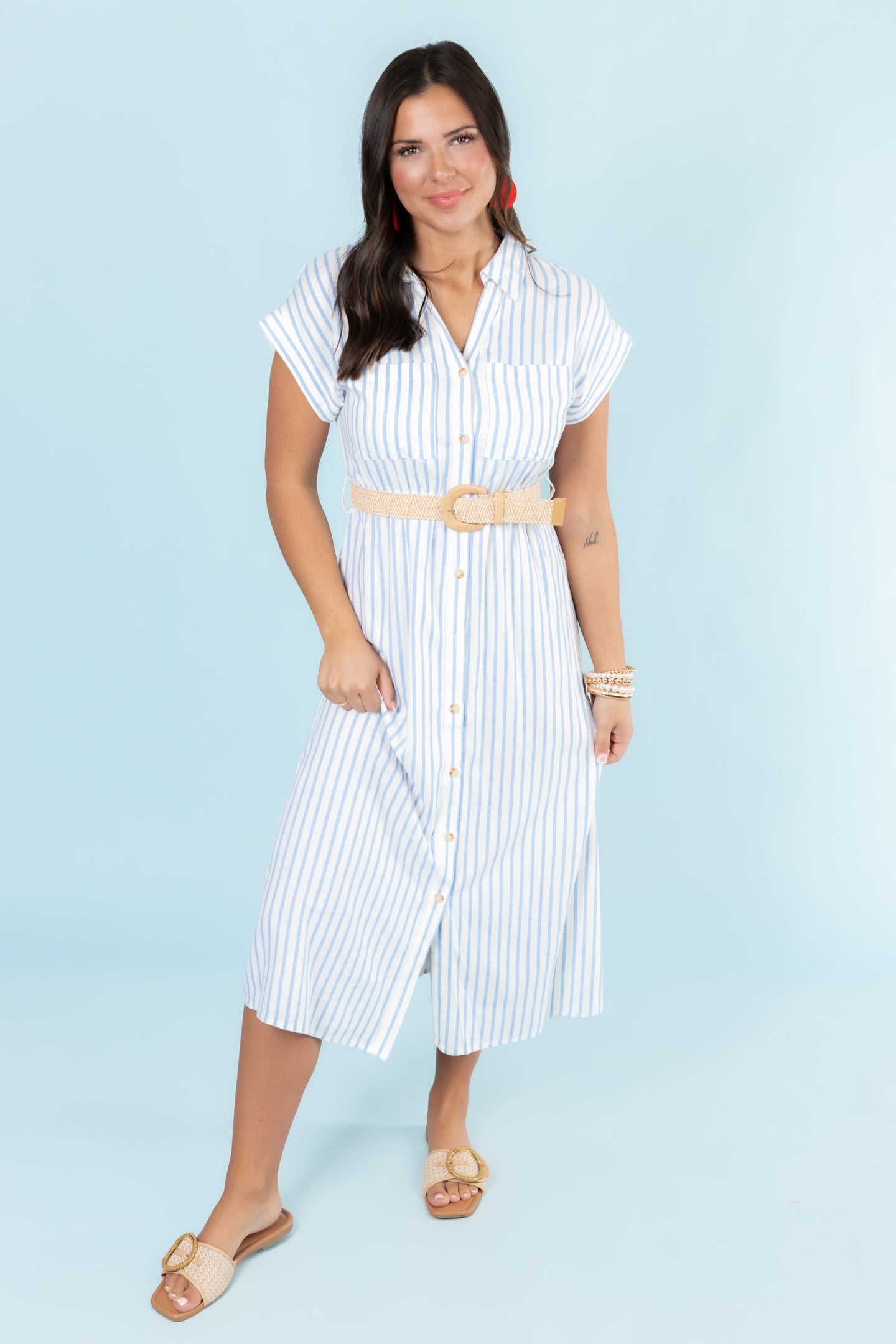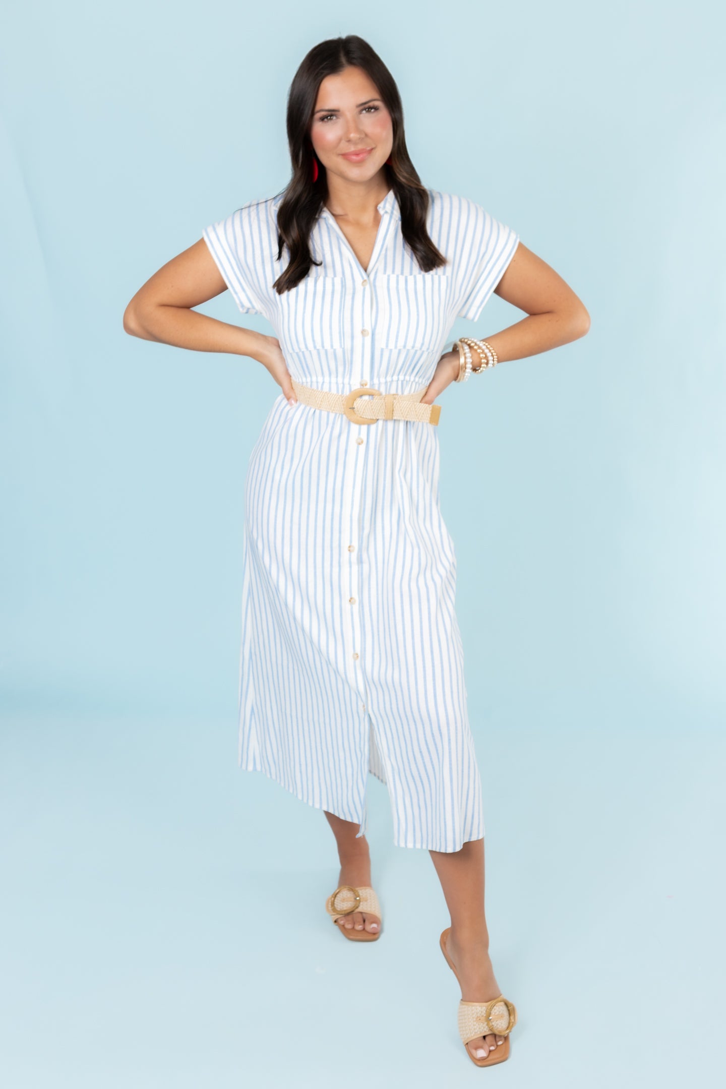 The Angelina Dress: a versatile striped midi shirt dress with a collared neckline. Features short and extended sleeves, a functional button-down design, and a belted waist with belt loops for a flattering fit. Made of a lightweight linen blend with convenient pockets. Elevate your wardrobe with this stylish and functional dress!