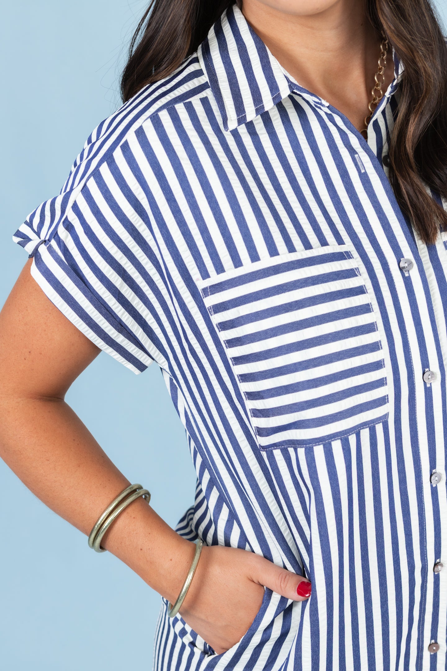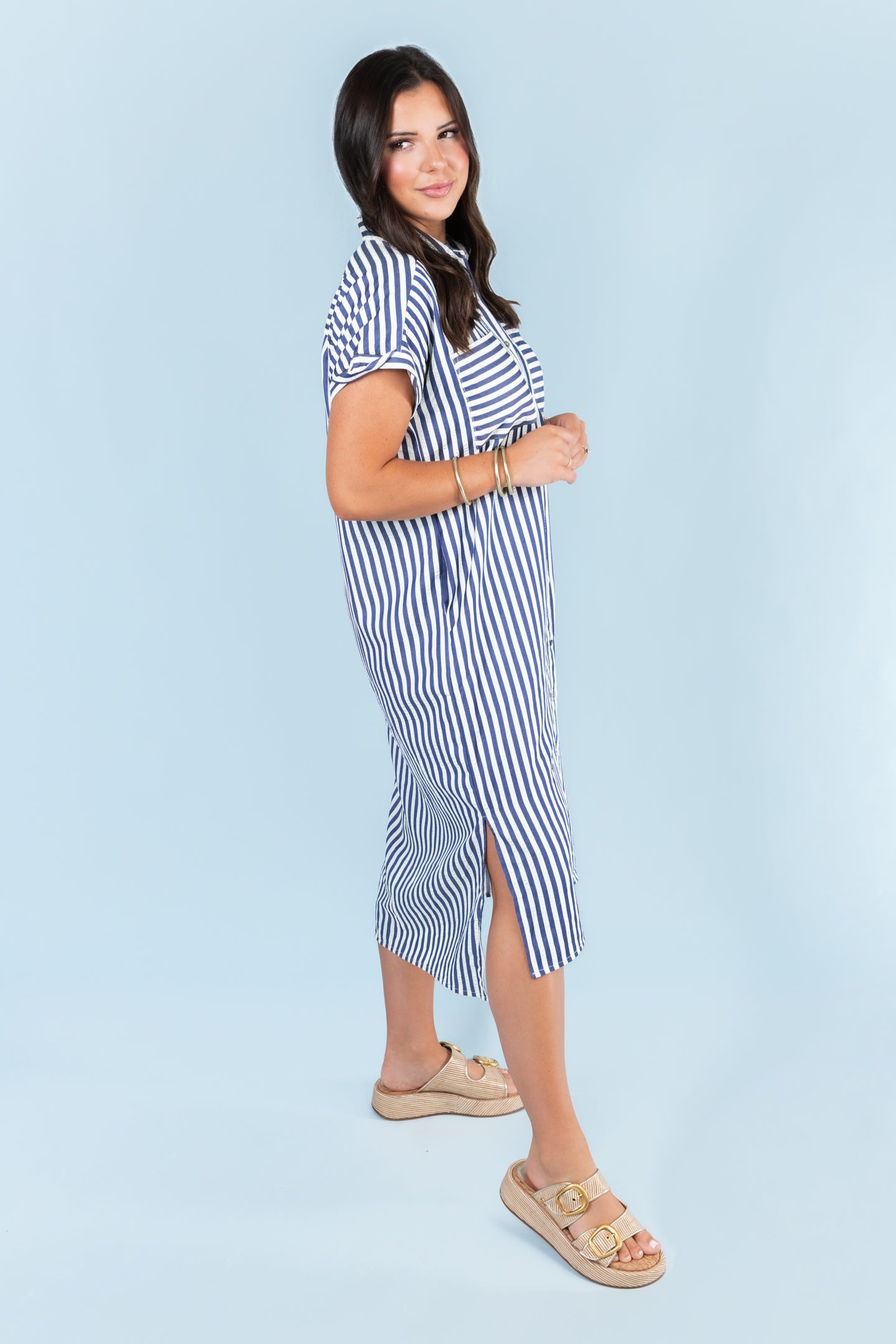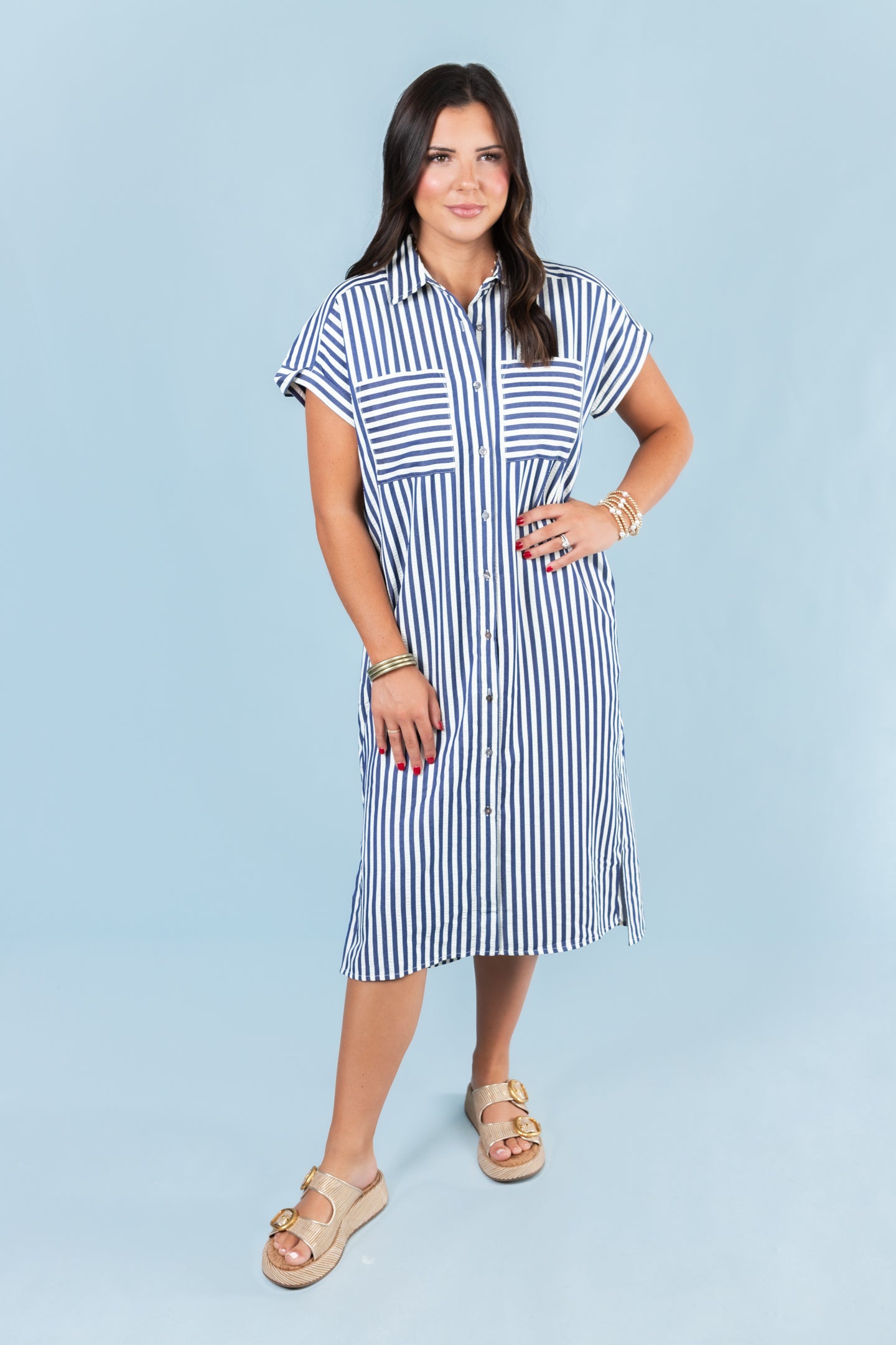 Get ready for a beachy day in our striped, off shoulder midi dress. Featuring side slits, a classic collared front with button closure, and pockets galore. Stay cool and comfortable with a lightweight, woven and lined design.