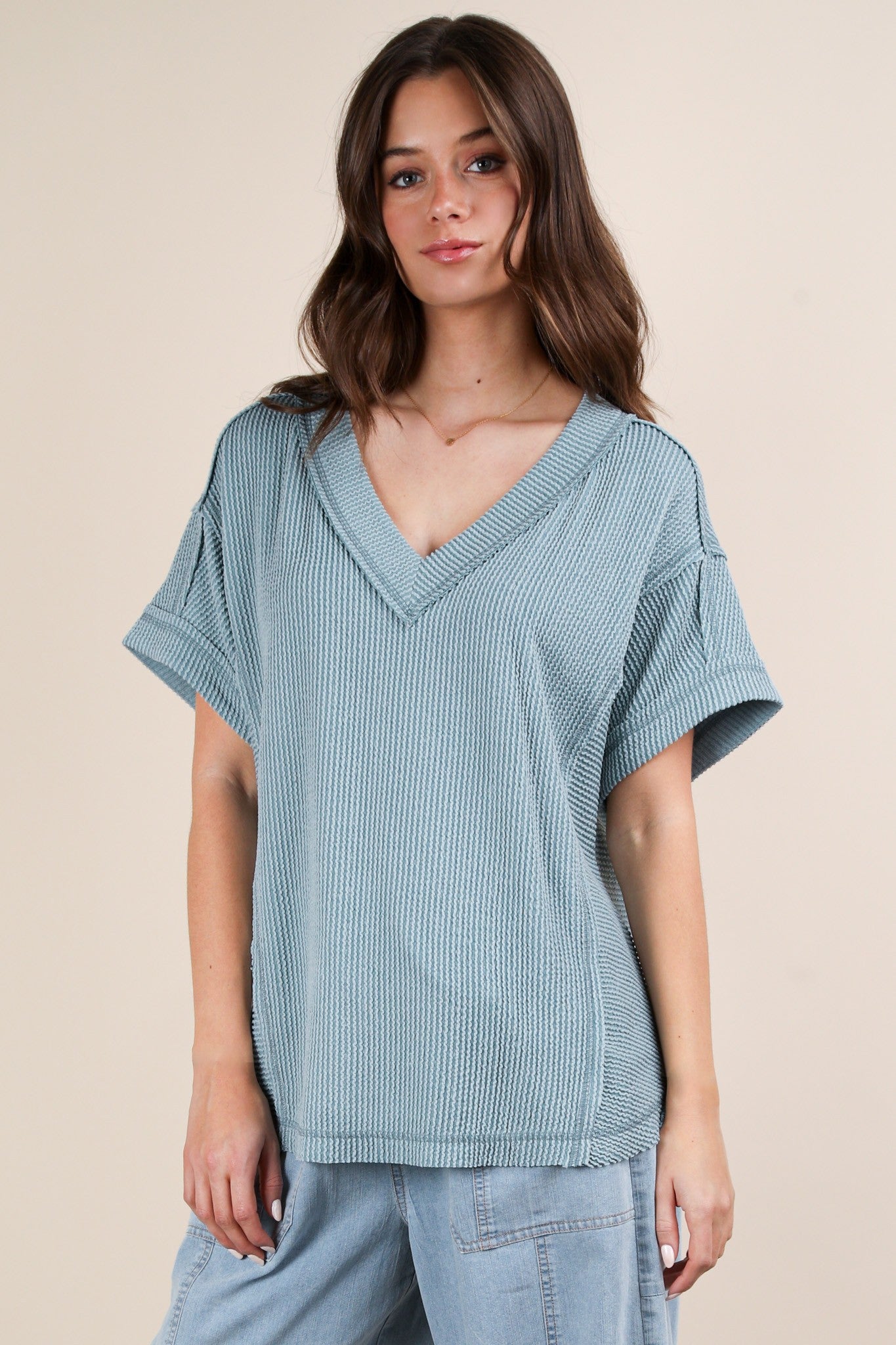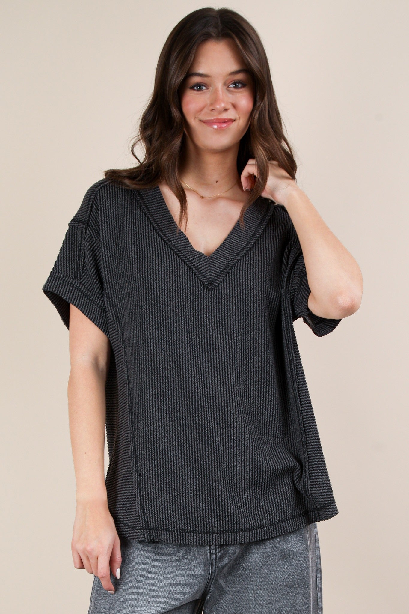 Elevate your wardrobe with the Callie Ribbed Top! Featuring a flattering V-neck and stylish short sleeves, this top also boasts a unique raw edge detail for added charm. Dress it up or down, this top offers versatility and comfort in one.