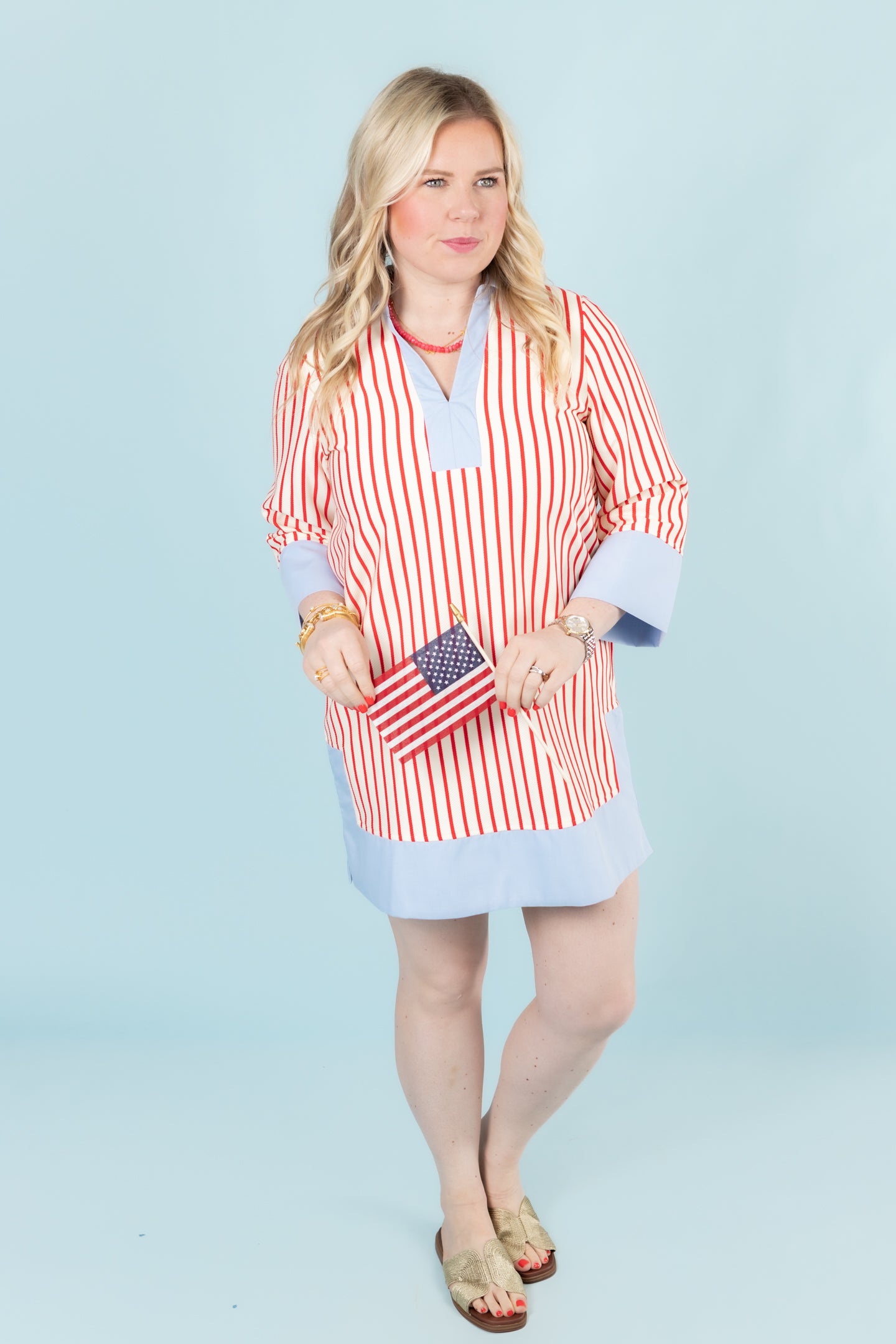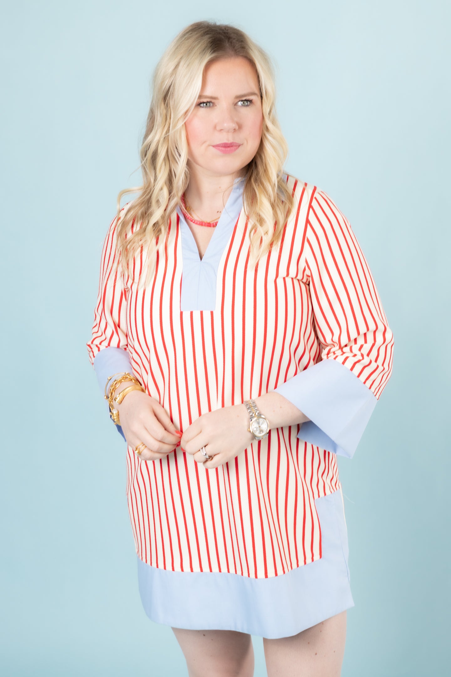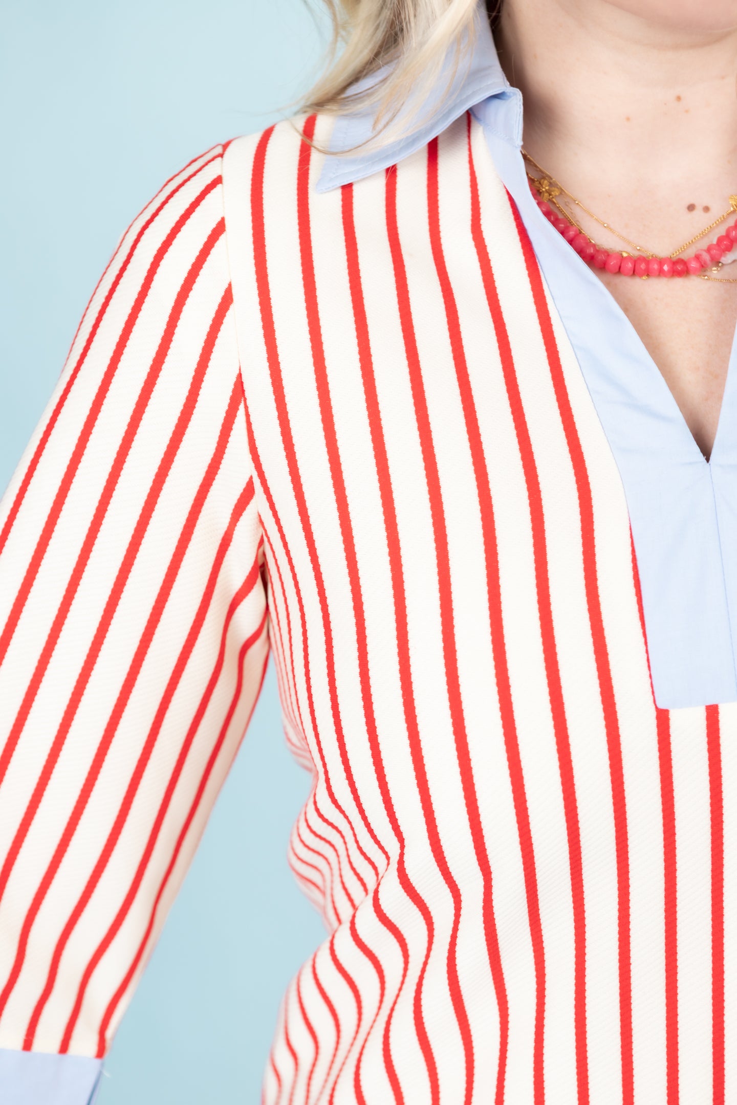The perfect dress for a flirty, fun and fashionable look! This Candy Stripe Mini Dress features a playful striped design with a split v-neck collar and contrasting sleeves. The wide contrasting band finish adds a touch of uniqueness to this lightweight and comfortable shift dress. Dress up or down for any occasion.