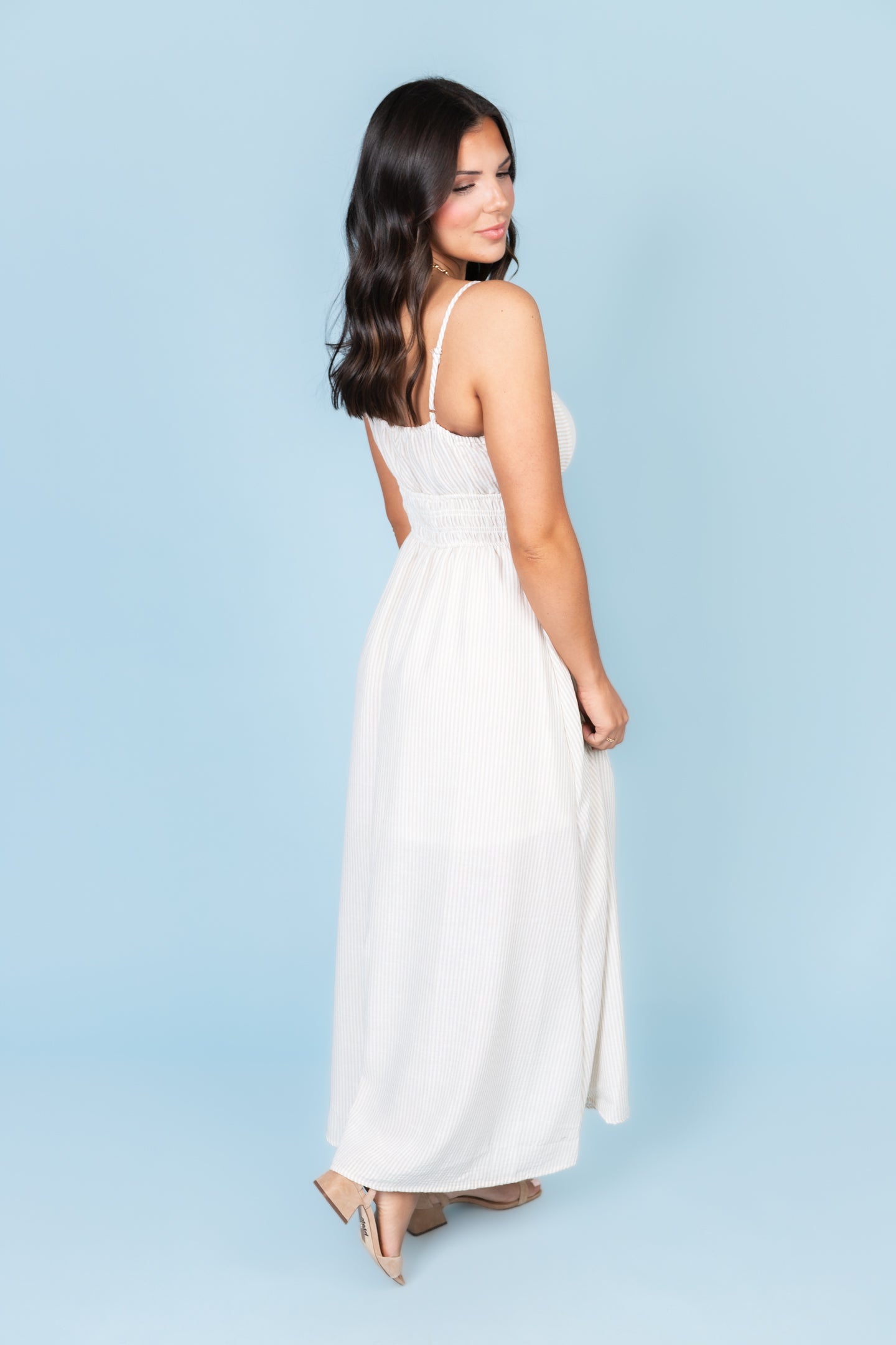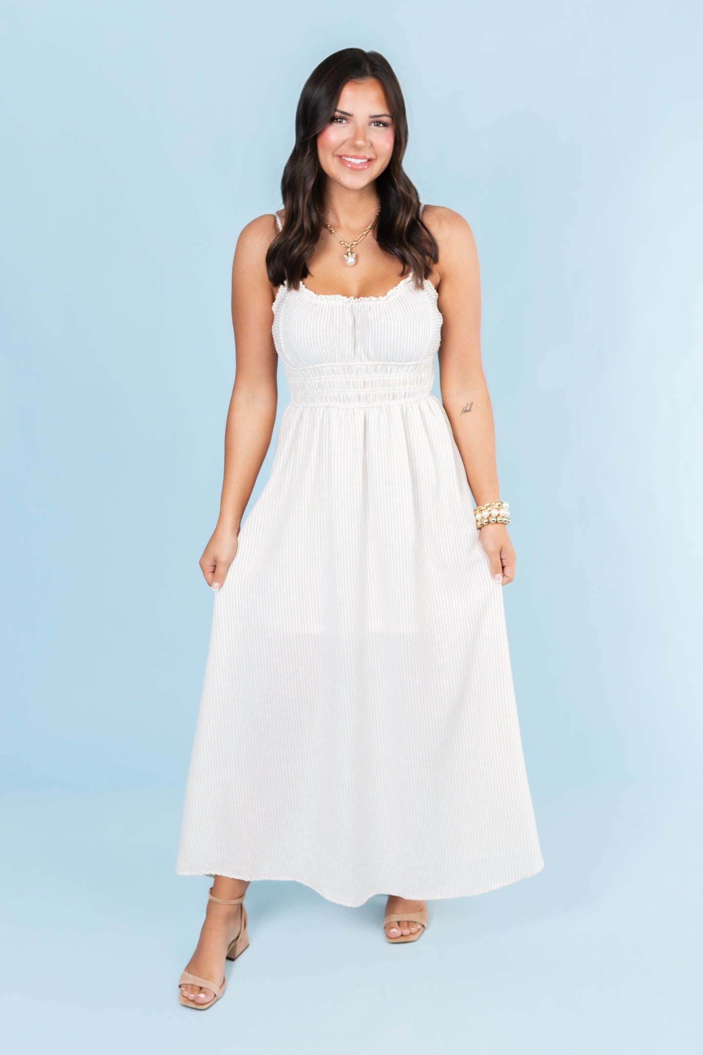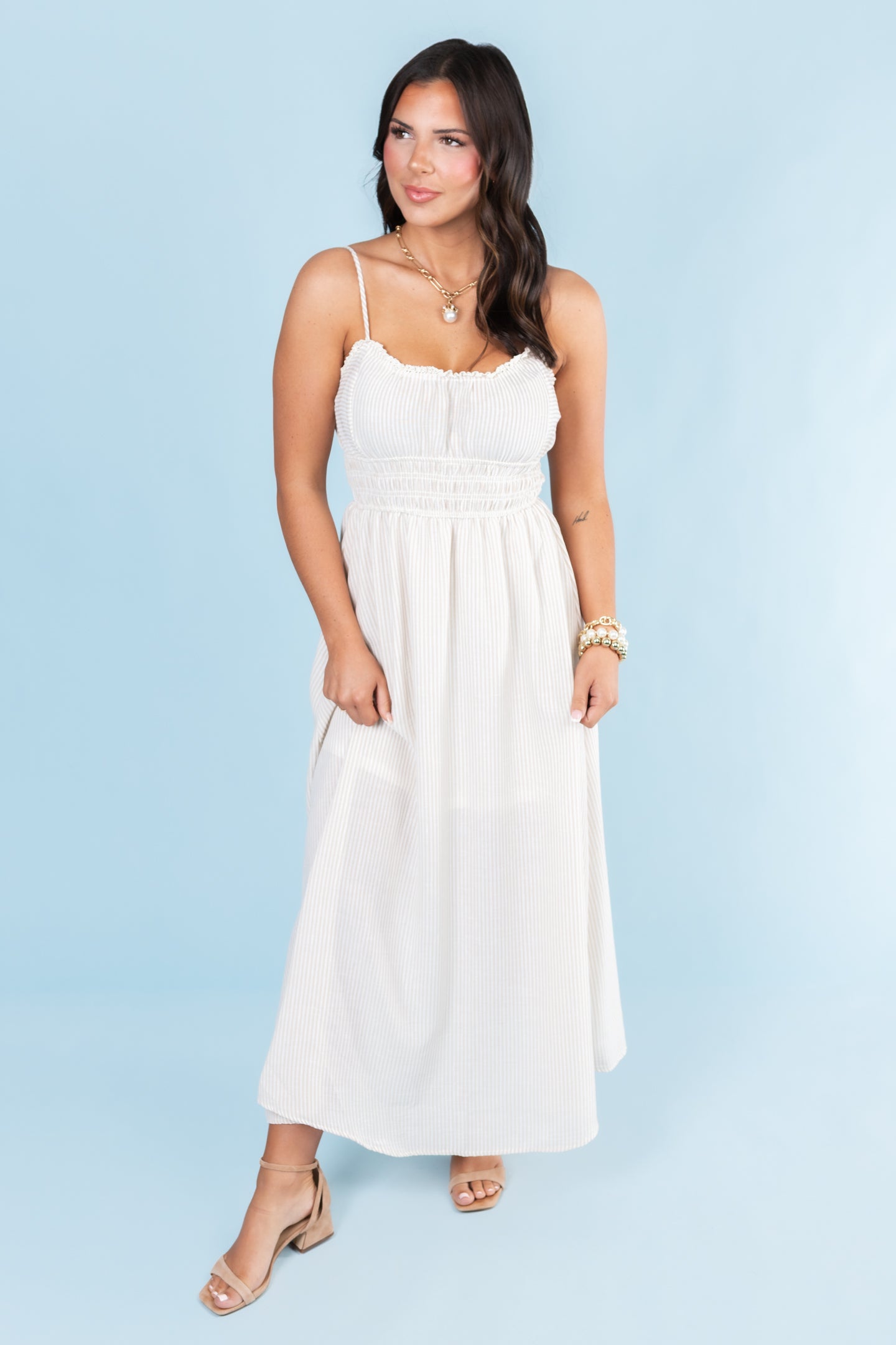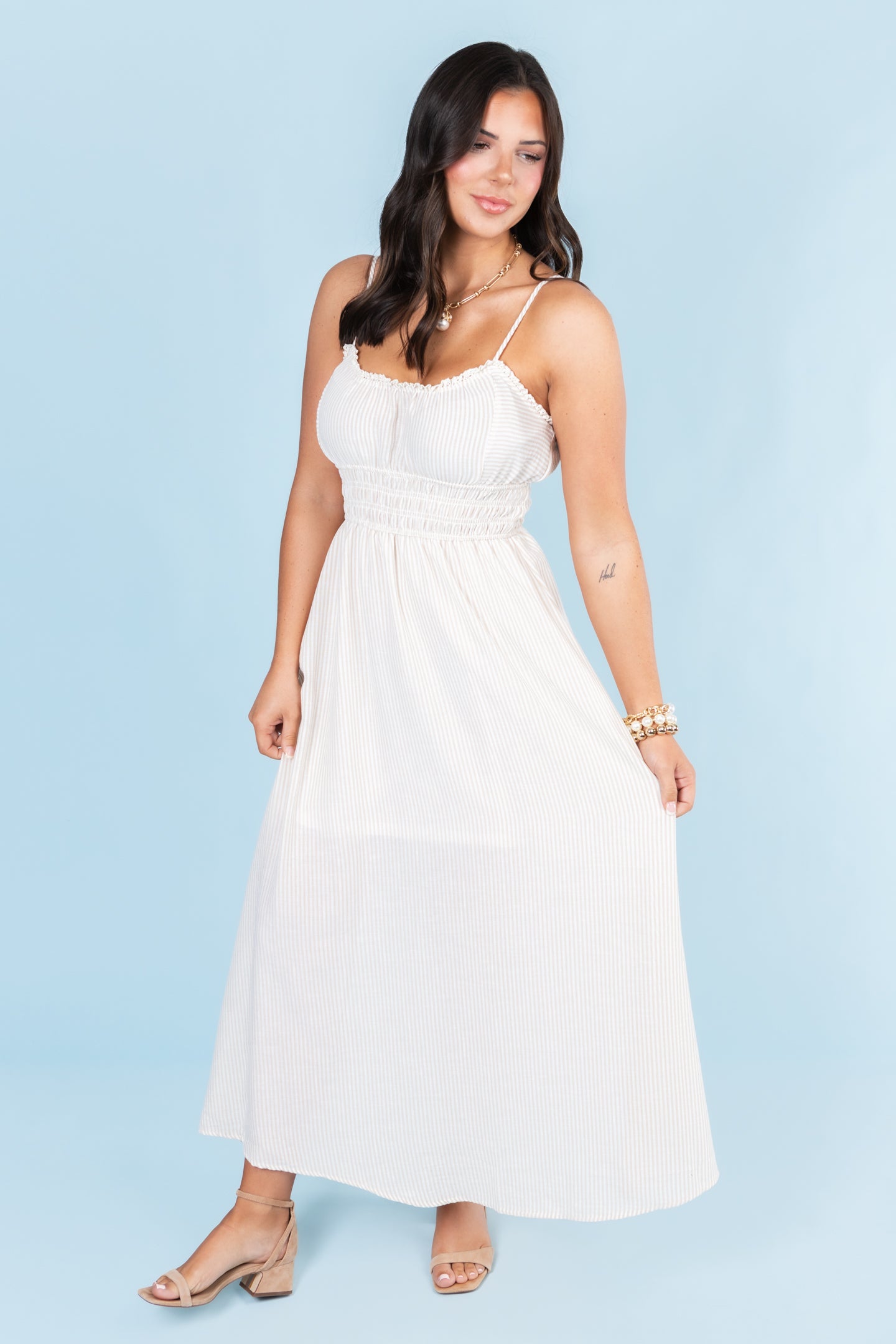 Experience the perfect mix of comfort and style with The Coastal Love Midi Dress. This stunning Stripe Lace Trim Spaghetti Strap Midi Dress is the perfect addition to your wardrobe, offering a flattering fit and beautiful design. Be ready to turn heads and make a statement wherever you go!