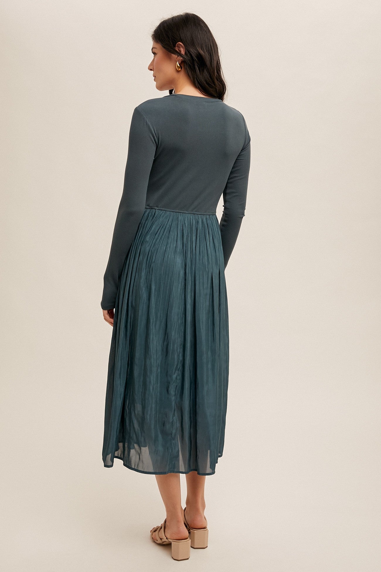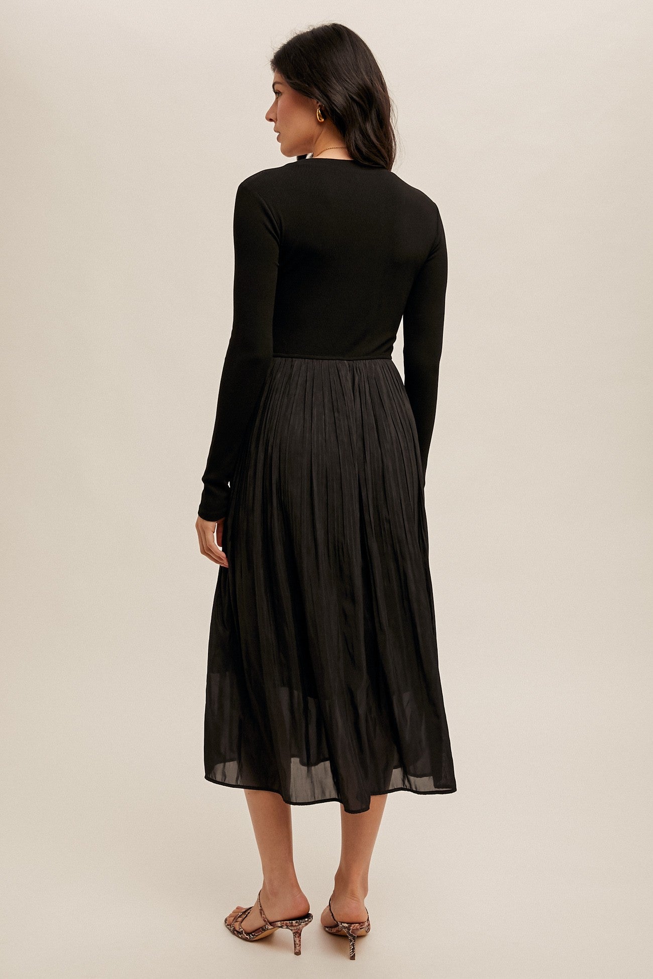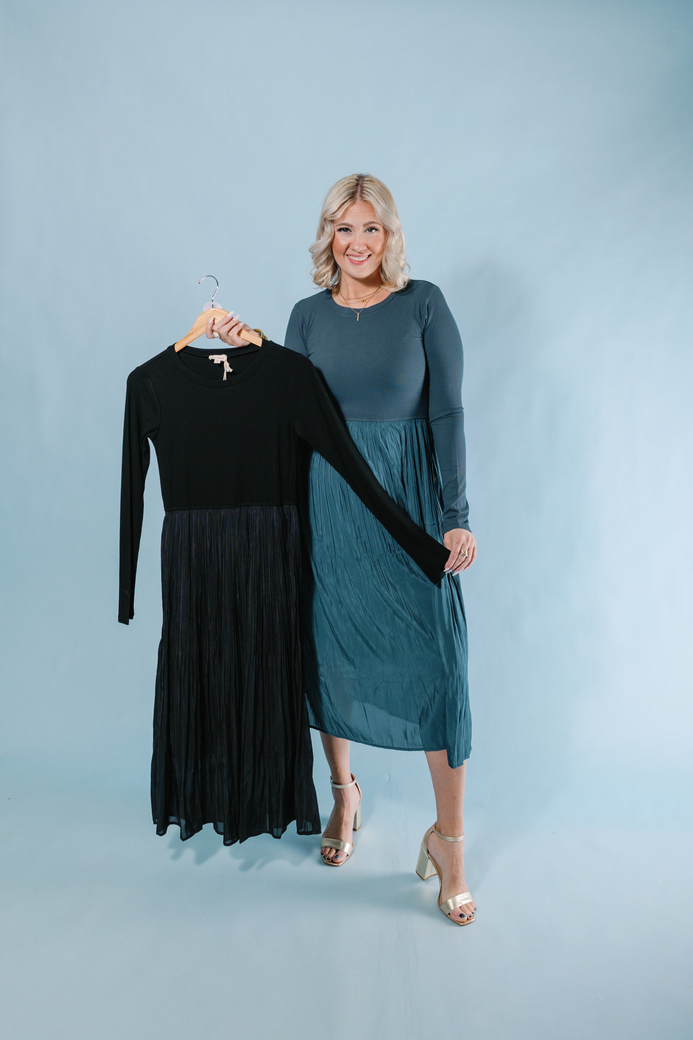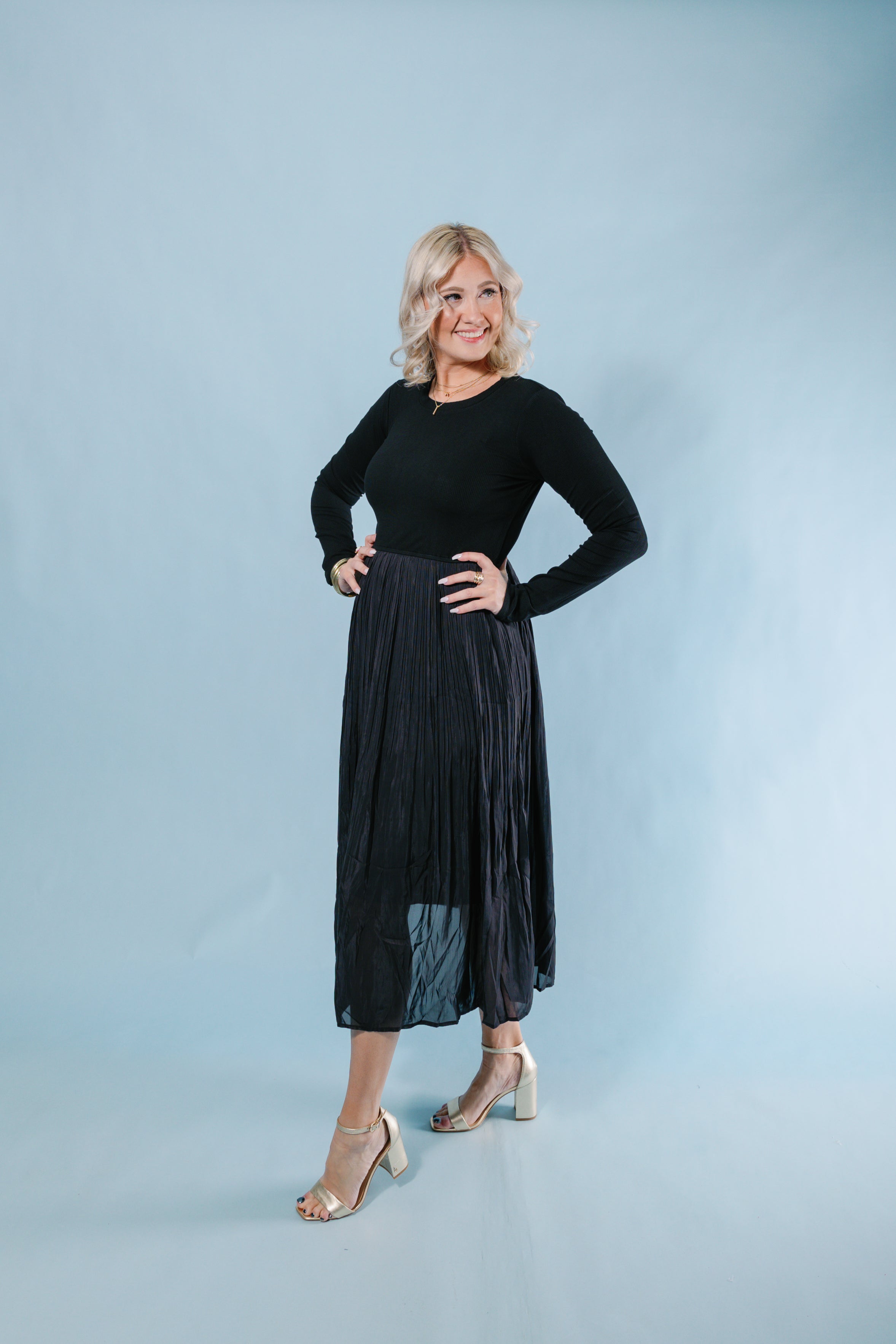 Stay cozy and stylish on cooler nights with our Cooler Nights Midi Dress. This knit dress features long sleeves and a pleated skirt with a lining, keeping you warm and chic. The ribbed details add a touch of texture to this must-have piece.