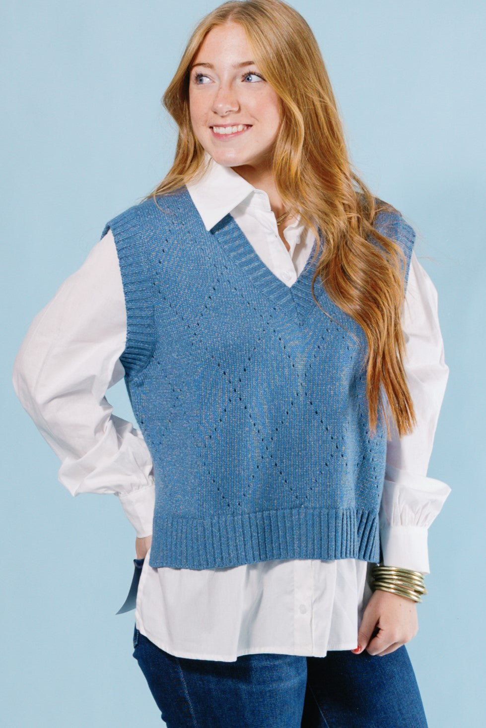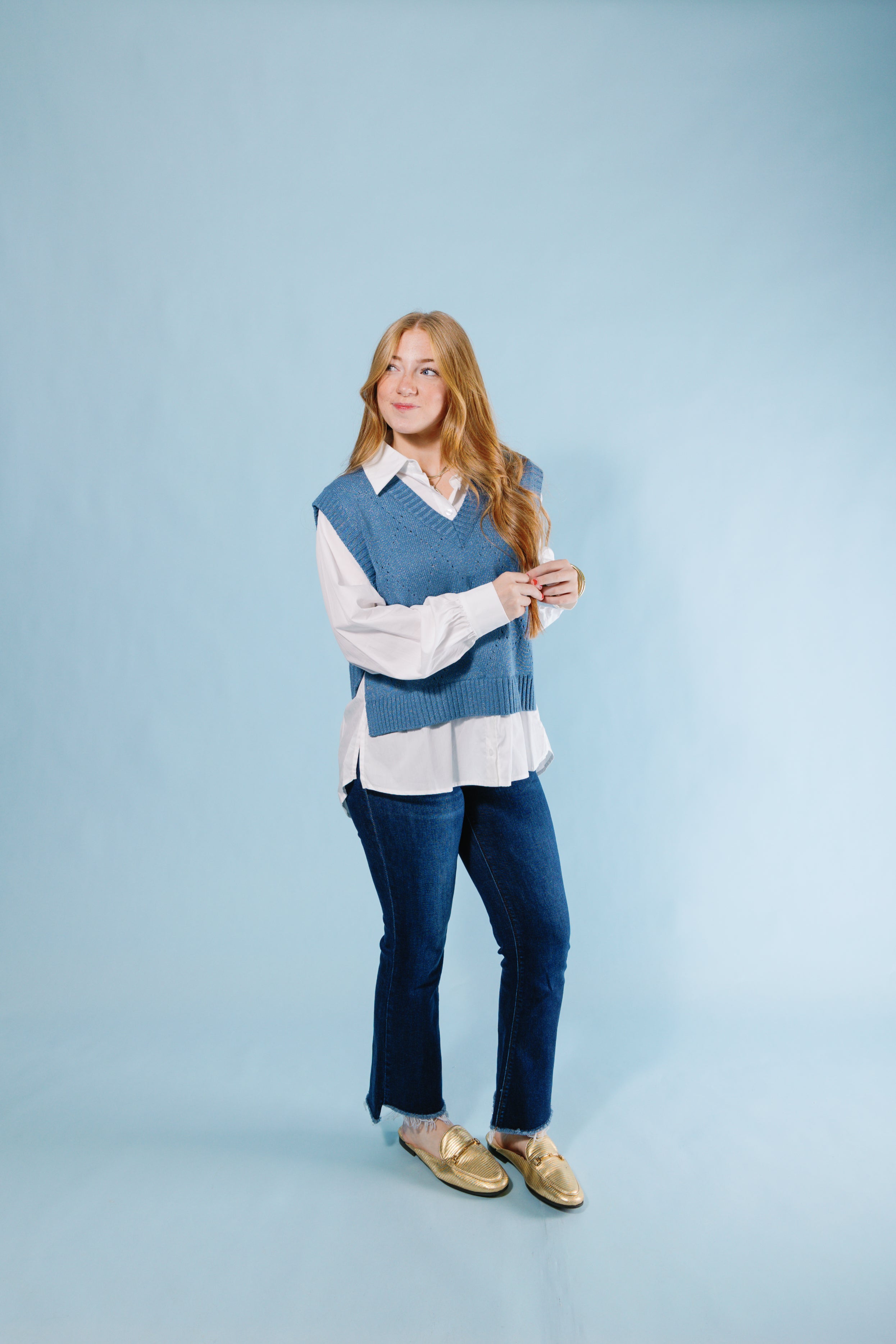 The perfect blend of buttoned-up and laid-back, the Dana Sweater Vest has got you covered. This long sleeve blouse features a crisp white collared neckline and button cuffs, while a connected sweater vest adds a touch of cozy charm. With 2 side slits and a high-low design, it's the ultimate in comfort and style.