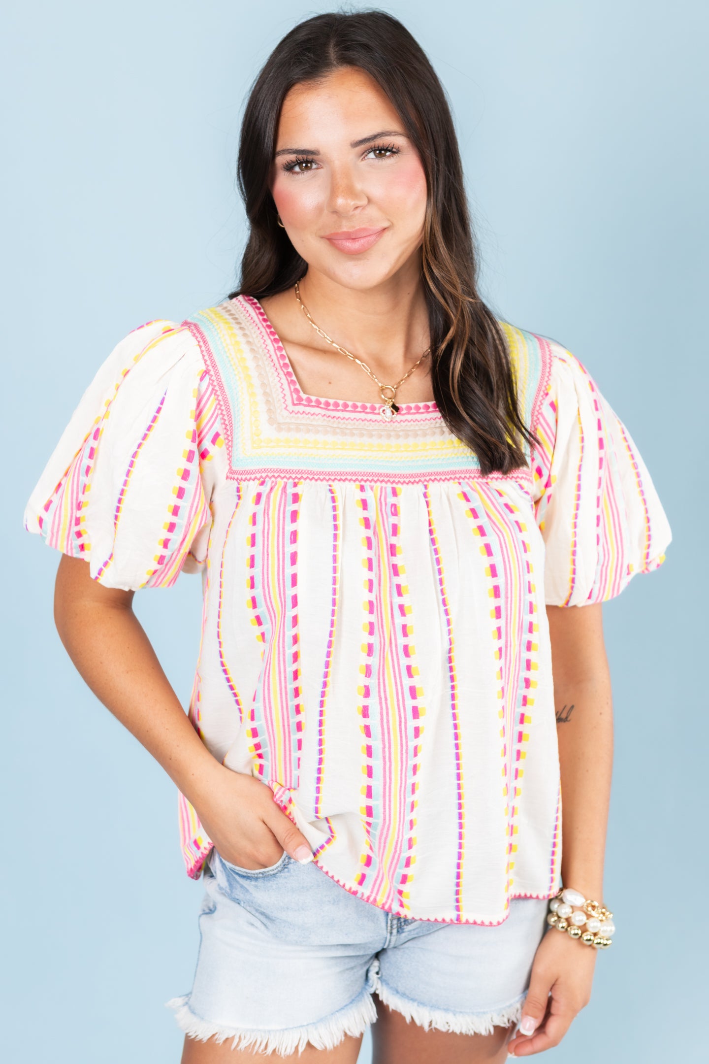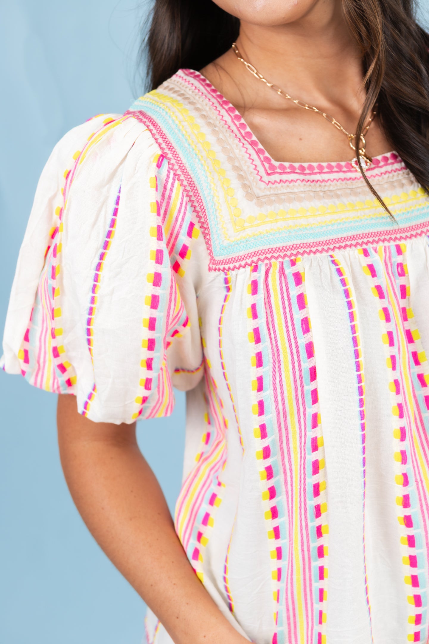 Elevate your wardrobe with The Electric Threads Top, a stunning statement piece featuring eye-catching neon embroidered stitches against a soft cream background. The romantic puff sleeves and flattering square neckline create a silhouette that's both modern and timeless. This versatile blouse will instantly transform any outfit from ordinary to extraordinary.