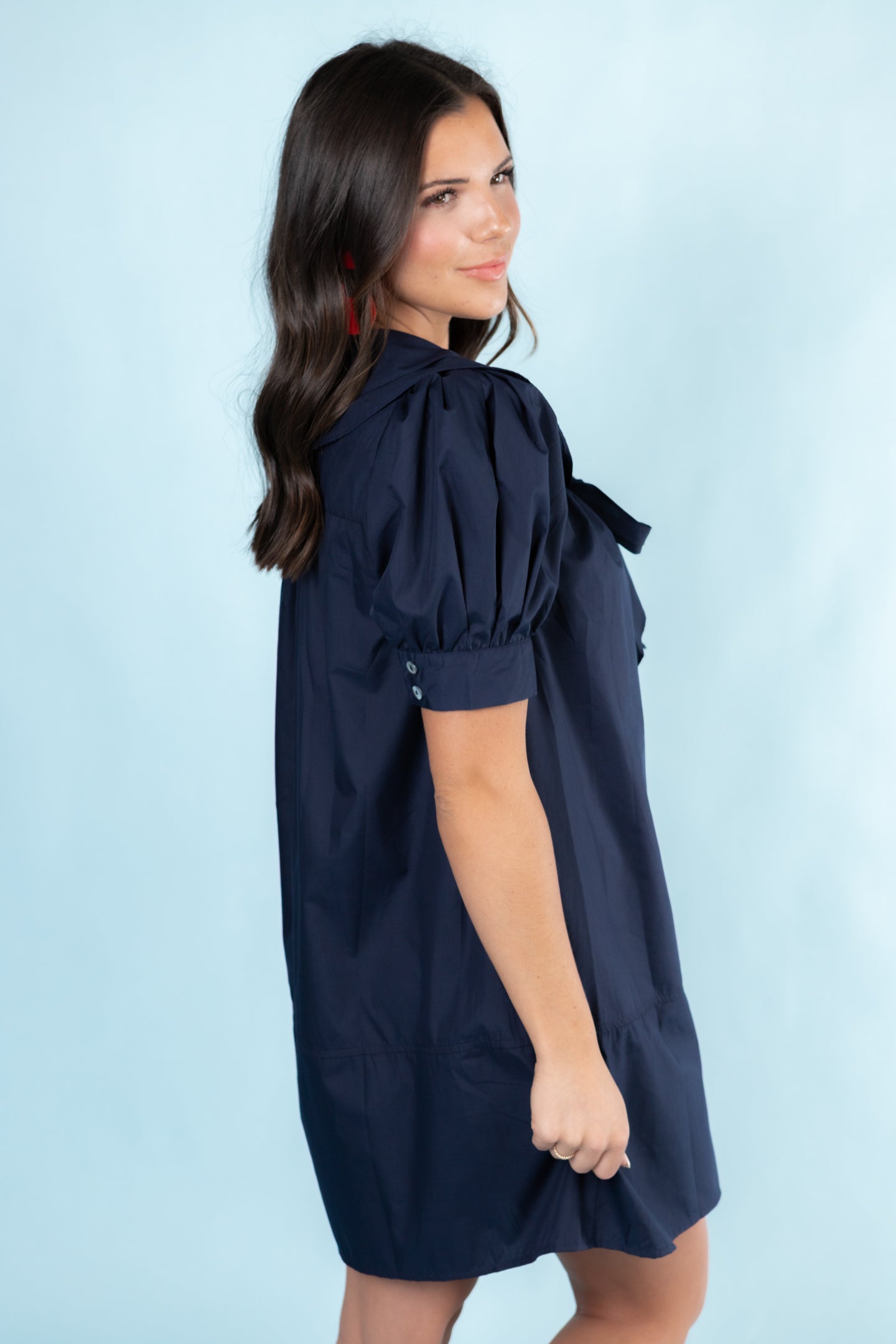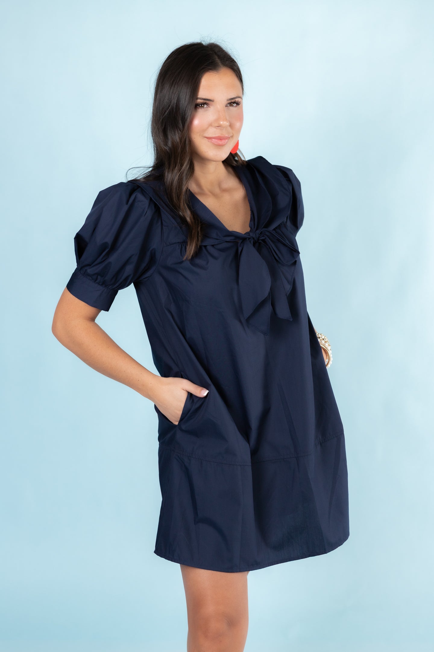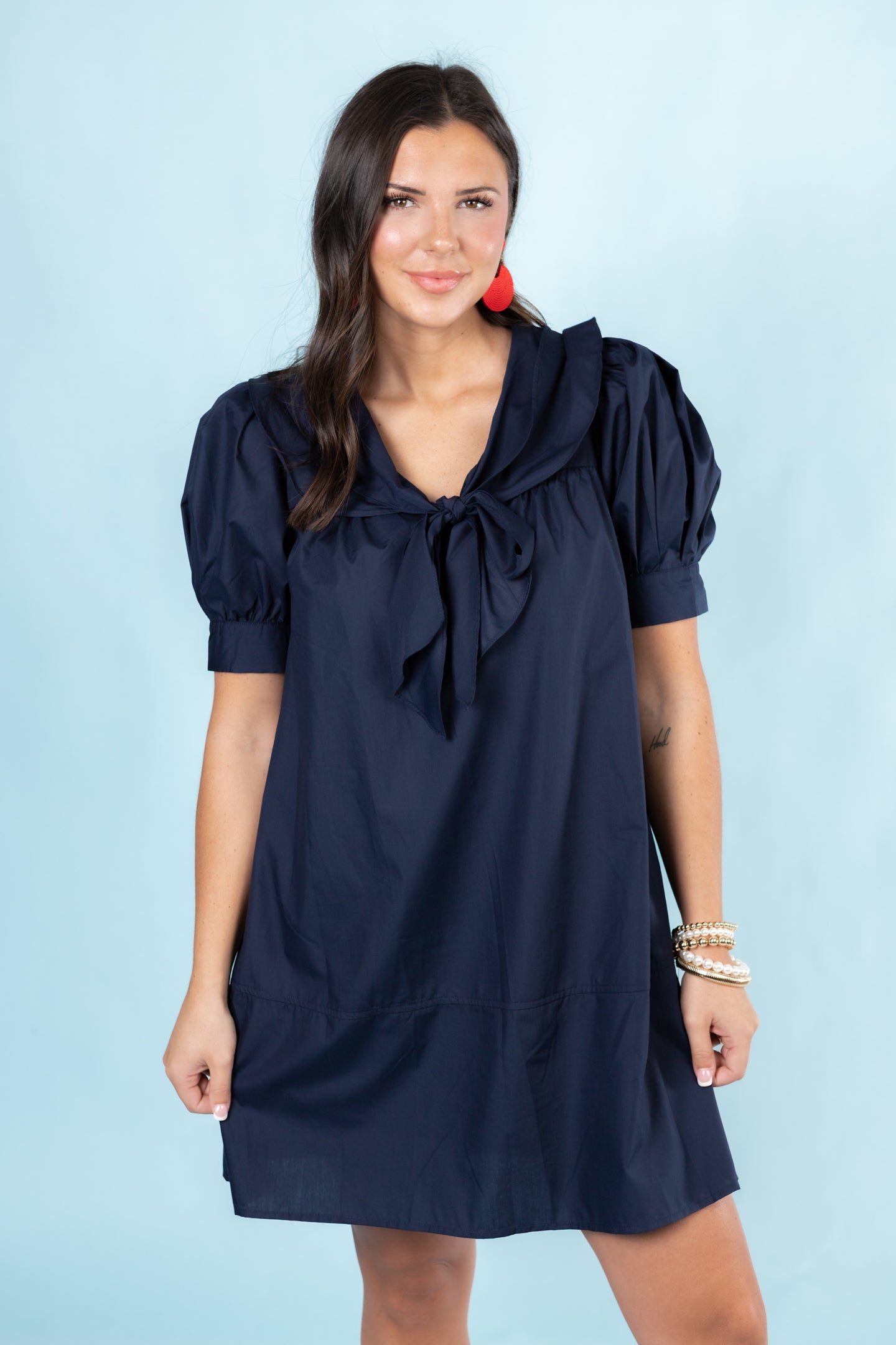 Sail away in style with this playful pullover dress. Stay cool and comfortable with a solid cuff band and lightweight woven fabric. Keep your treasures close with pockets at the side and an added bonus of a lined, non-sheer design. Set sail in fashion with this short puff sleeve dress featuring a classic sailor collar.