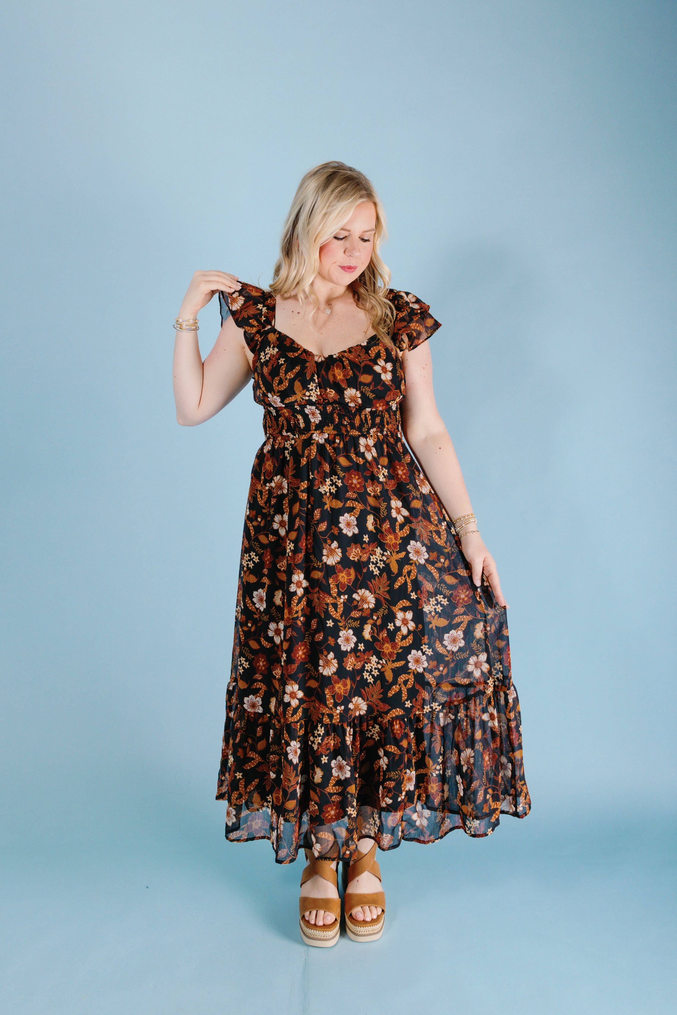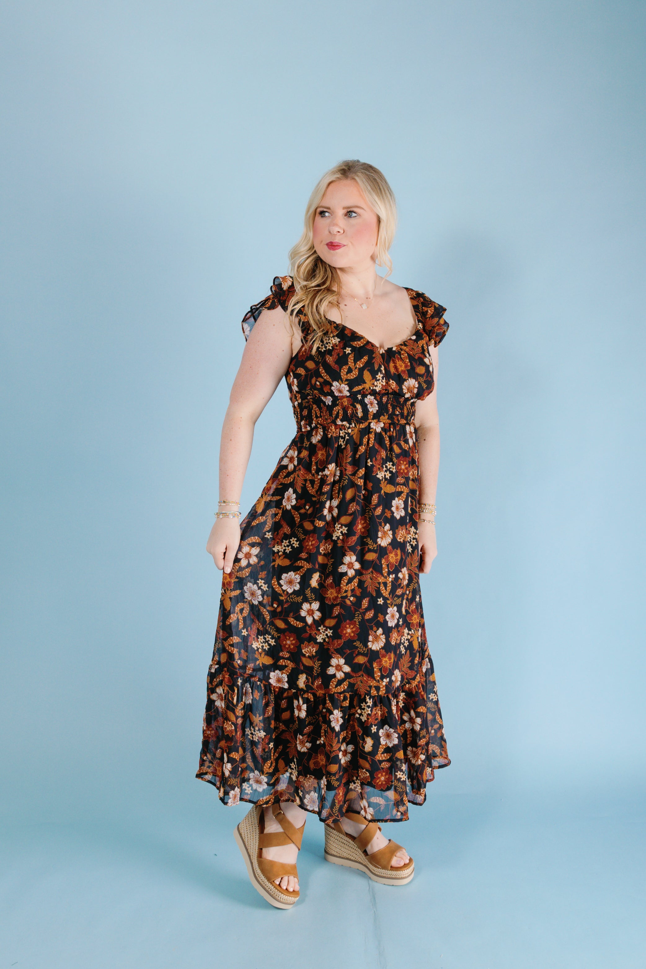Introducing our Fall Florals Midi Dress with a charming sweetheart neckline, ruched bust, and double ruffle sleeves. The smocked underbust and back smocking provide a comfortable fit, while the lined design and floral print add a touch of elegance. Perfect for a playful and stylish look!
