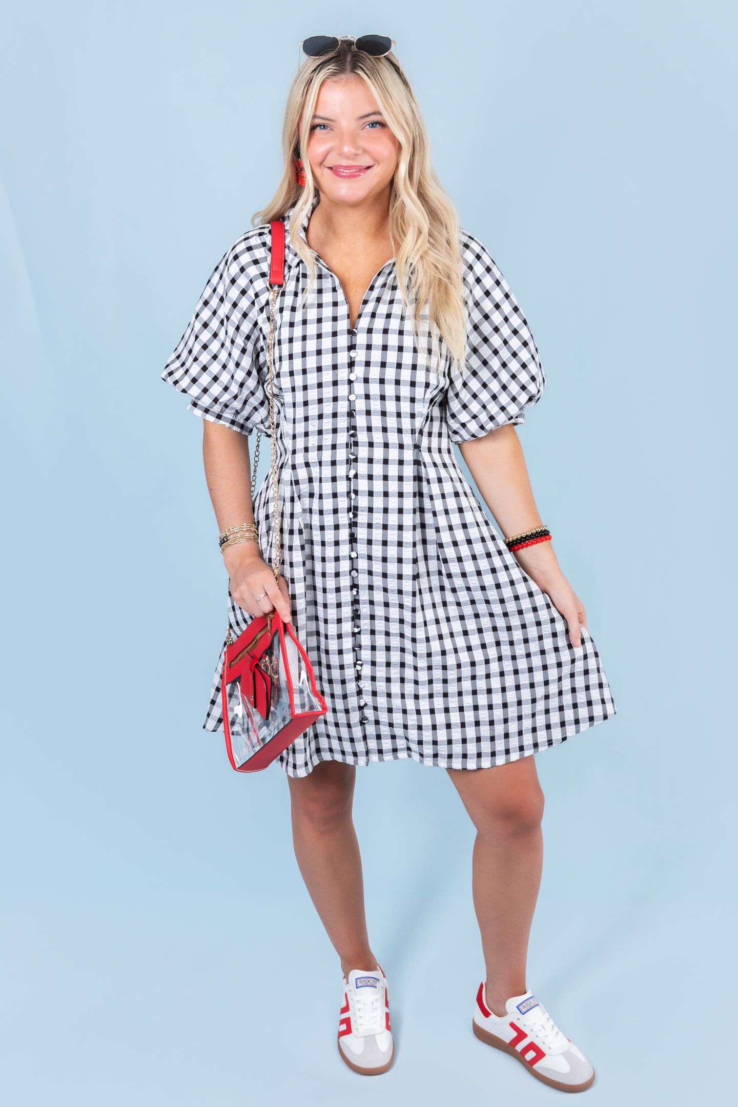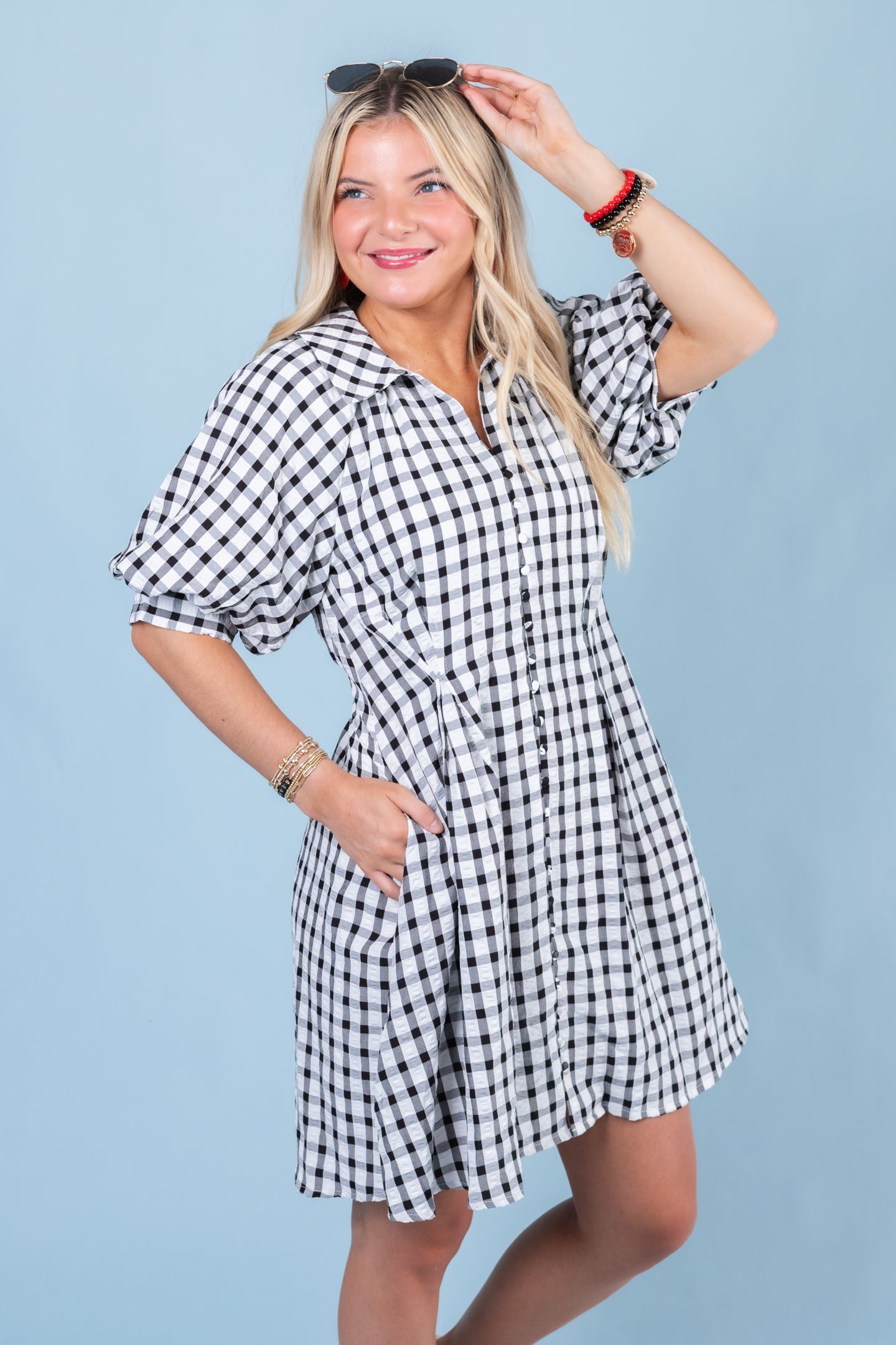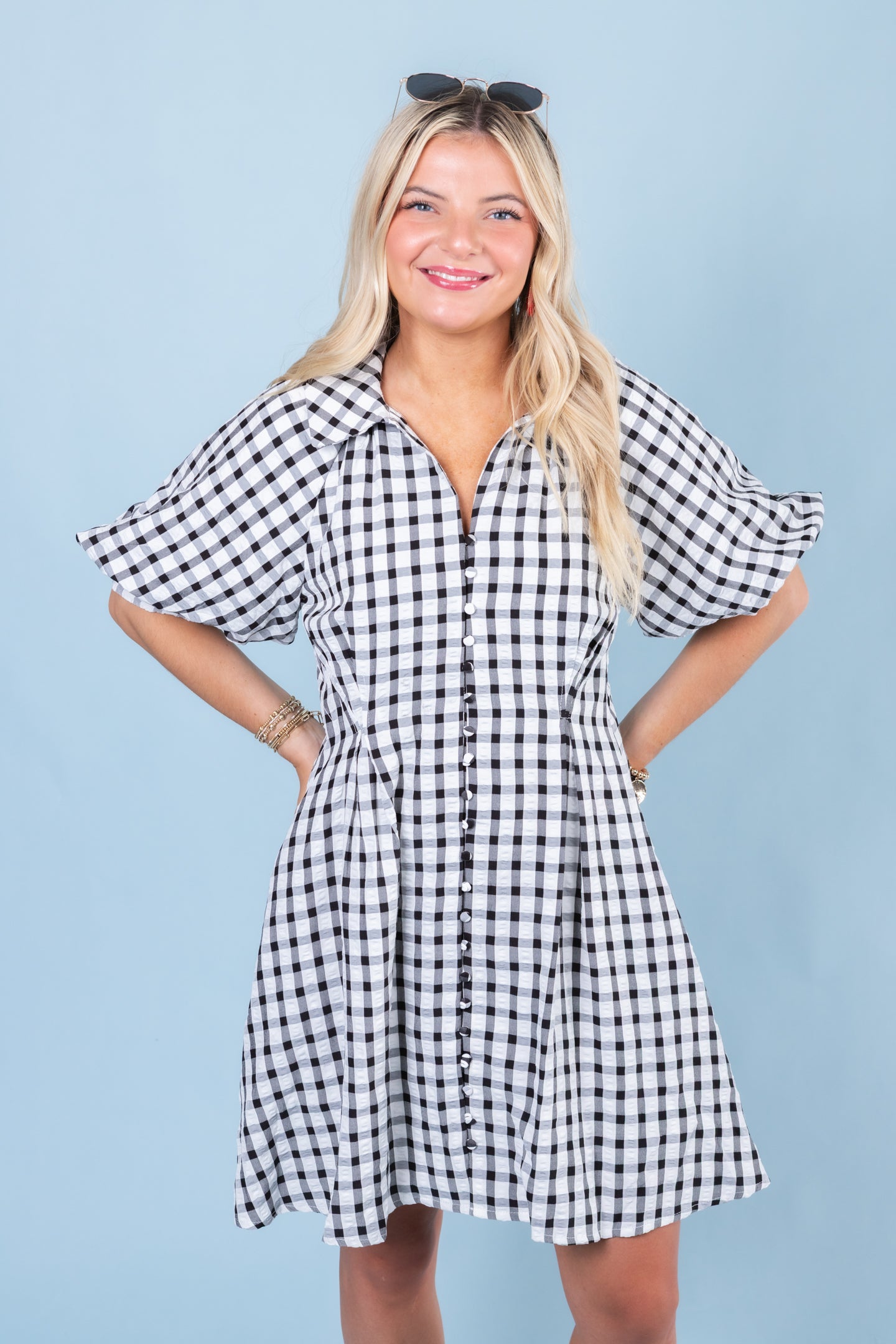 Embrace the charm of our Gingham Mini Dress! The unique cuff band and bubble sleeves add a touch of fun to this fitted waist dress. The pleating detail and button closure enhance the feminine silhouette, while the lightweight, non-sheer fabric keeps you comfortable all day. Perfect for any occasion!