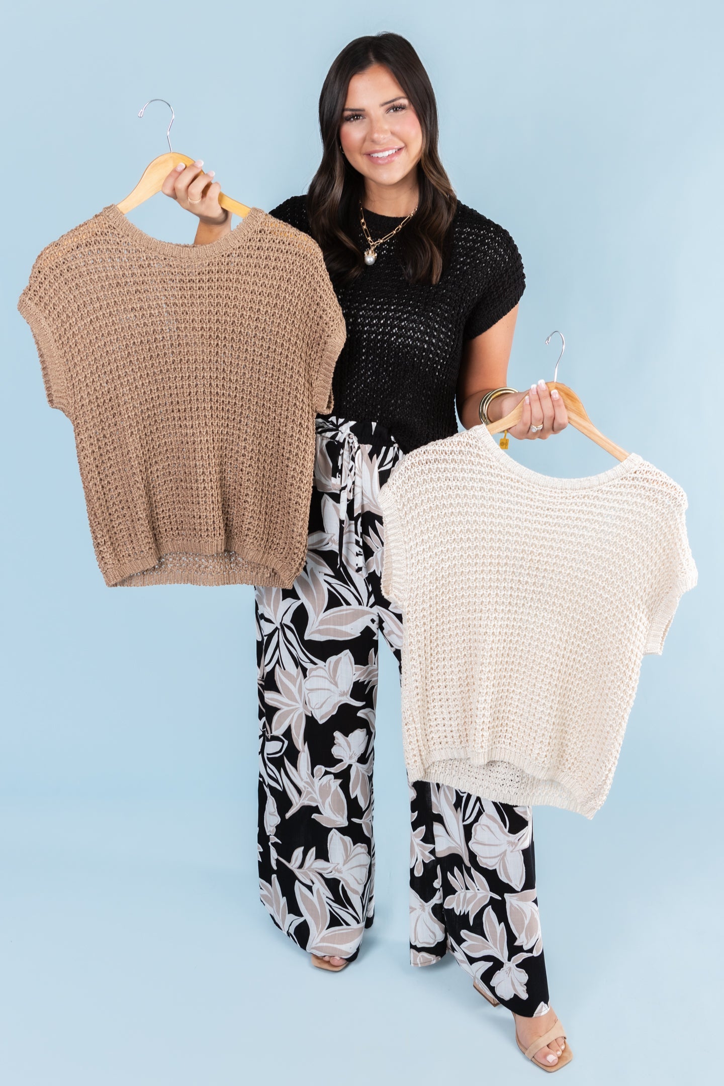 The perfect knit top for laid-back days. Made with a soft, cozy knit fabric, this top is ideal for lounging or running errands. The cap sleeves add a touch of style while keeping you cool and comfortable. (A must-have for any casual wardrobe!)