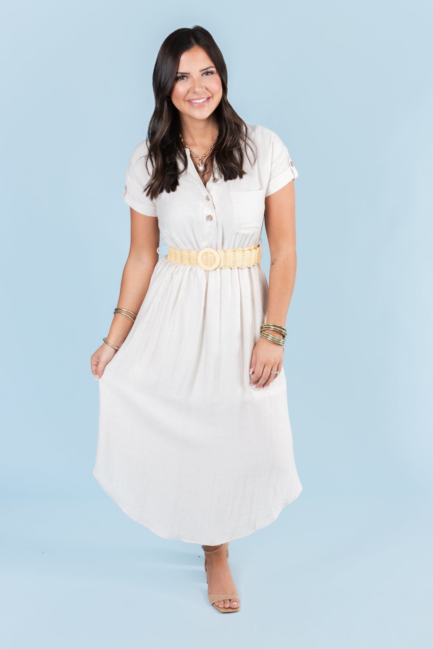 Transform your wardrobe with our HALF BUTTON SHORT SLEEVE BELTED MIDI SHIRT DRESS! Featuring a trendy HENLEY NECKLINE and FUNCTIONAL BUTTONS, this dress is both stylish and functional. Effortlessly accentuate your figure with the included BELT. Upgrade your look today!