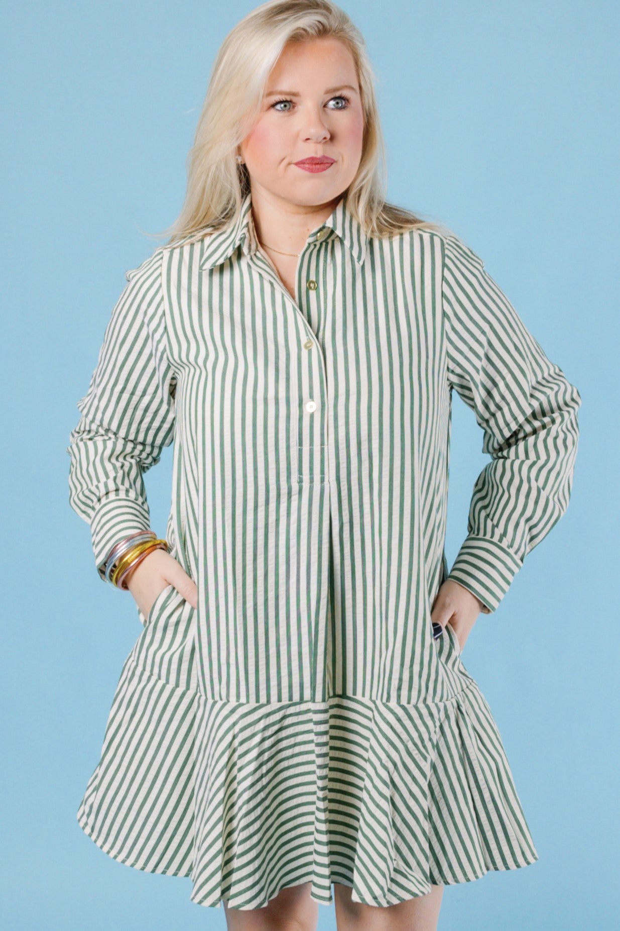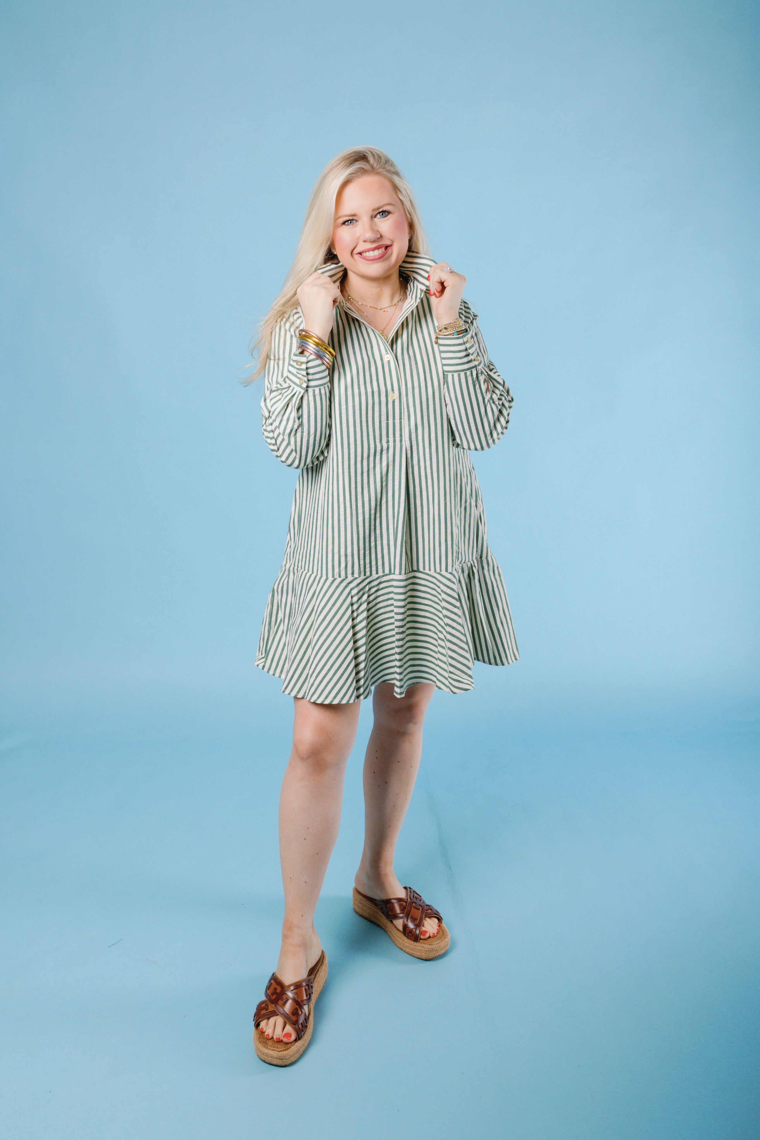 Get ready to turn heads in The Autumn Green Mini Dress! With its playful striped design and flirty drop waist silhouette, this dress is perfect for any occasion. The addition of pockets make it both stylish and practical. And don't worry about transparency, this lightweight dress is fully lined for your peace of mind. So go ahead, button up and slay the day!