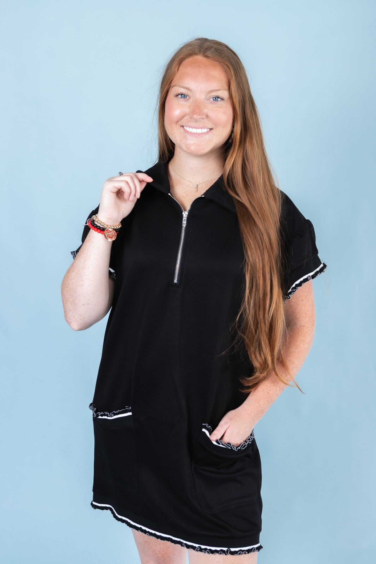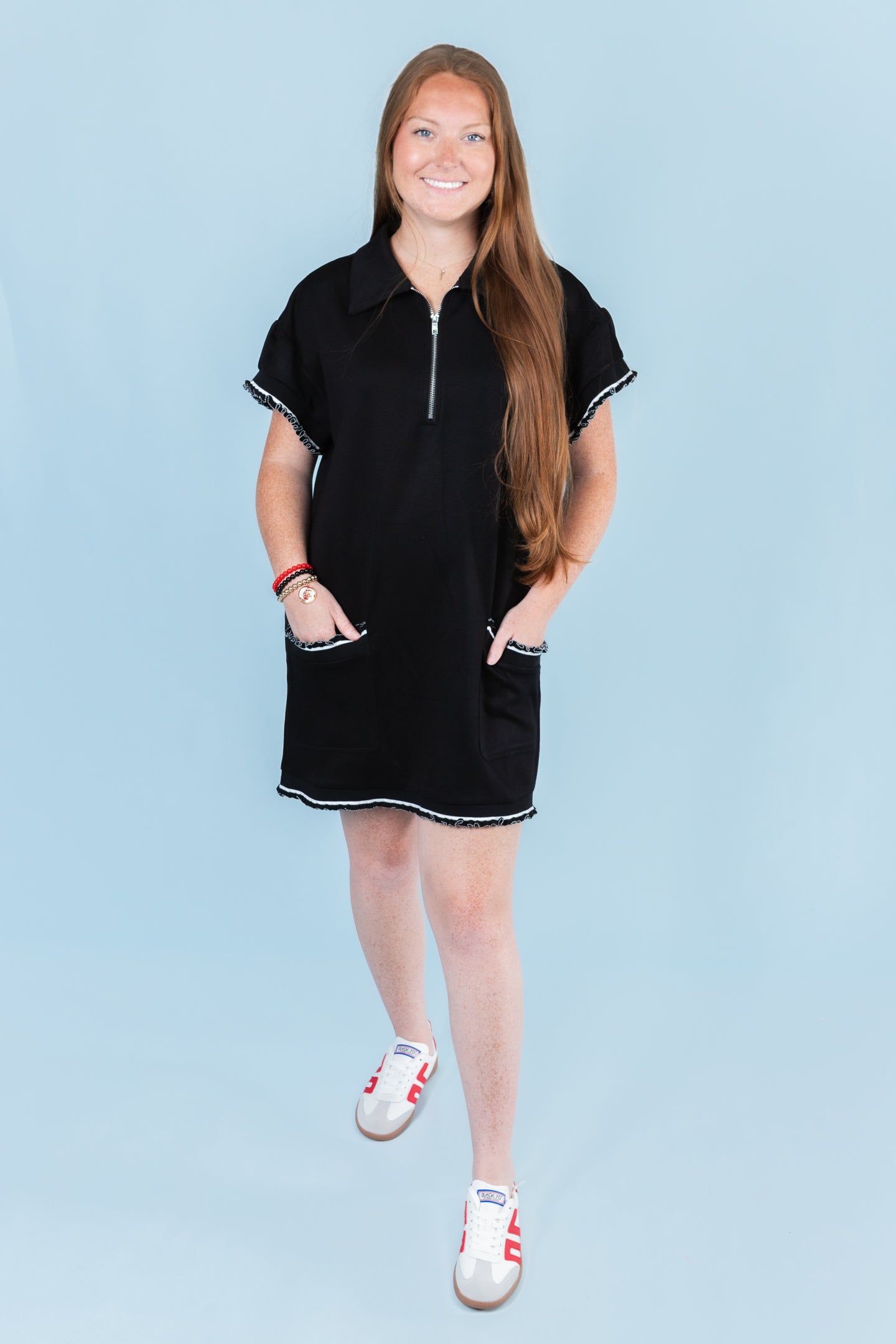 The Jazzy Polo Dress offers effortless style with its casual half-zip polo collar and relaxed fit. Perfect for everyday wear, this zip-up dress combines comfort and a sporty edge, making it an ideal choice for a laid-back yet polished look.