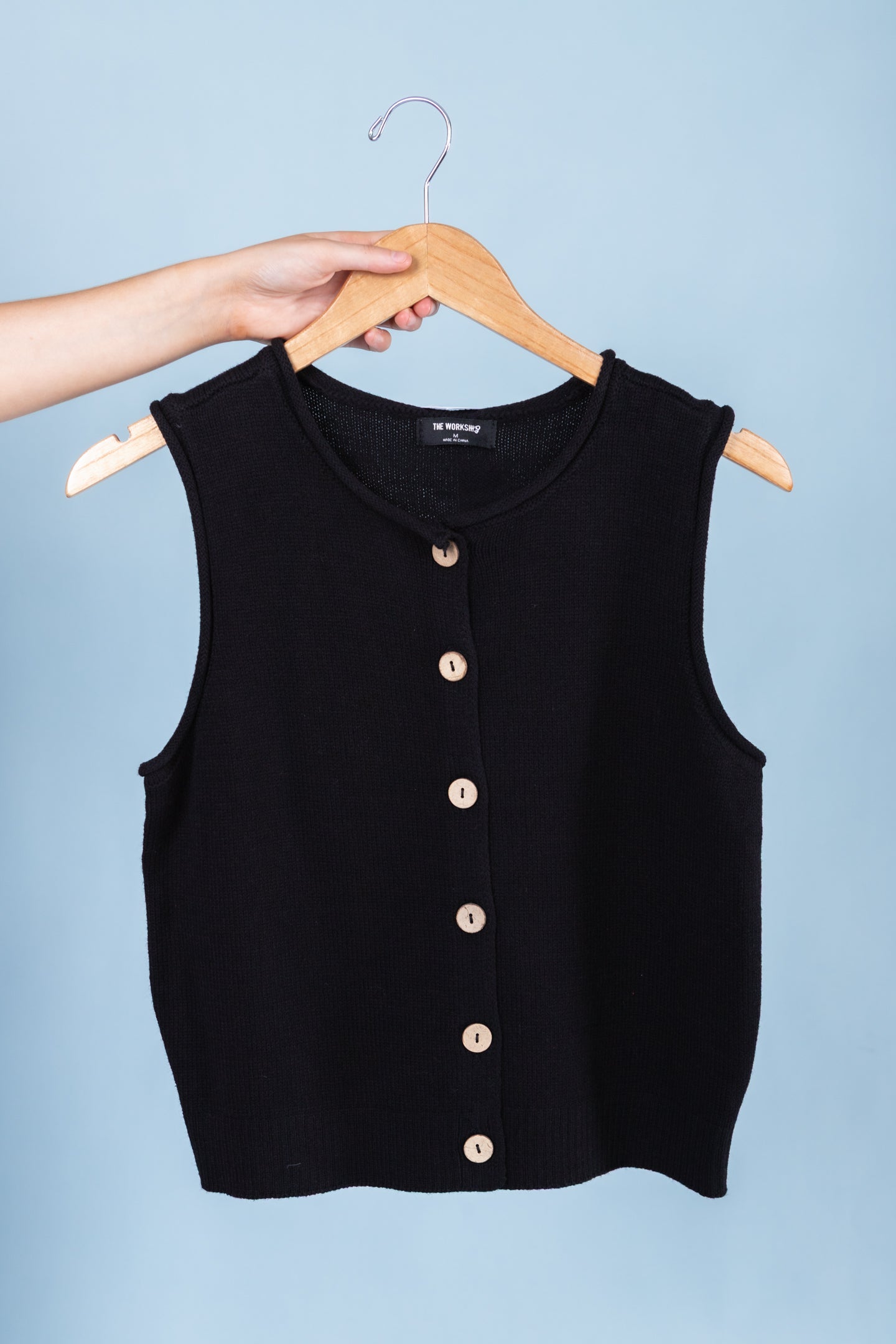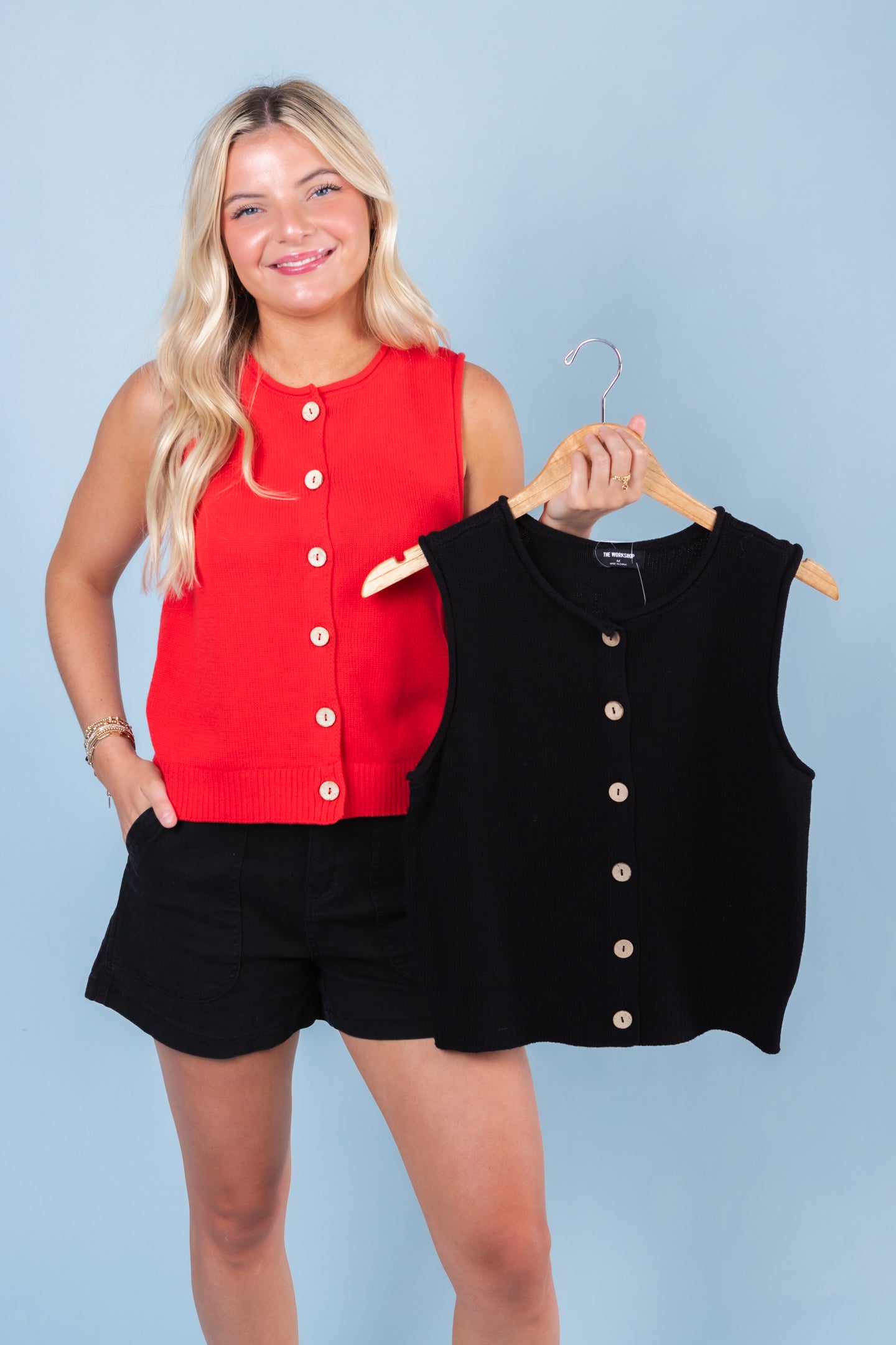 This versatile and stylish top features a round neckline and sleeveless design, perfect for any occasion. Its button-down feature adds a touch of sophistication, making it a must-have in your wardrobe. Look and feel confident and chic with this top!