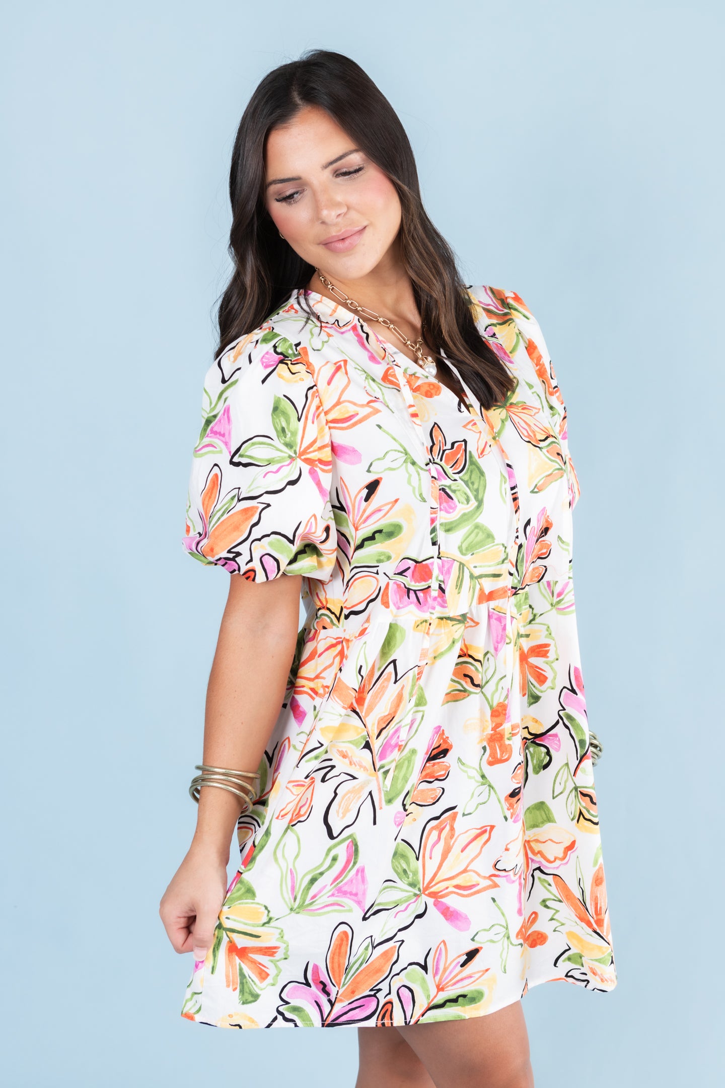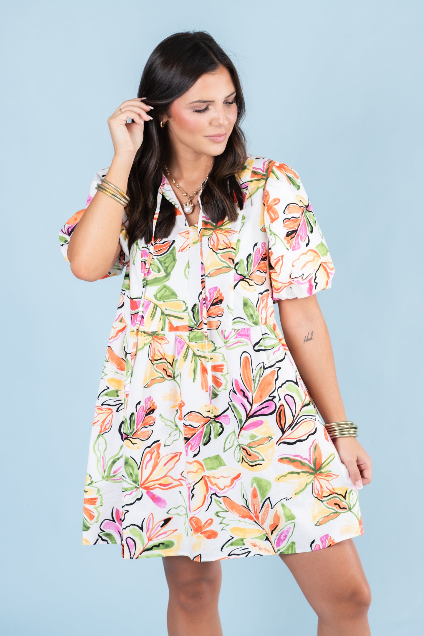 Indulge in springtime with The Maggie Floral Printed Mini Dress. Made of soft and breathable cotton poplin, this dress features a playful floral print, short bubble sleeves with cinched ends, a V-cut neckline with a front tie closure, and side pockets for convenience. The ruched bottom adds a touch of chic to the relaxed and loose fit.