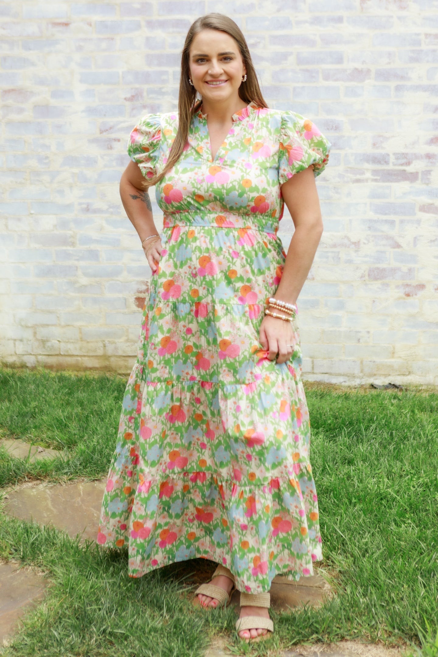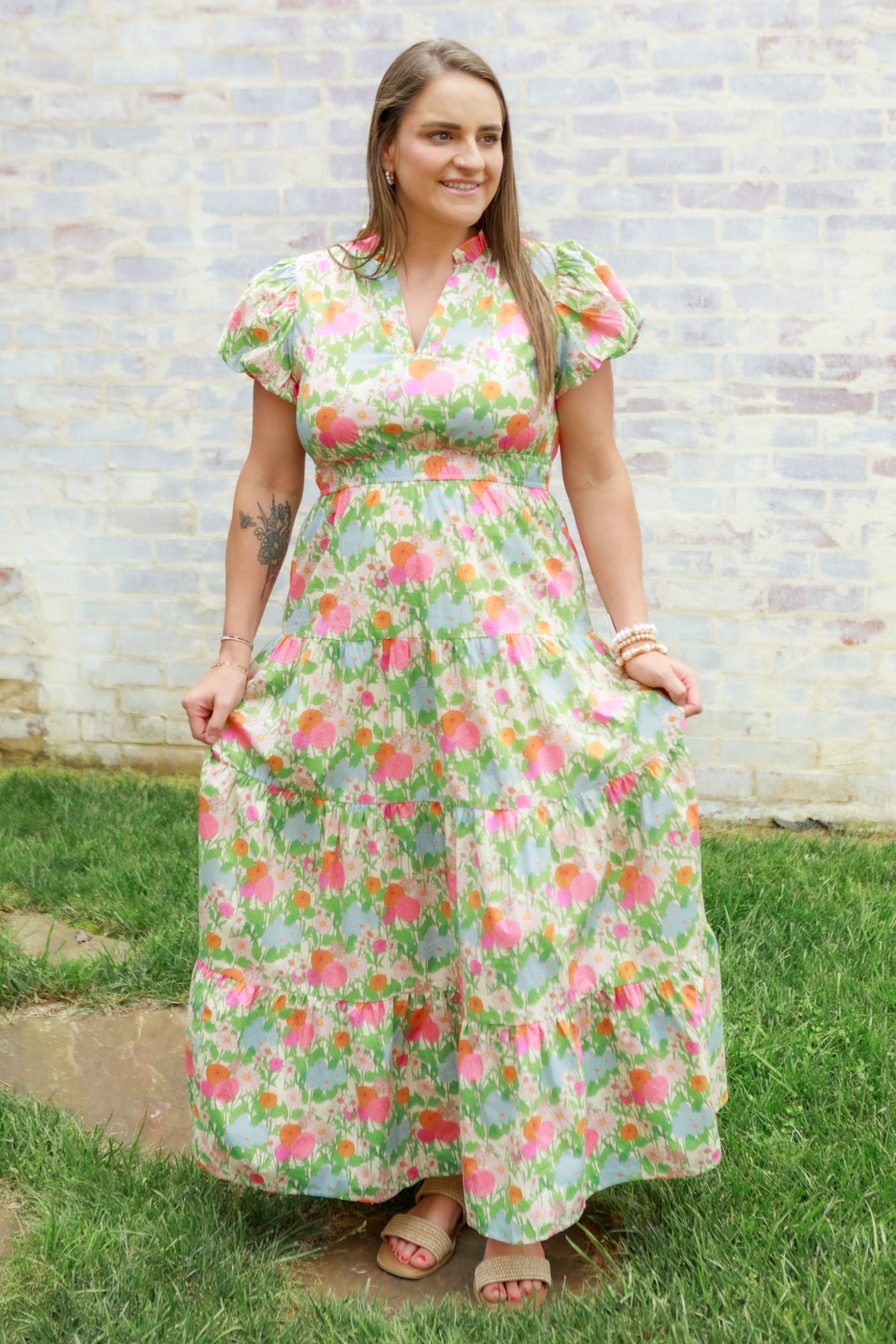 Elevate your style with the In Her Grace Maxi Dress - a floral print pullover that boasts short bubble puff sleeves, a double elastic waist, and practical side pockets. Its tiered design and lightweight woven fabric create a flattering silhouette that's both stylish and comfortable. Perfect for any occasion!