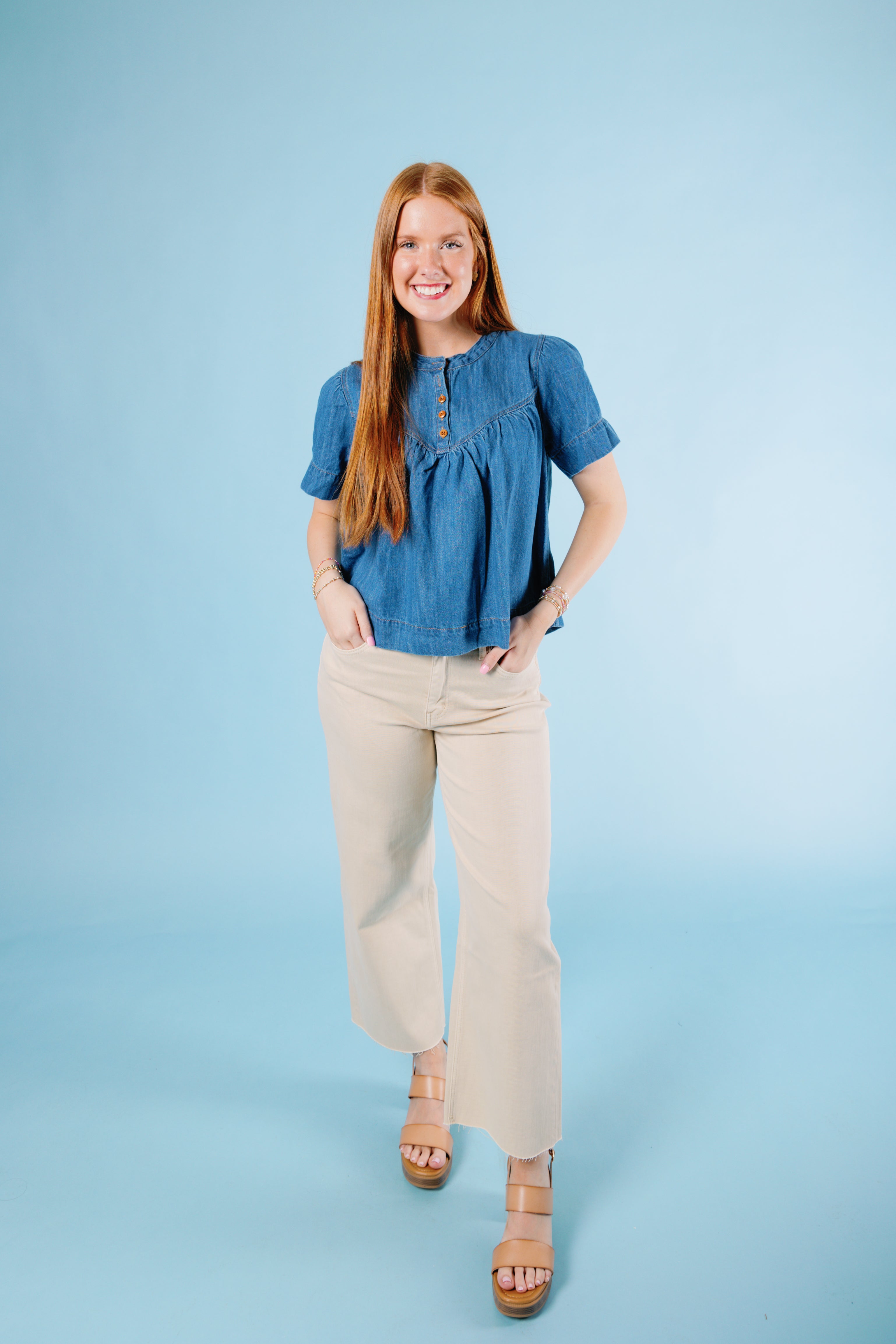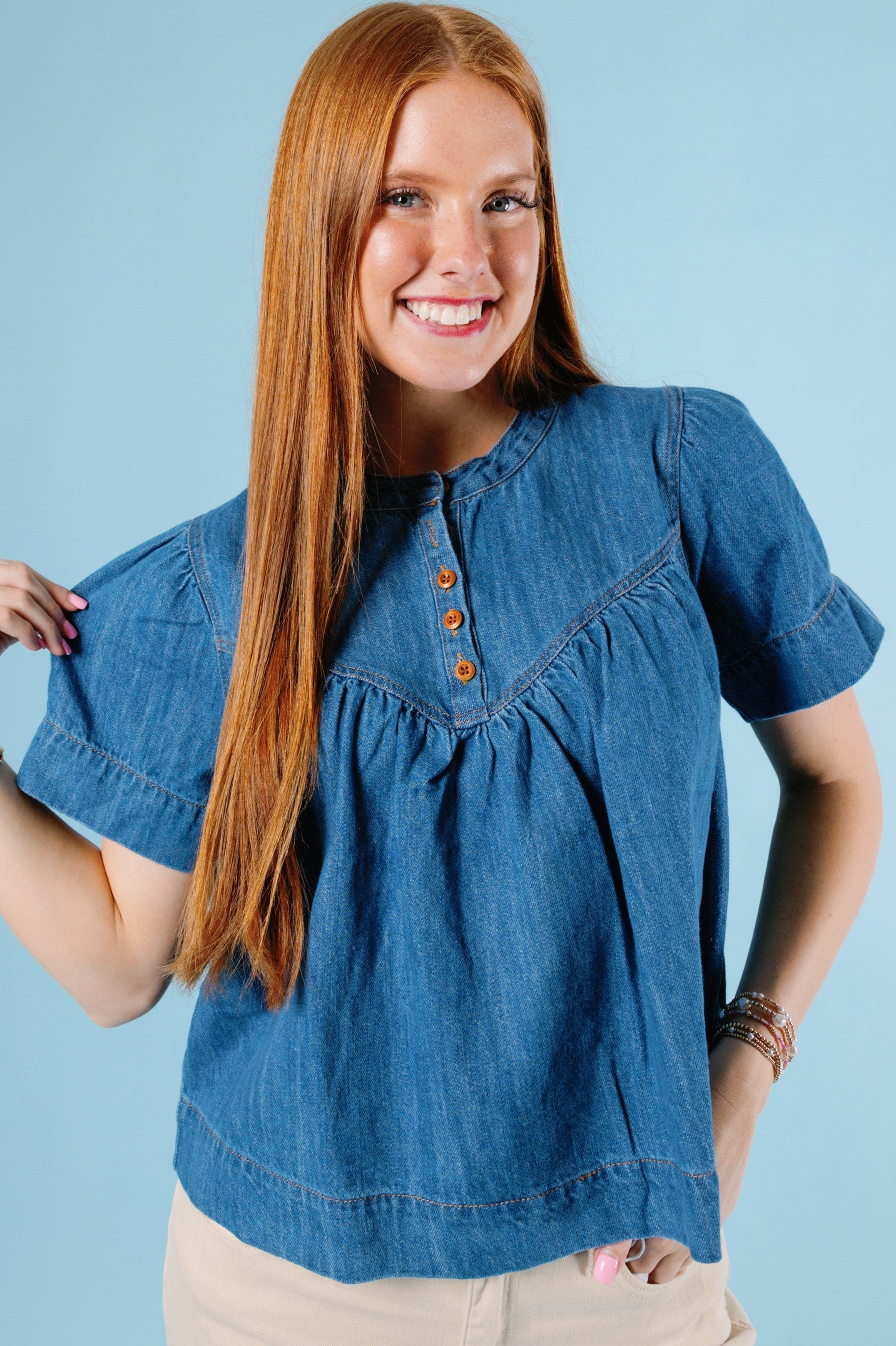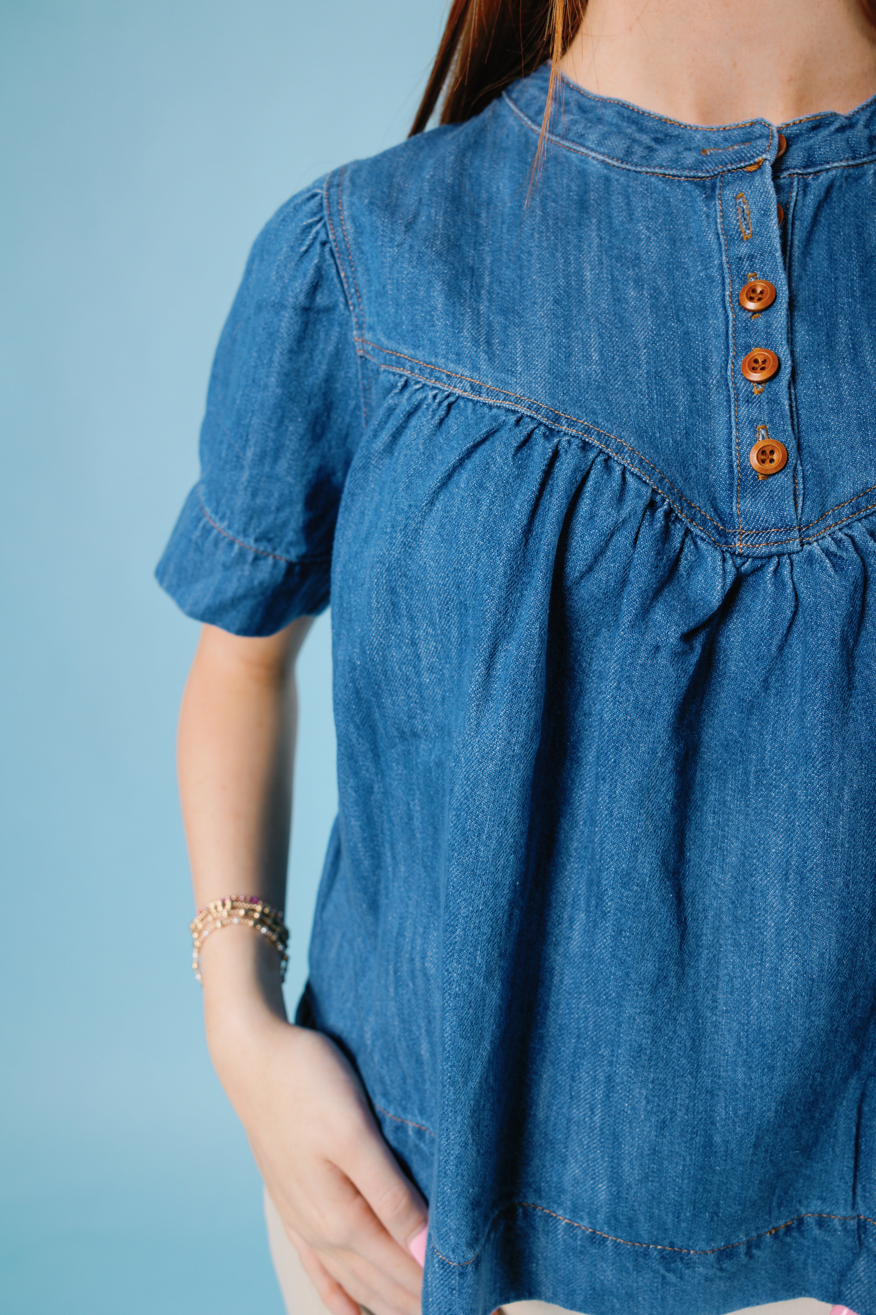 Introducing the Mountain High Blouse - a playful twist on your classic blouse. With mineral washed fabric, a half button down front, and pinching and seams for added detail, this blouse is perfect for any occasion. The rounded neckline and slight boxy fit add a touch of quirkiness to your wardrobe.