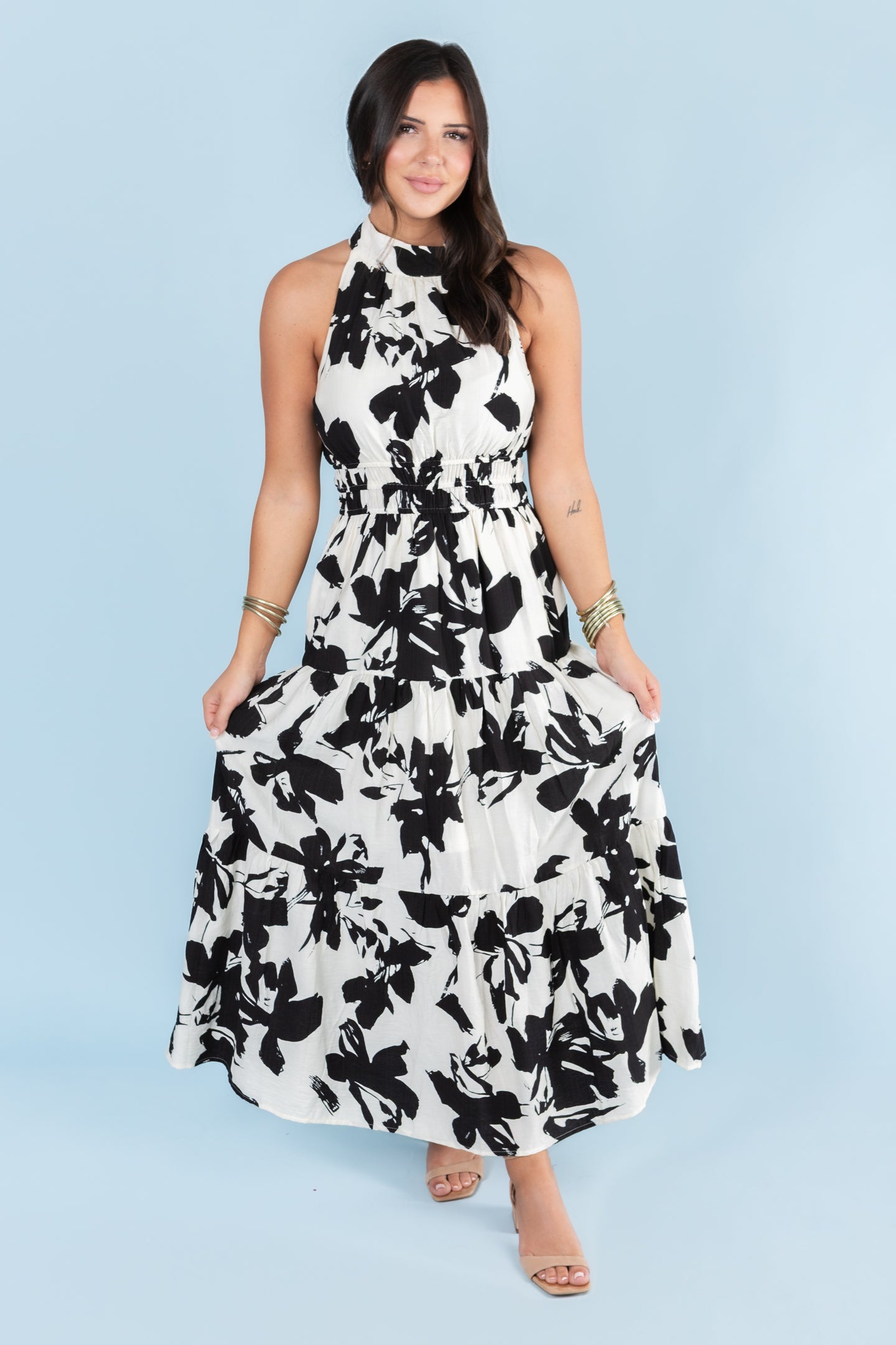 Elevate your evening look with The Night Out Midi Dress! Featuring a high neck and tie neck design, this sleeveless dress accentuates your figure with a smocked waist. Feel confident and chic all night long!