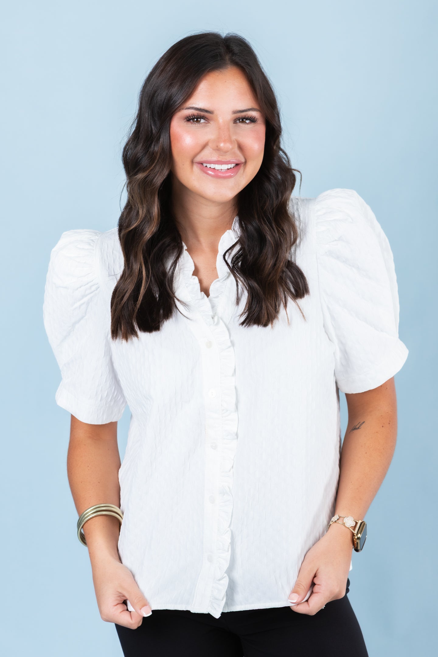Experience effortless elegance with The Pamela Blouse. Made from a solid textured material, this top features short pleated sleeves and a ruffle accented v-neckline for a touch of femininity. The button front closure adds a classic touch while the lightweight, non-sheer fabric keeps you comfortable all day. Perfect for any occasion, this versatile blouse will be a staple in your wardrobe.
